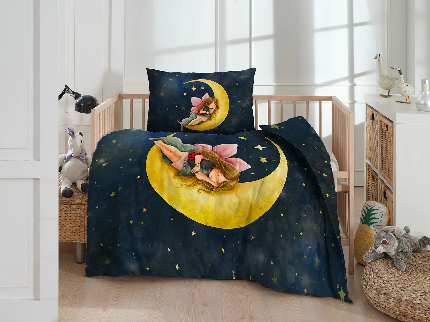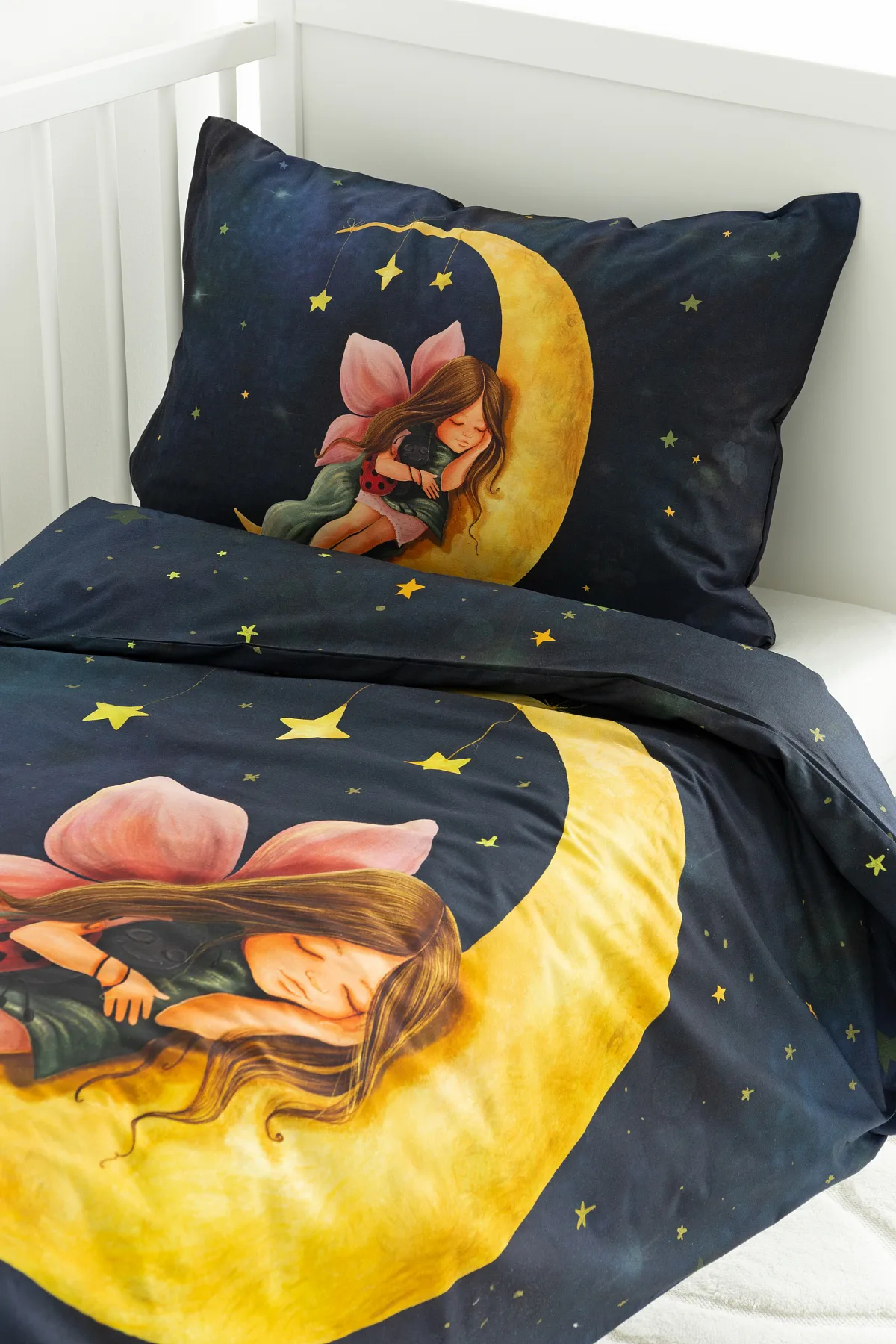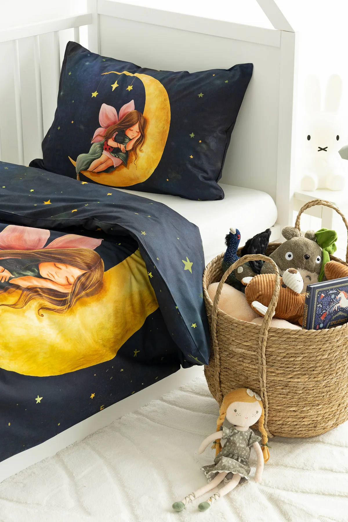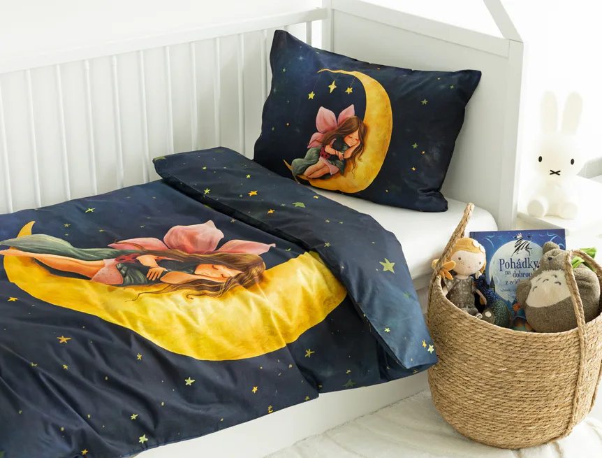 Proměňte dětský pokojíček v kouzelnou říši s bavlněným povlečením Malá víla. Motiv víly spící na měsíci, obklopené hvězdnou oblohou, vnese do dětského pokoje magickou atmosféru. Povlečení je vyrobeno ze 100% prémiové bavlny v úpravě DELUXE, která je jemná na dotek a prodyšná.