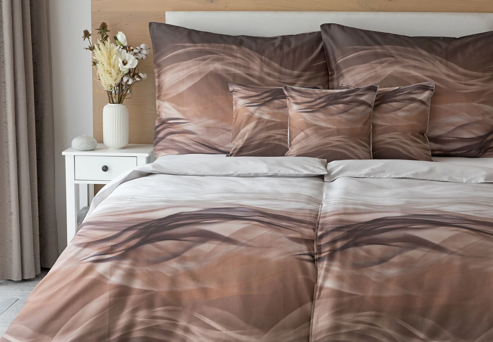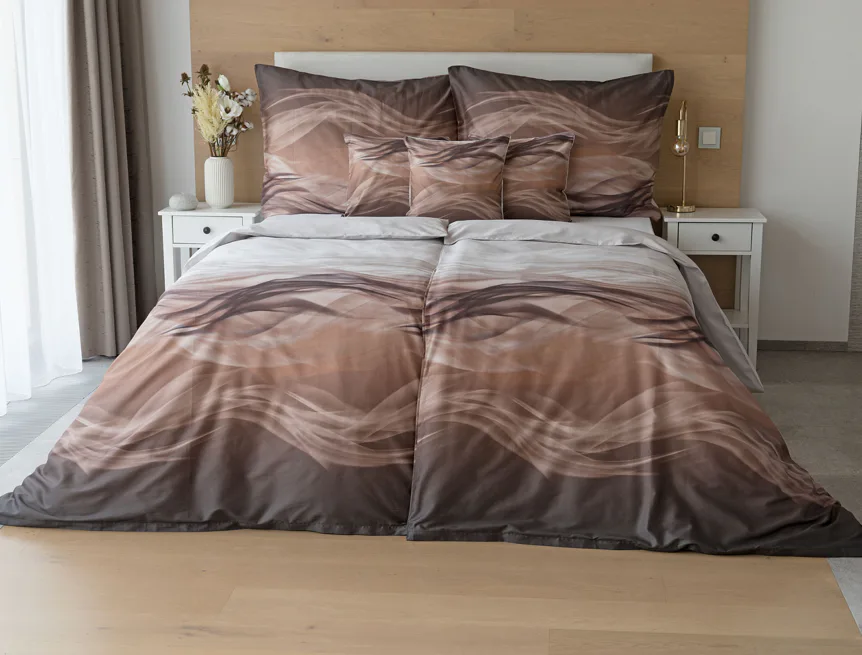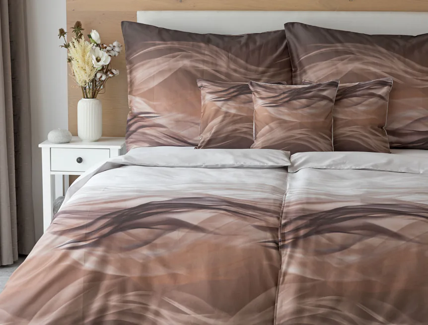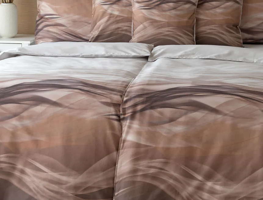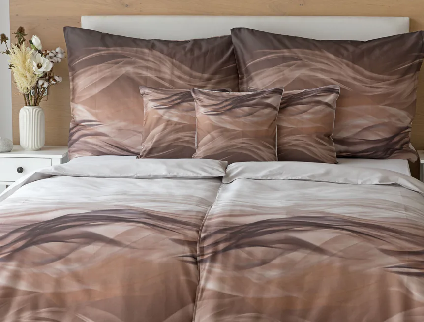 Nechte se unášet na vlnách hřejivé harmonie s ložním povlečením Marni Brown. Abstraktní motiv kombinuje oblíbenou paletu přírodních béžových a hnědých tónů, které navodí v ložnici útulnou atmosféru. Eleganci podtrhuje jemný lesk bavlněného saténu, který je pro tento vzor jako stvořený.