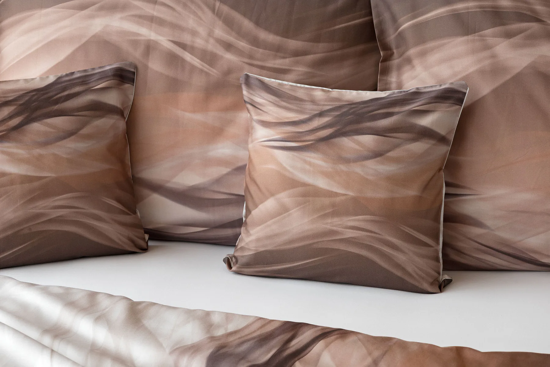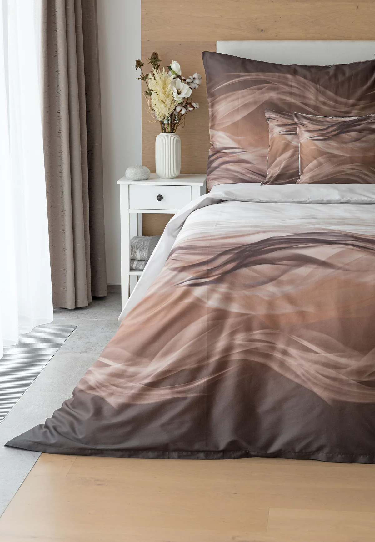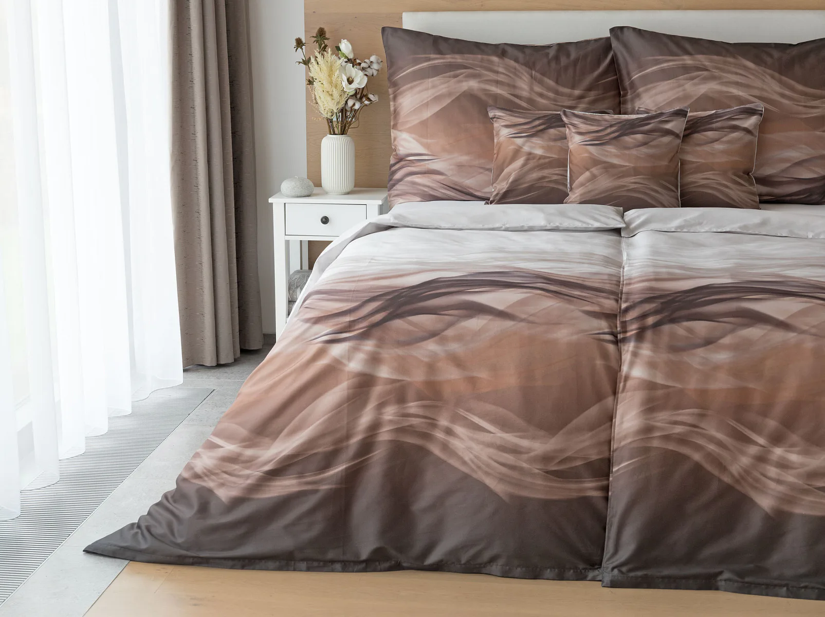 Nechte se unášet na vlnách hřejivé harmonie s ložním povlečením Marni Brown. Abstraktní motiv kombinuje oblíbenou paletu přírodních béžových a hnědých tónů, které navodí v ložnici útulnou atmosféru. Eleganci podtrhuje jemný lesk bavlněného saténu, který je pro tento vzor jako stvořený.