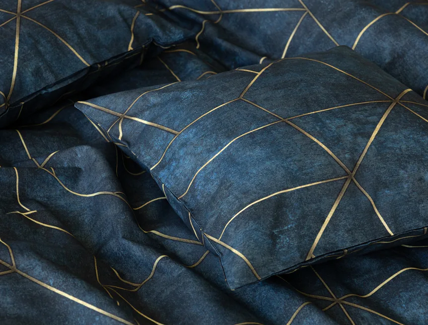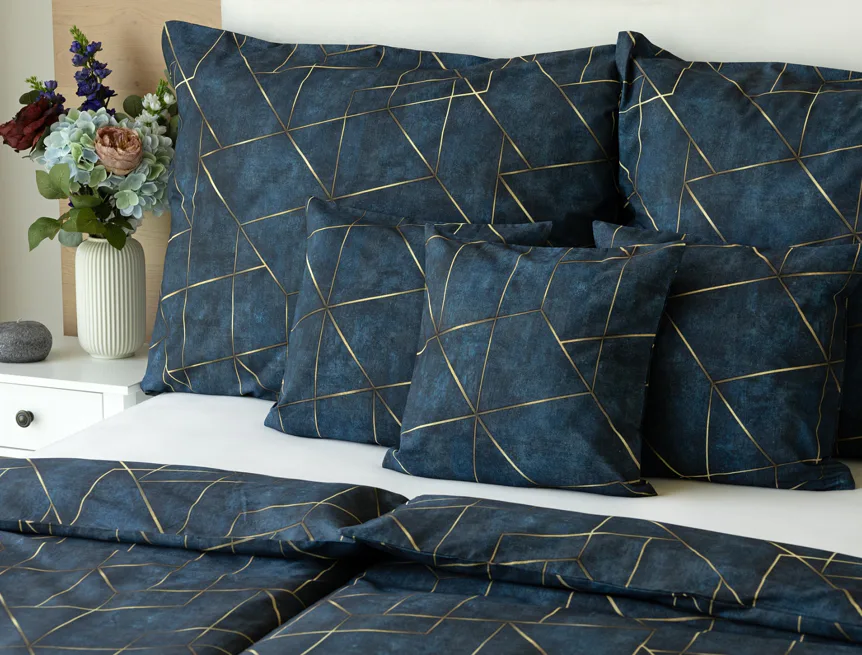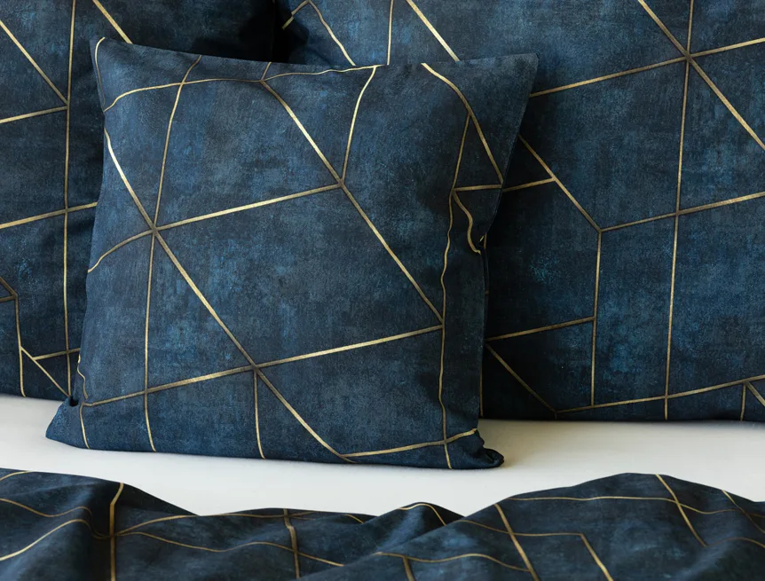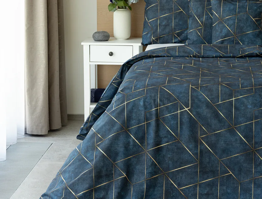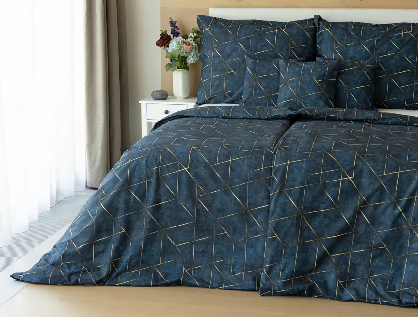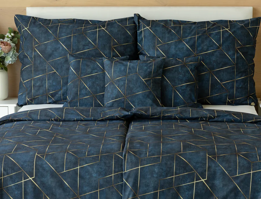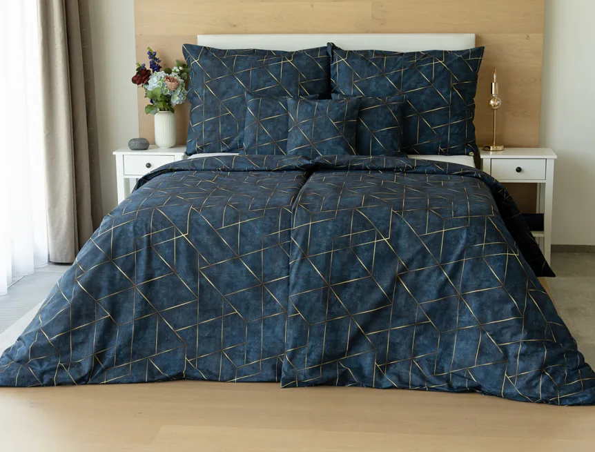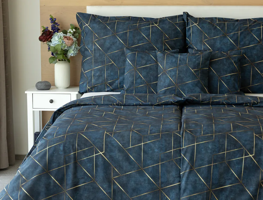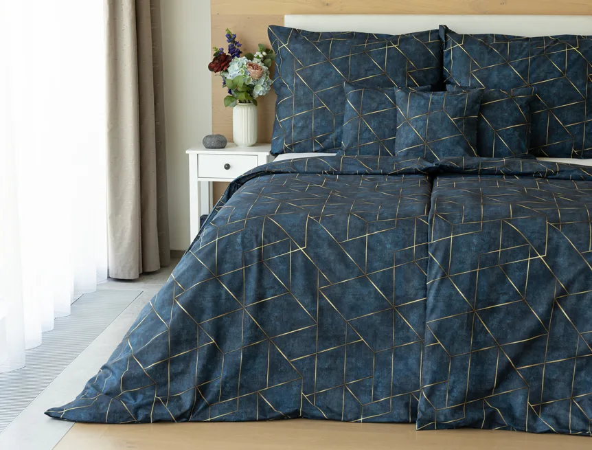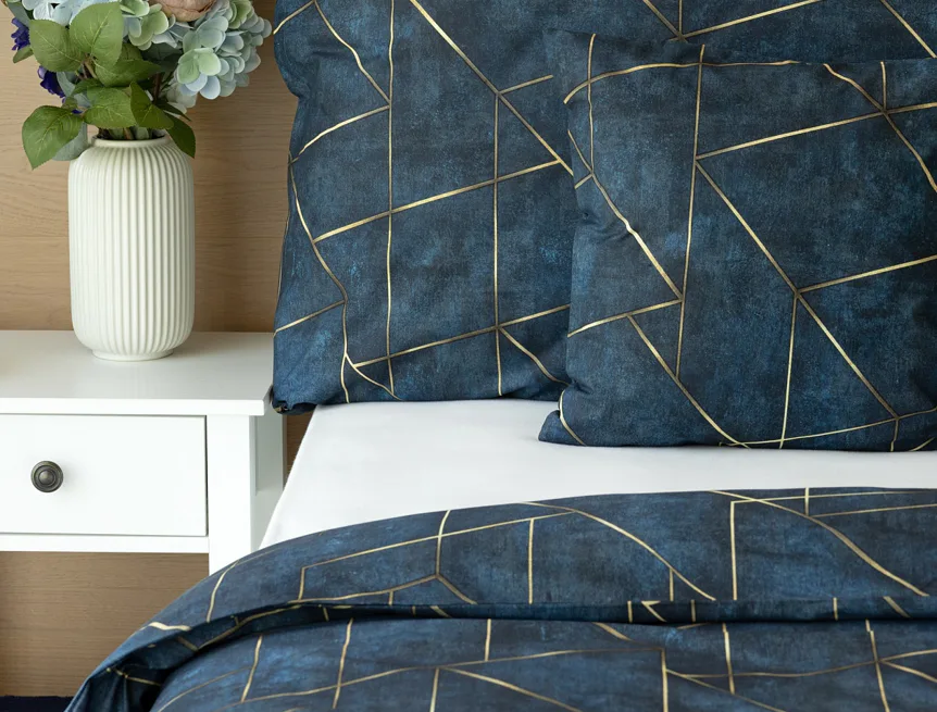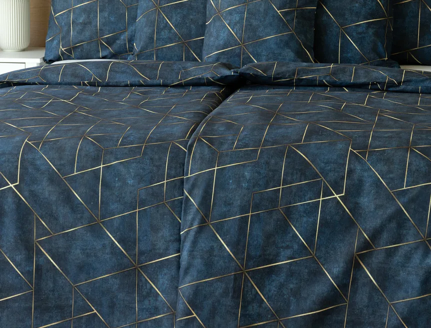 Dopřejte své ložnici dokonale elegantní vzhled s bavlněným ložním povlečením Matis. Vzor, který je jako stvořený do světlého minimalistického interiéru, si jednoduše zamilujete. Podklad v barvě noční oblohy zdobí po celé ploše pískově zlatavý geometrický vzor. Barevné přechody v podkladu i v geometrické linii podtrhují plastický vzhled vzoru. Díky nejmodernějšímu digitálnímu tisku vyniká motiv v precizním detailu.