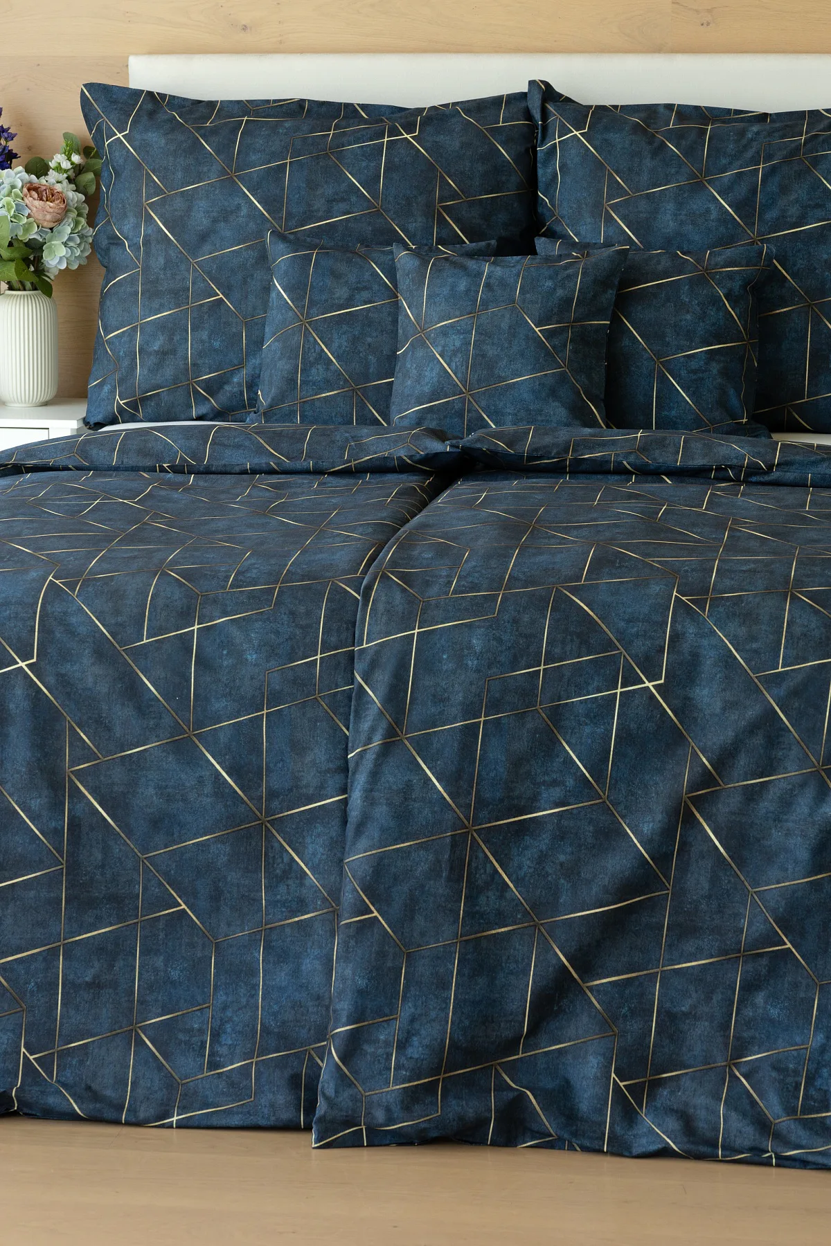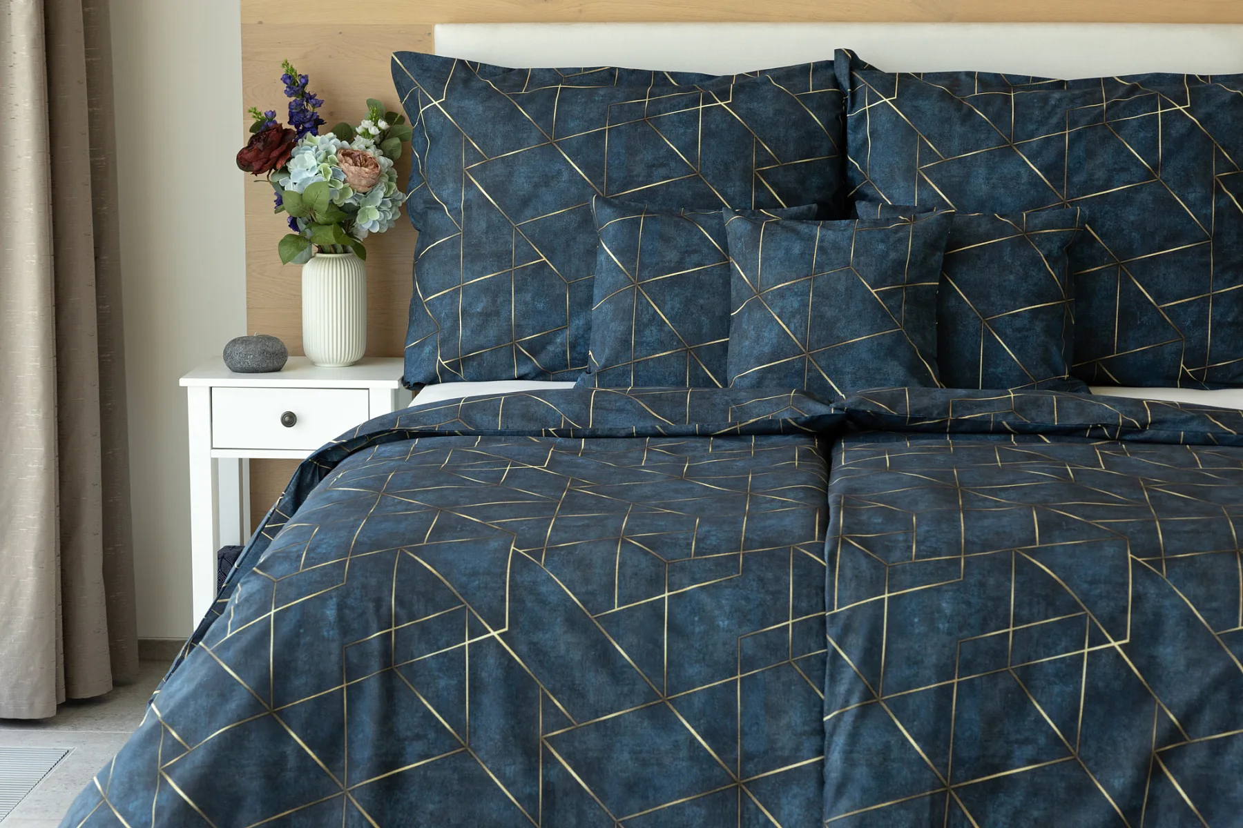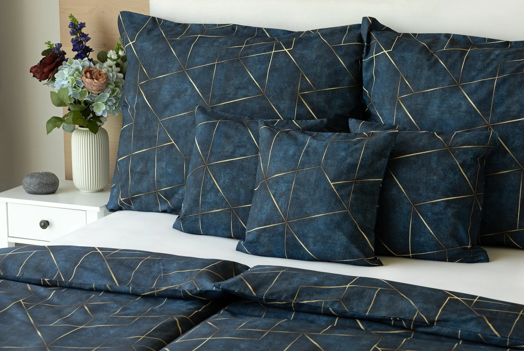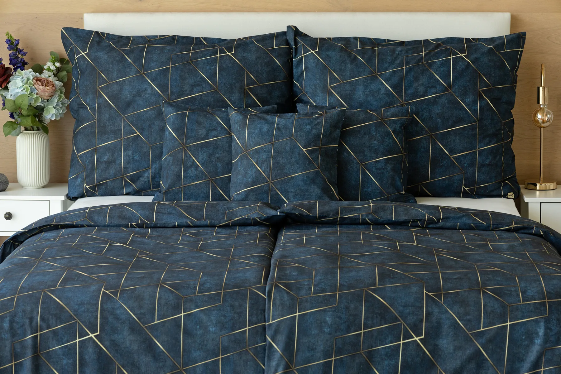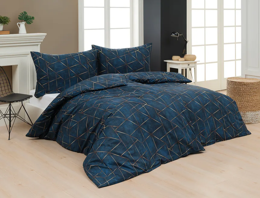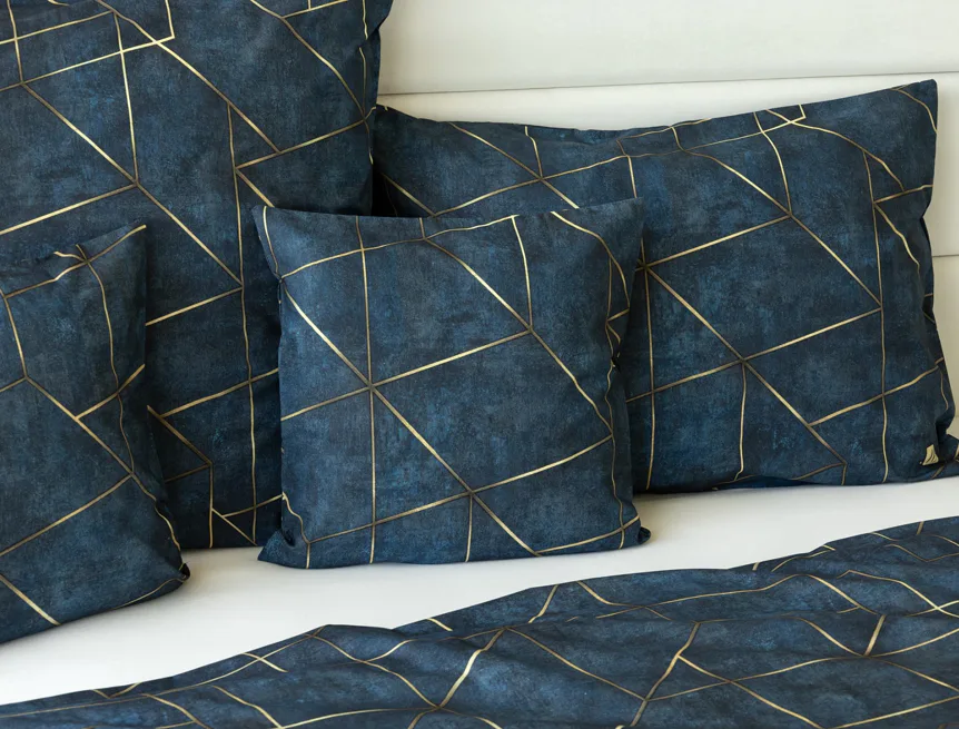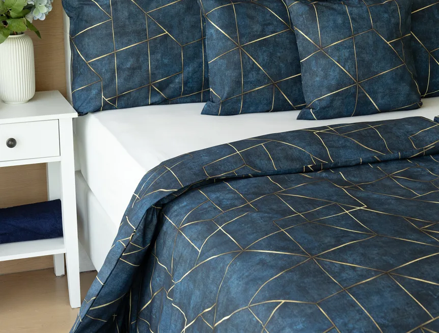 Dopřejte své ložnici dokonale elegantní vzhled s bavlněným ložním povlečením Matis. Vzor, který je jako stvořený do světlého minimalistického interiéru, si jednoduše zamilujete. Podklad v barvě noční oblohy zdobí po celé ploše pískově zlatavý geometrický vzor. Barevné přechody v podkladu i v geometrické linii podtrhují plastický vzhled vzoru. Díky nejmodernějšímu digitálnímu tisku vyniká motiv v precizním detailu.