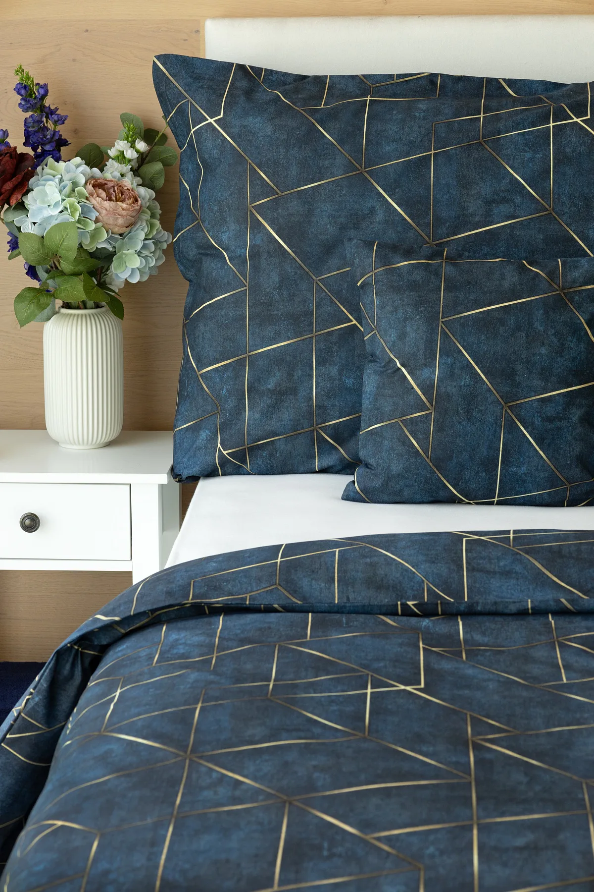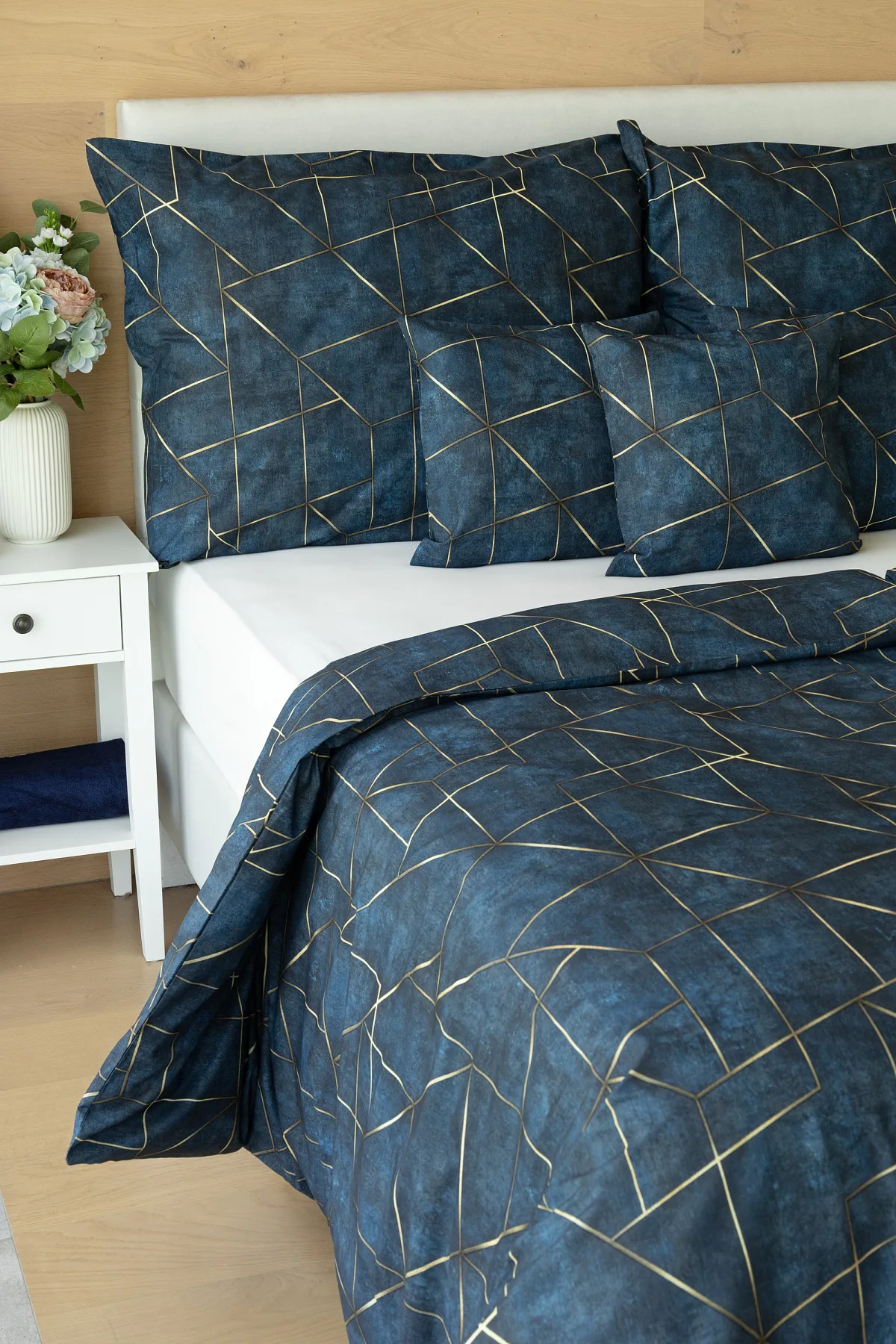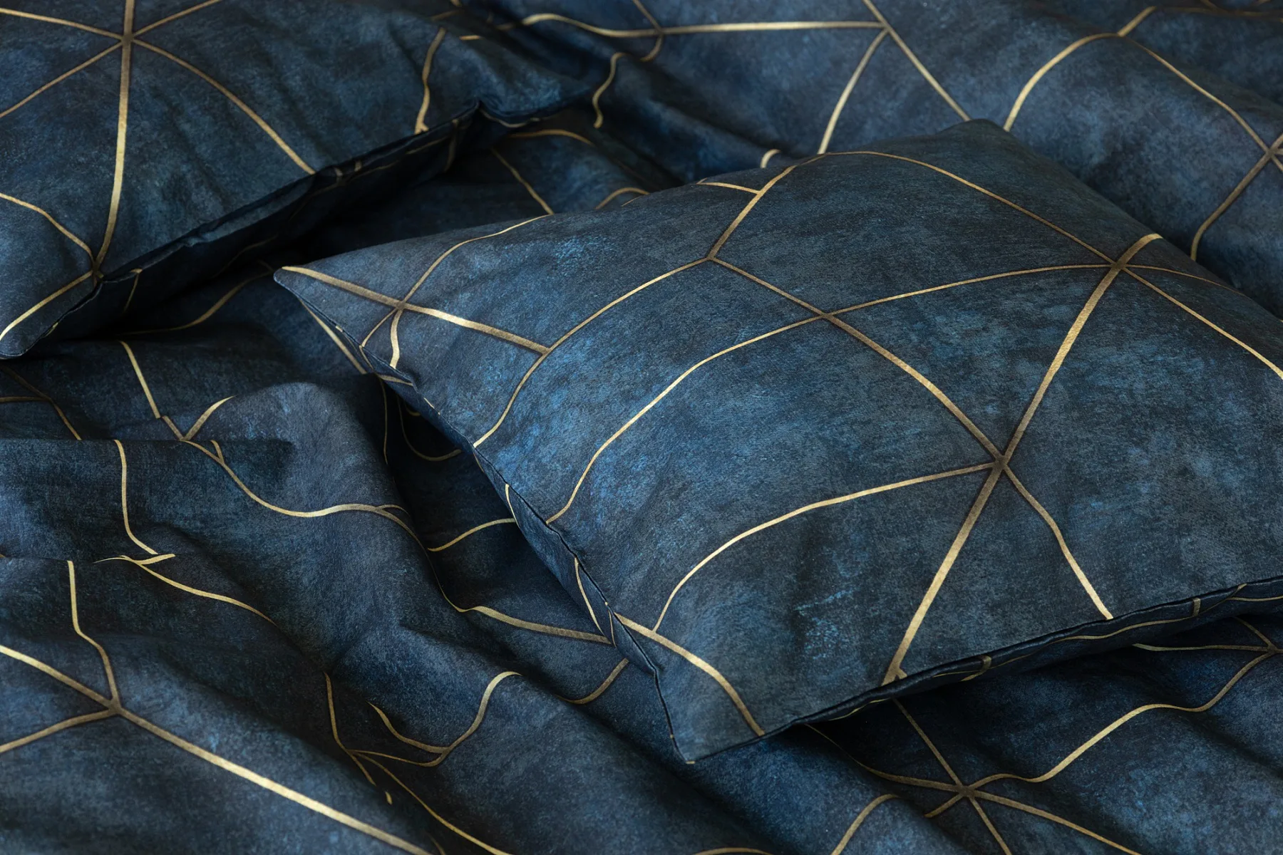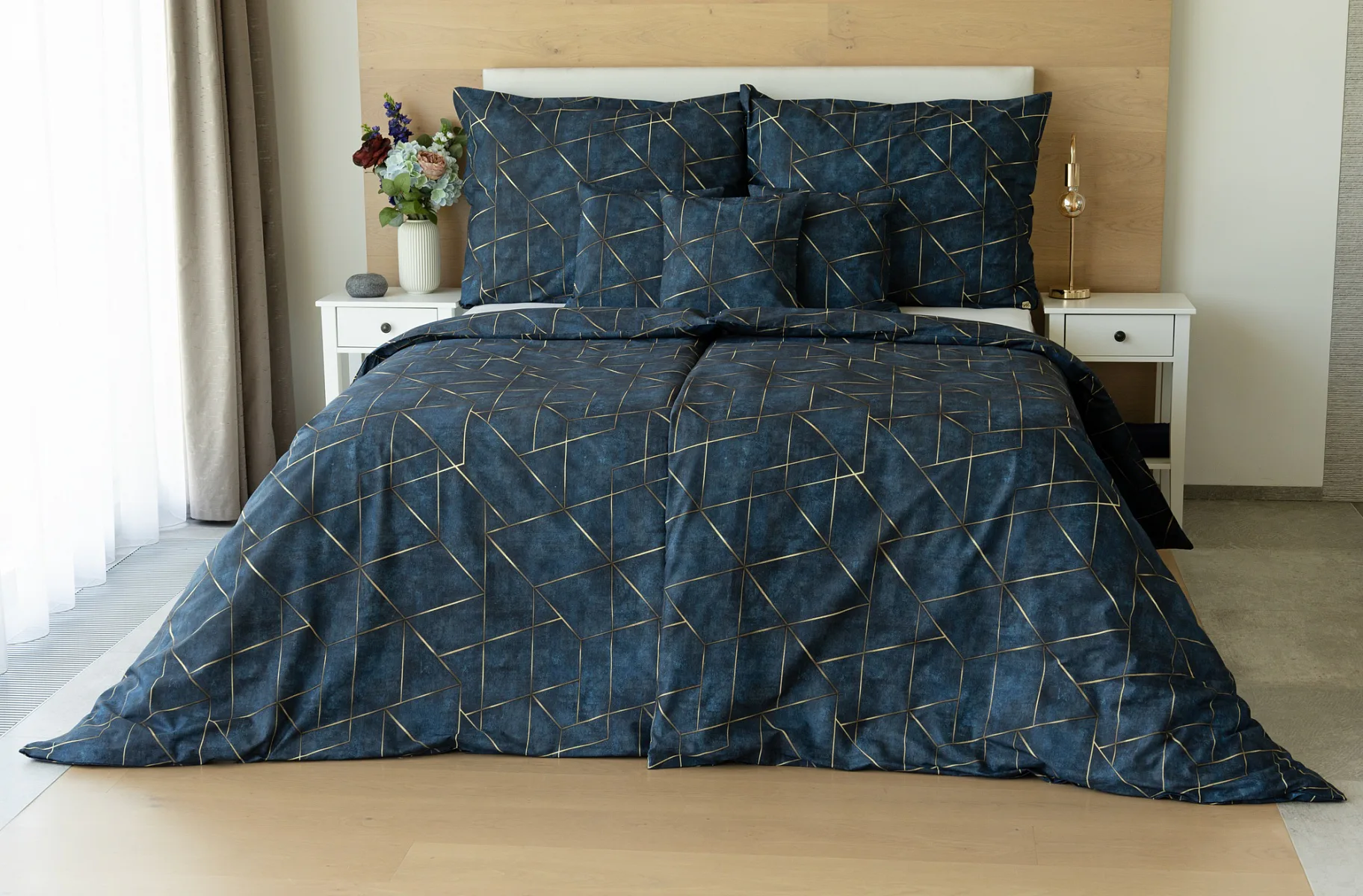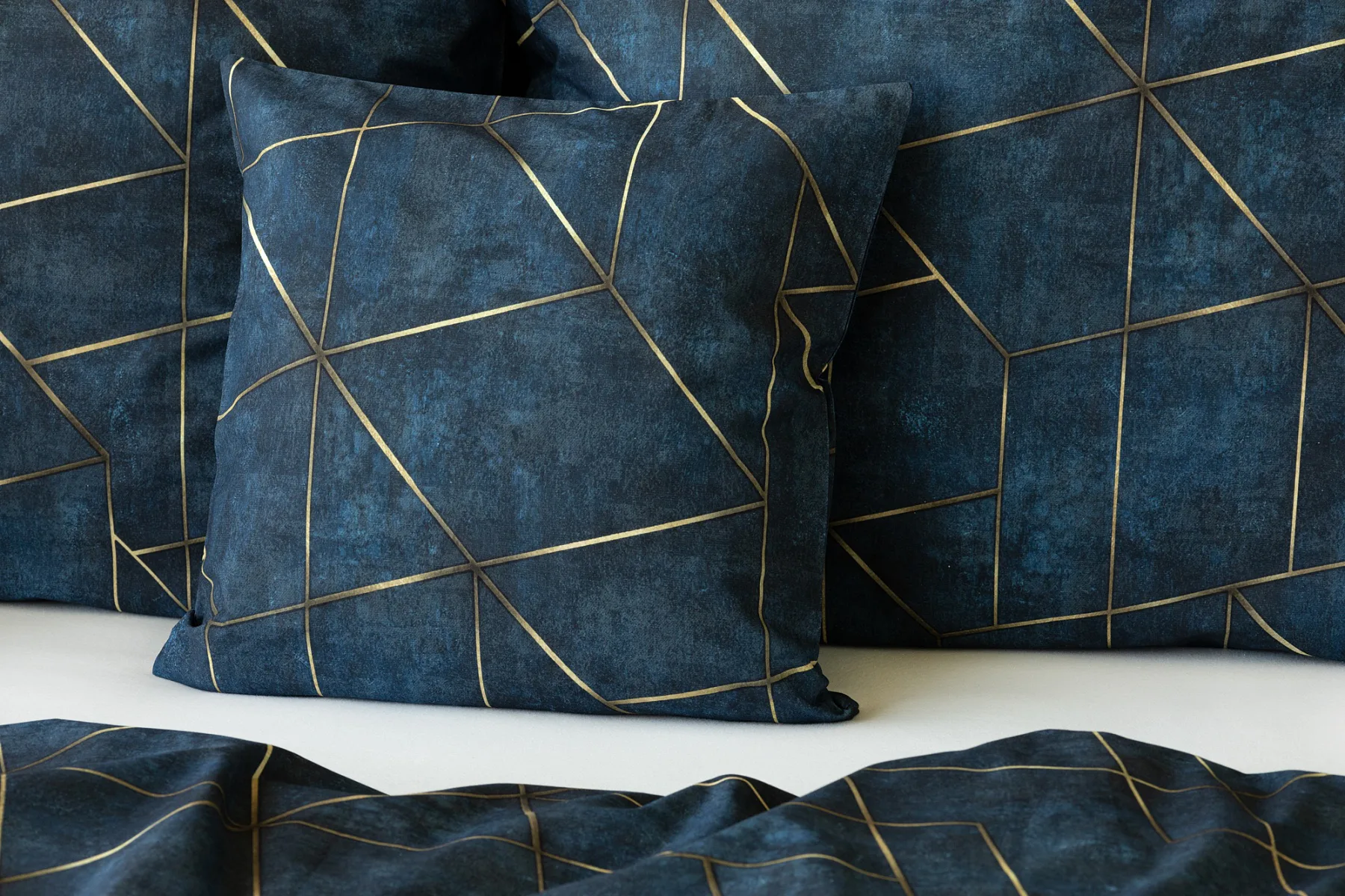 Dopřejte své ložnici dokonale elegantní vzhled s bavlněným ložním povlečením Matis. Vzor, který je jako stvořený do světlého minimalistického interiéru, si jednoduše zamilujete. Podklad v barvě noční oblohy zdobí po celé ploše pískově zlatavý geometrický vzor. Barevné přechody v podkladu i v geometrické linii podtrhují plastický vzhled vzoru. Díky nejmodernějšímu digitálnímu tisku vyniká motiv v precizním detailu.