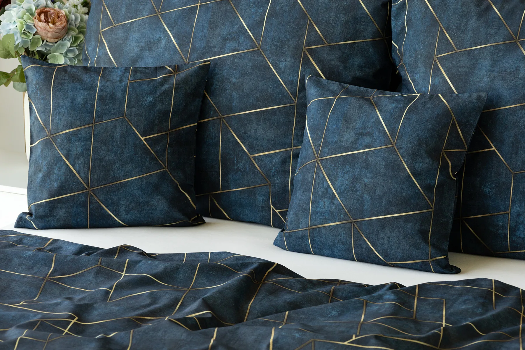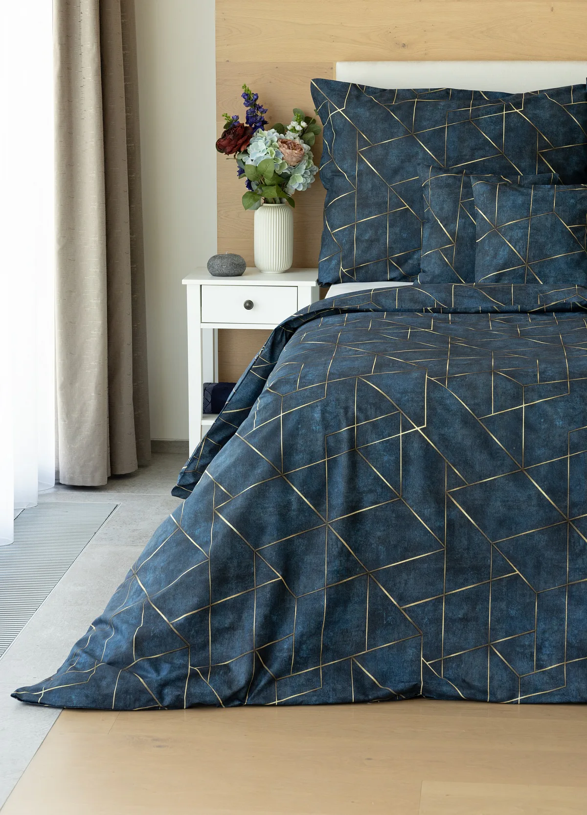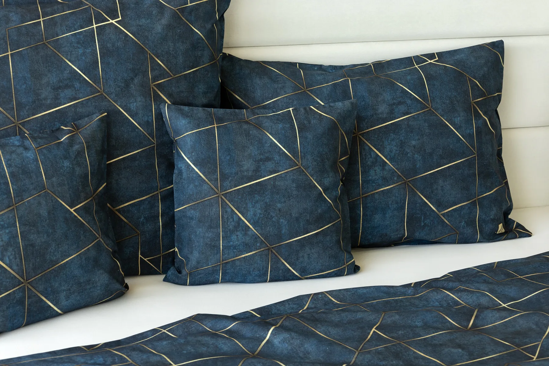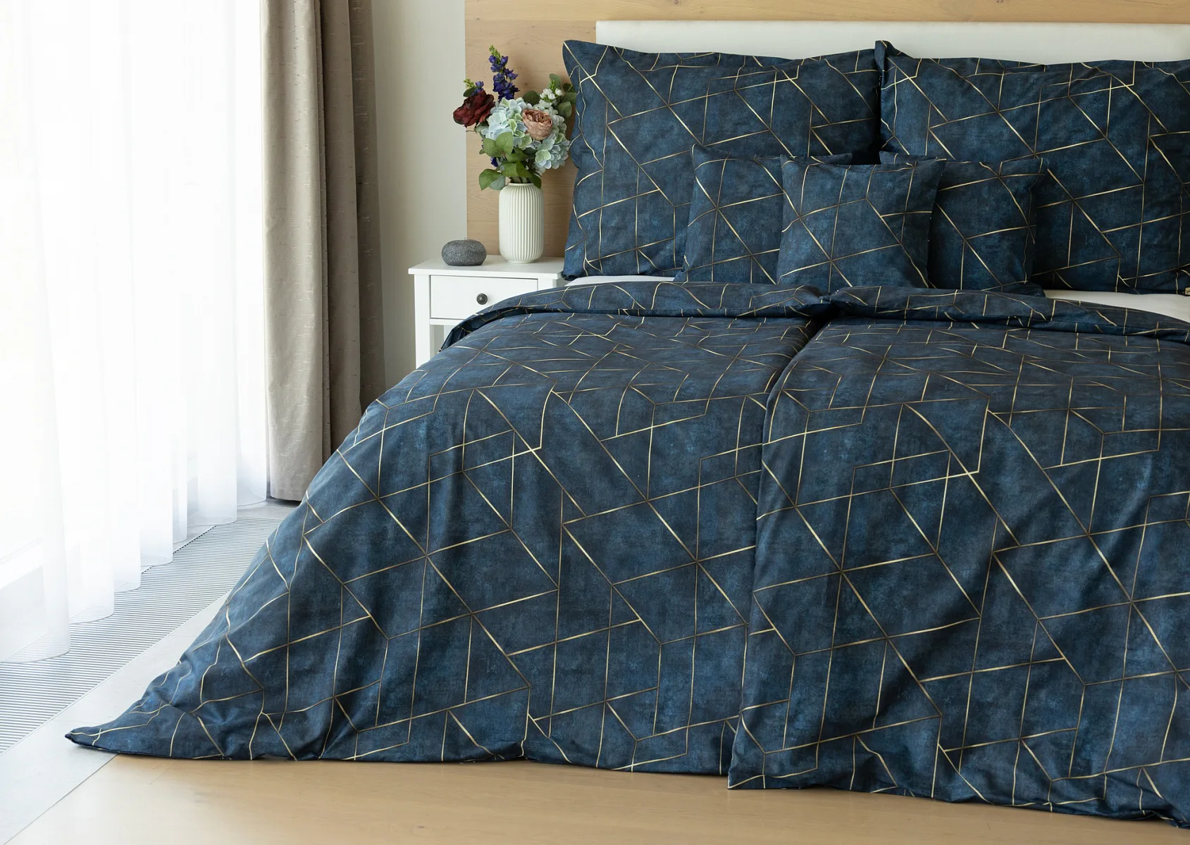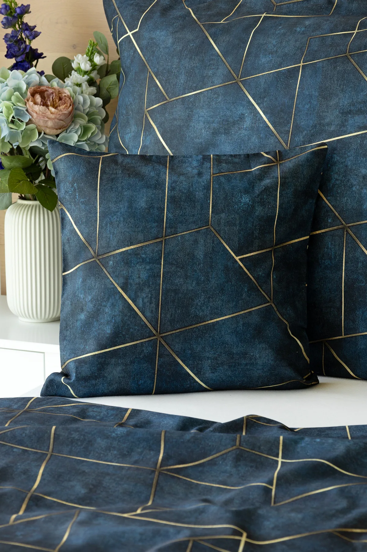 Dopřejte své ložnici dokonale elegantní vzhled s bavlněným ložním povlečením Matis. Vzor, který je jako stvořený do světlého minimalistického interiéru, si jednoduše zamilujete. Podklad v barvě noční oblohy zdobí po celé ploše pískově zlatavý geometrický vzor. Barevné přechody v podkladu i v geometrické linii podtrhují plastický vzhled vzoru. Díky nejmodernějšímu digitálnímu tisku vyniká motiv v precizním detailu.