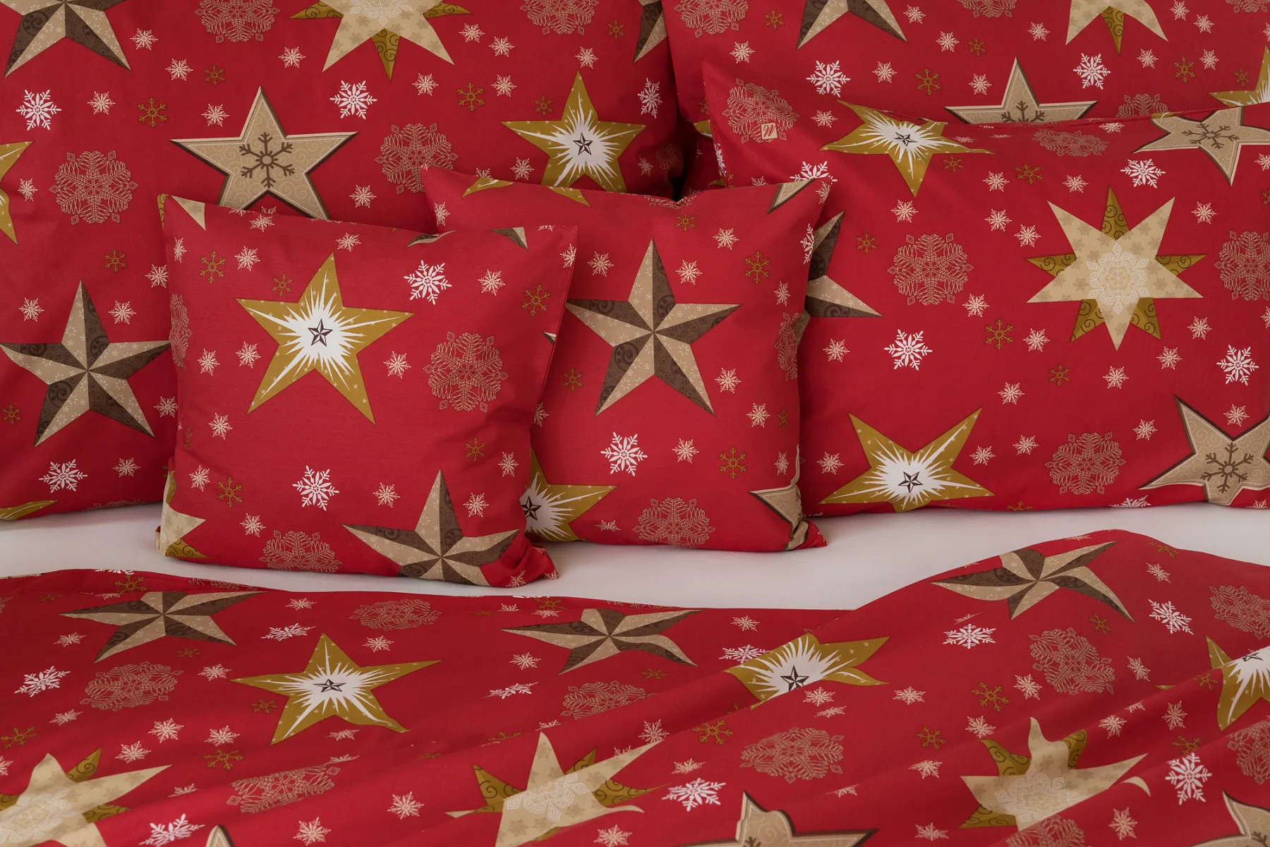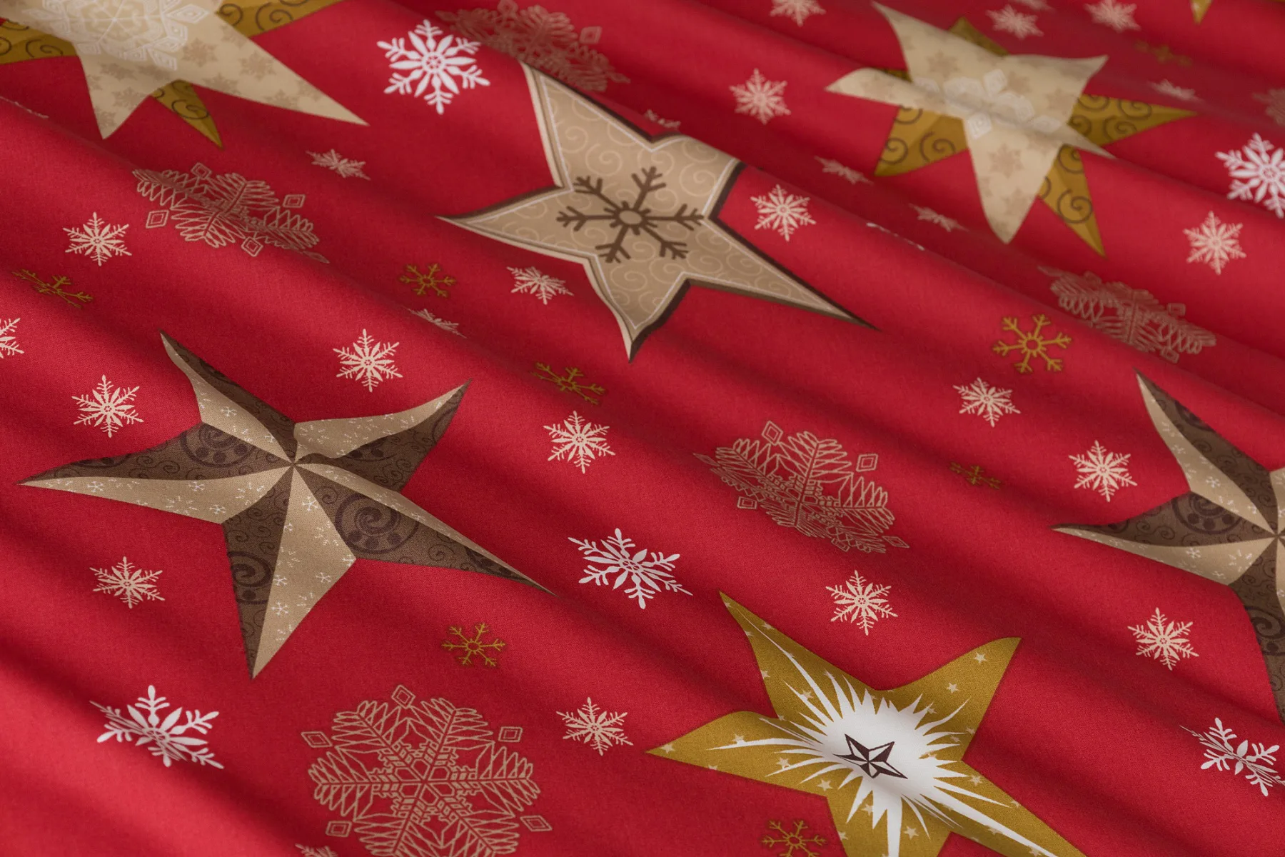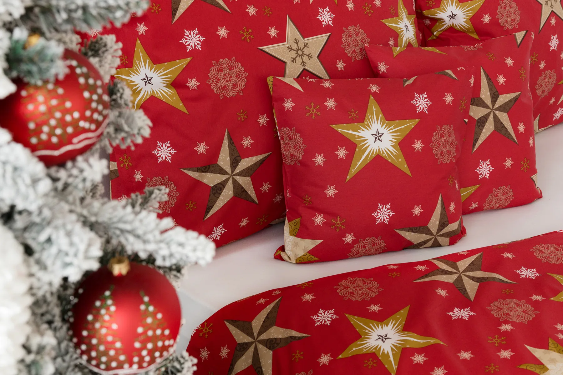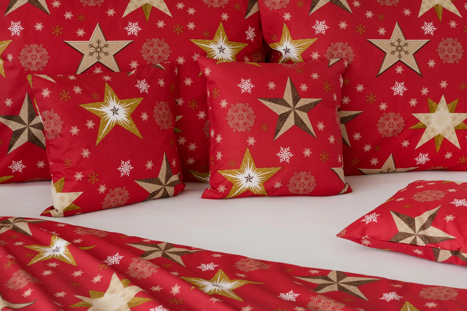 Nalaďte se na hřejivou vánoční atmosféru s bavlněným povlečením Merci. Sváteční motiv zlatých hvězd a sněhových vloček vyniká na podkladu v tradiční červené barvě.