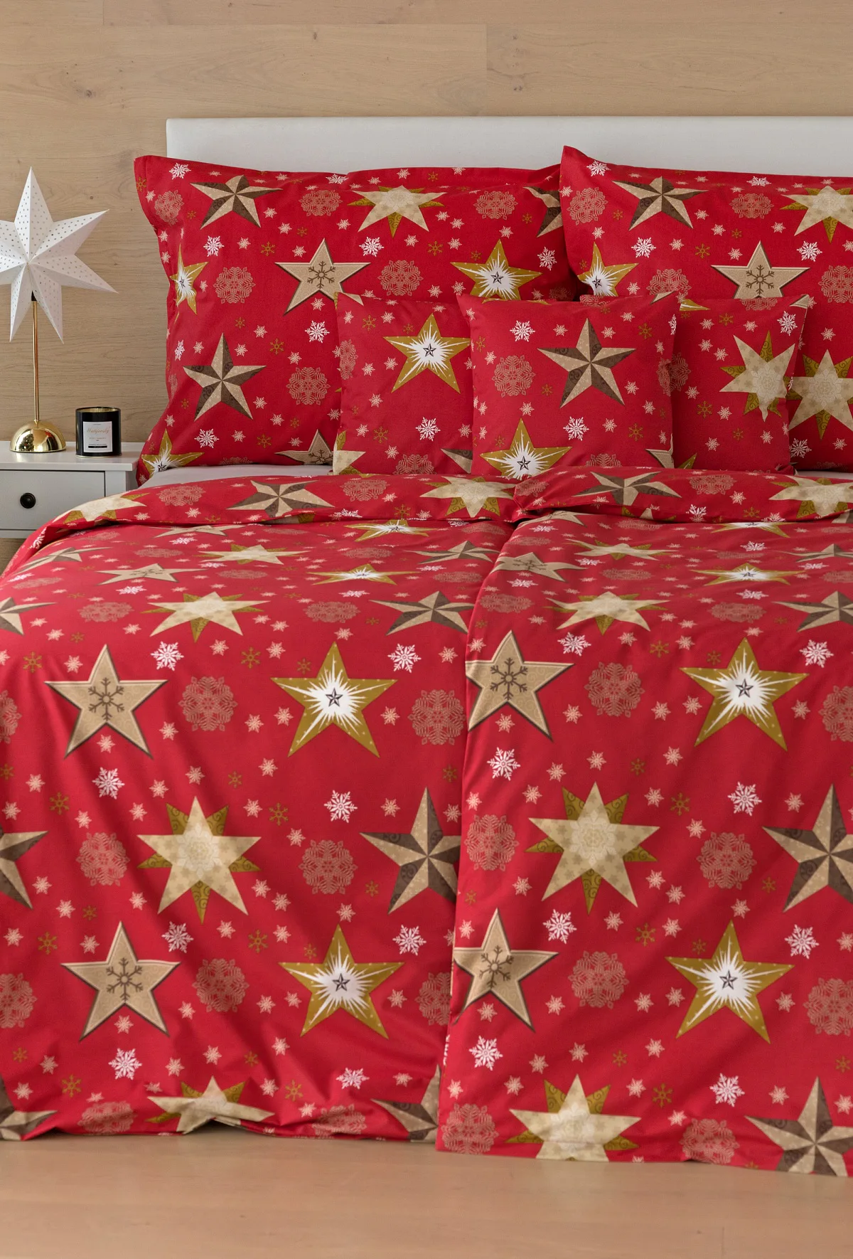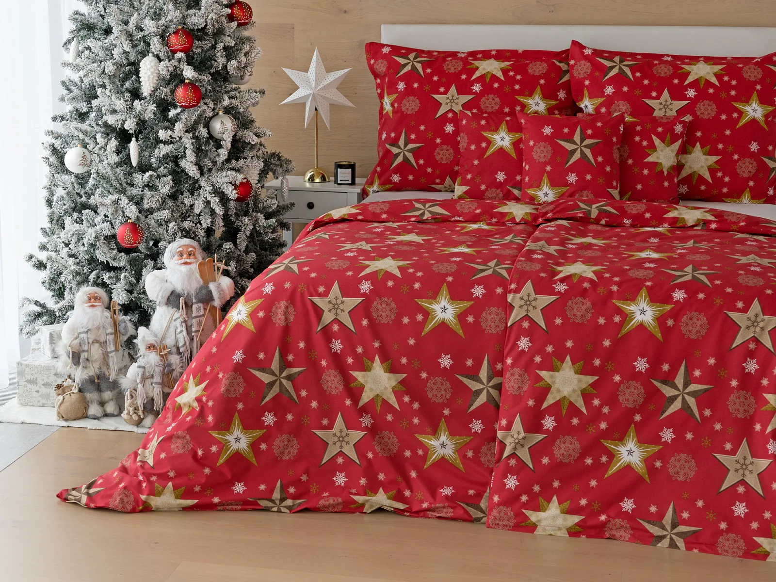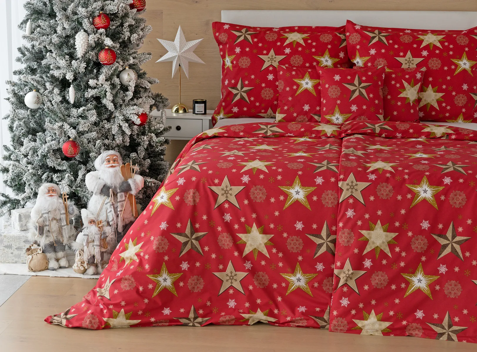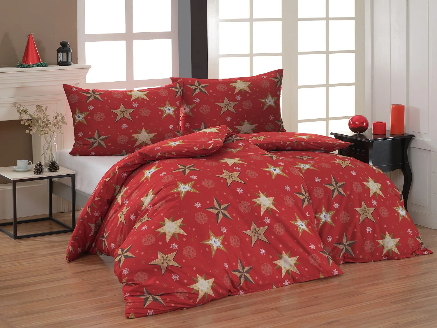 Nalaďte se na hřejivou vánoční atmosféru s bavlněným povlečením Merci. Sváteční motiv zlatých hvězd a sněhových vloček vyniká na podkladu v tradiční červené barvě.
