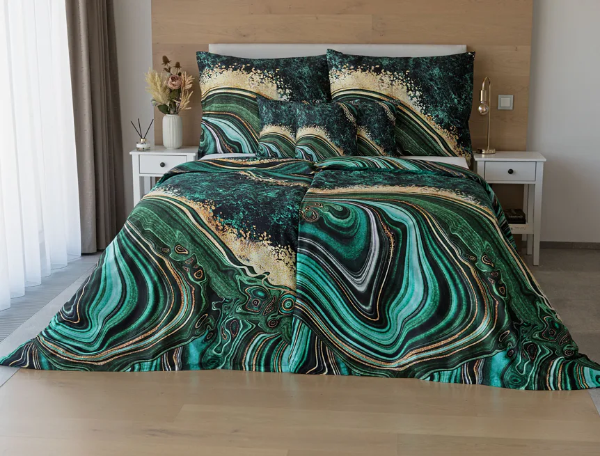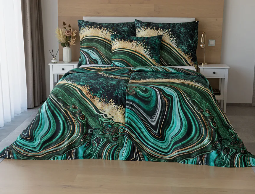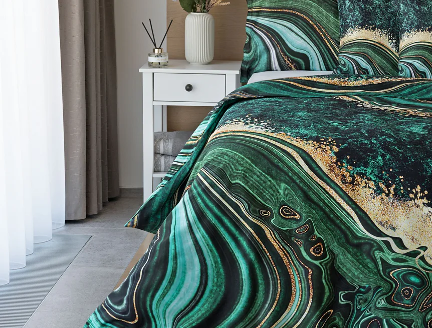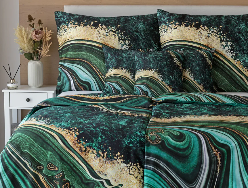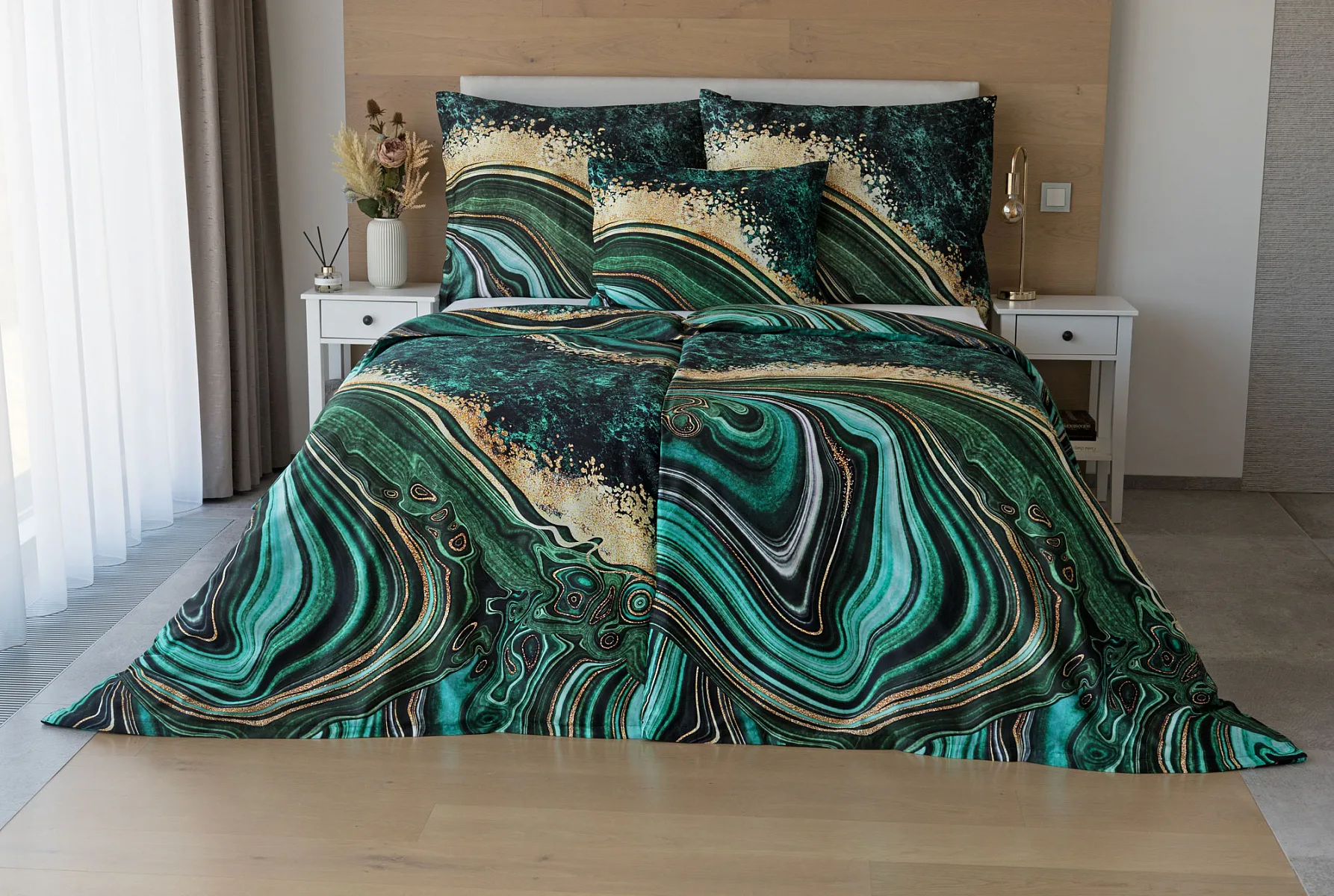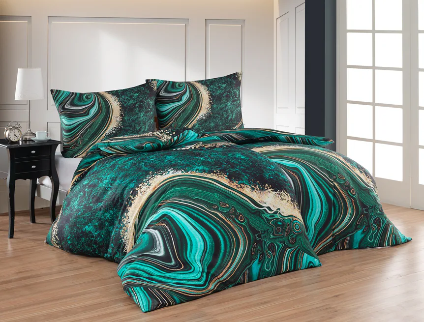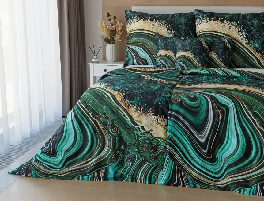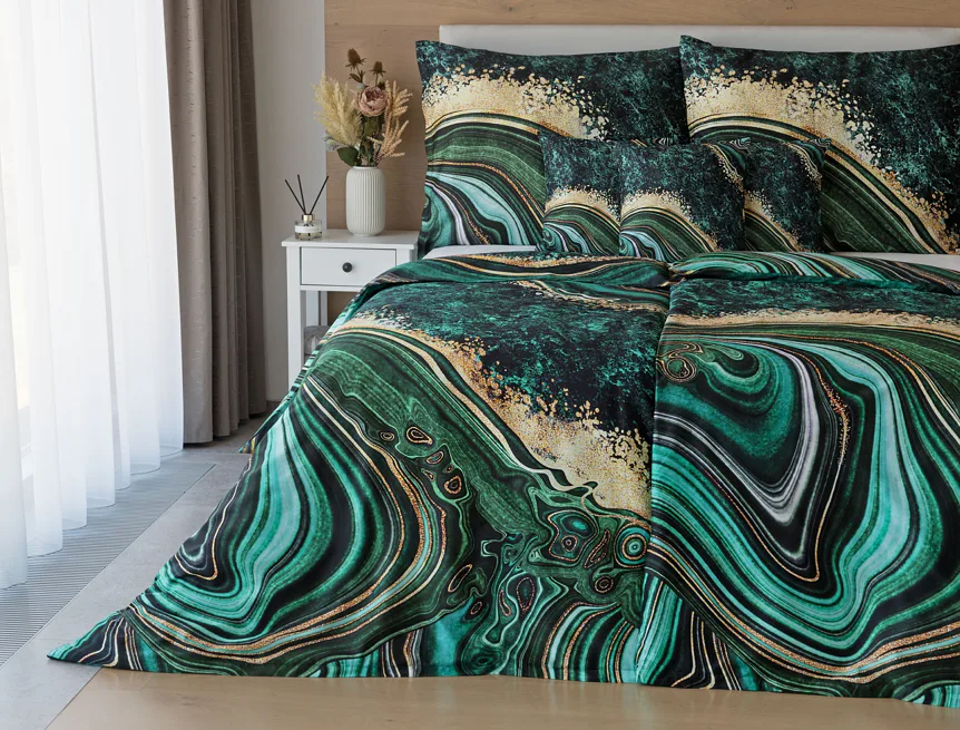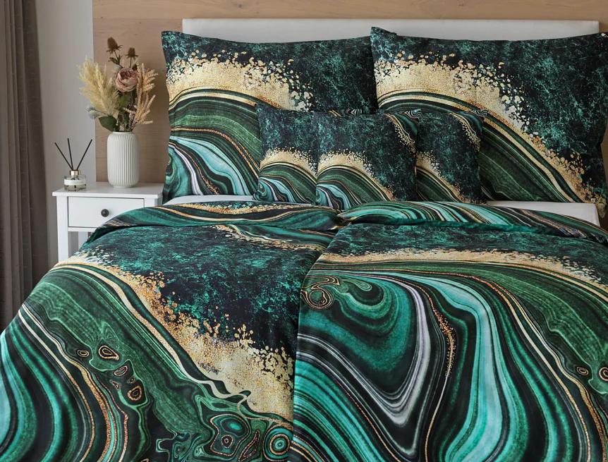 Nalaďte se na pozitivní vlnu s energickým vzorem ložního povlečení Metheora. Abstraktnímu motivu dominují odstíny smaragdově zelené barvy, která působí na lidskou mysl klidně, napomáhá regeneraci a načerpání nové síly. Zelené barvě sluší kombinace se zlatou, díky které získává noblesní nádech. A přesně tyto odstíny barev se snoubí ve vzoru Metheora, jehož eleganci navíc podtrhuje hebký bavlněný satén vyrobený ze 100% bavlny.