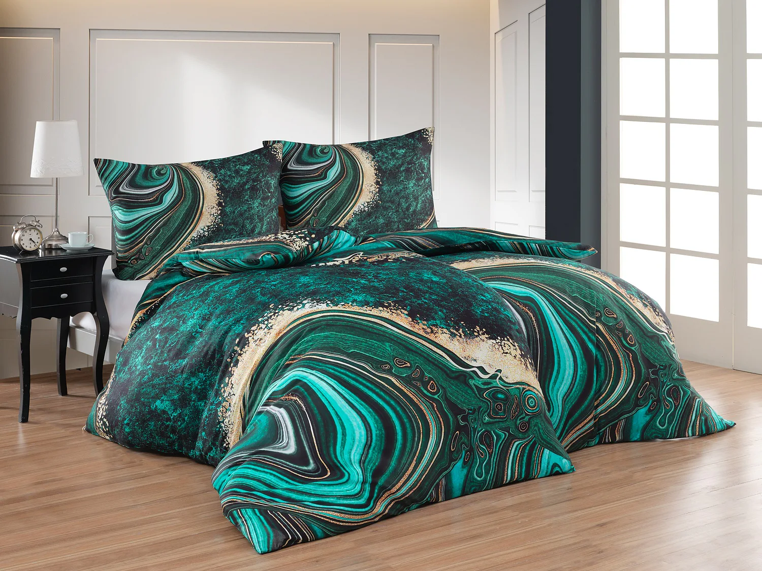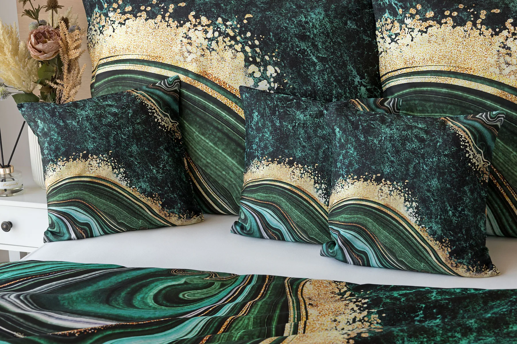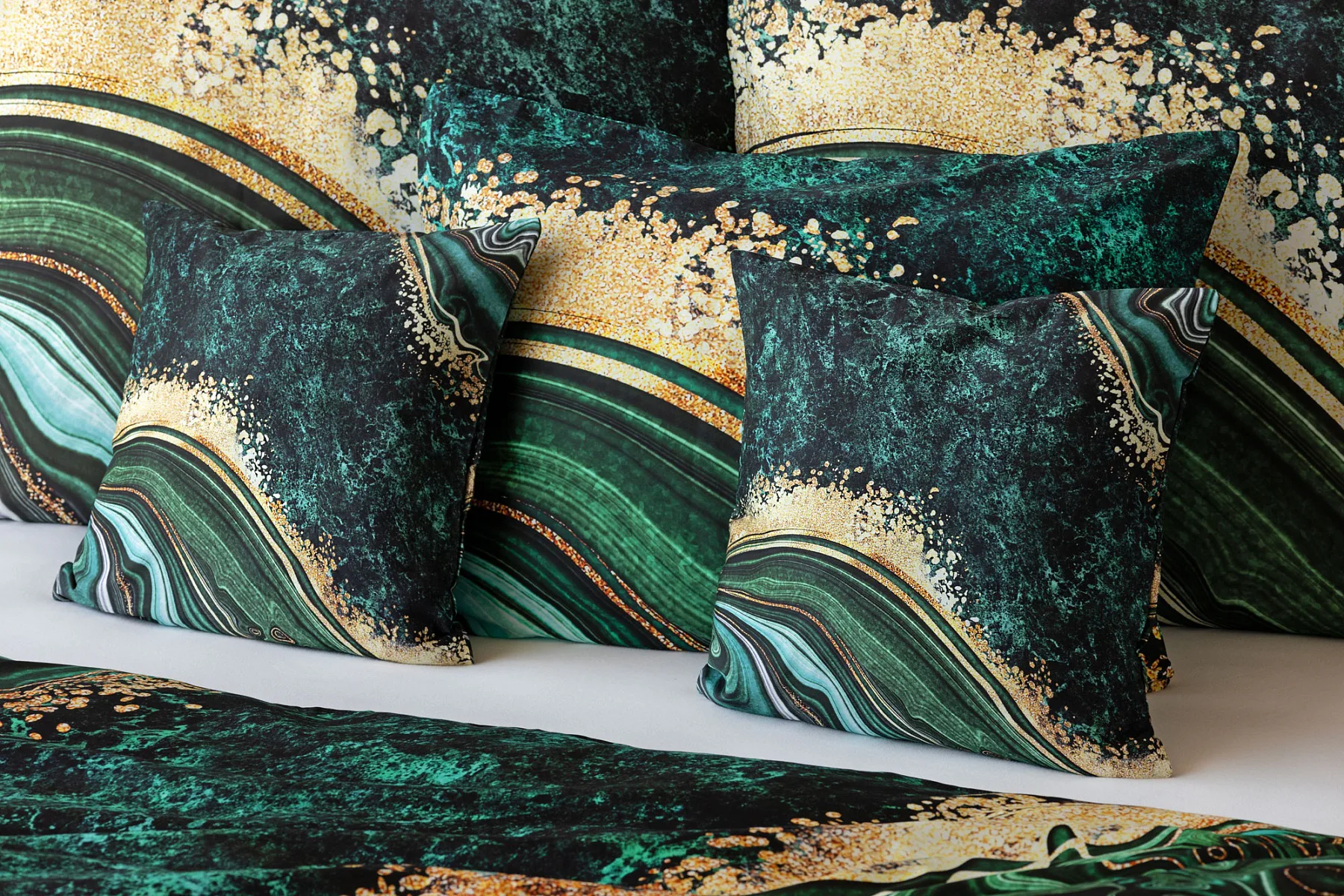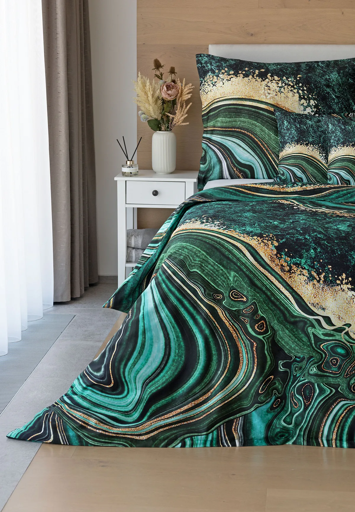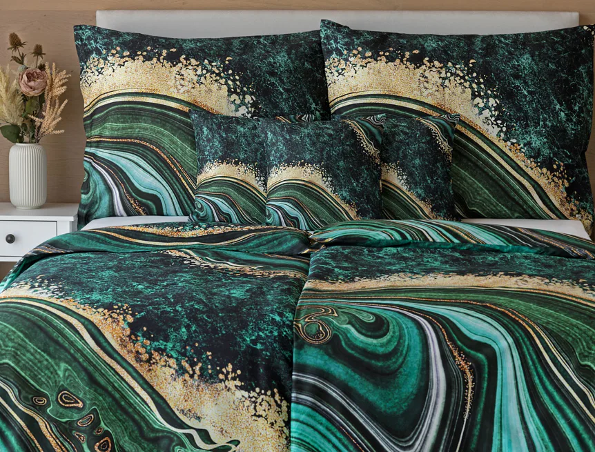 Nalaďte se na pozitivní vlnu s energickým vzorem ložního povlečení Metheora. Abstraktnímu motivu dominují odstíny smaragdově zelené barvy, která působí na lidskou mysl klidně, napomáhá regeneraci a načerpání nové síly. Zelené barvě sluší kombinace se zlatou, díky které získává noblesní nádech. A přesně tyto odstíny barev se snoubí ve vzoru Metheora, jehož eleganci navíc podtrhuje hebký bavlněný satén vyrobený ze 100% bavlny.