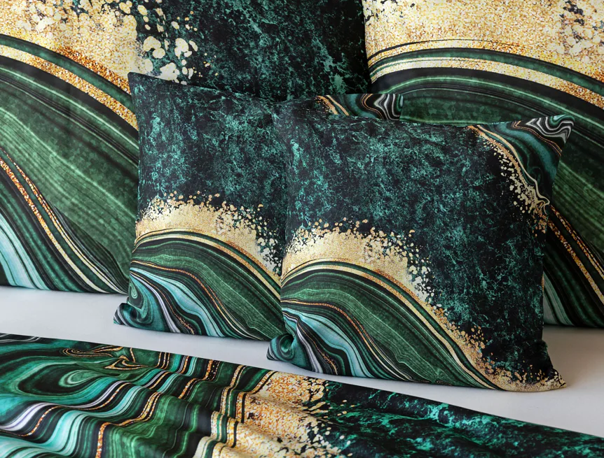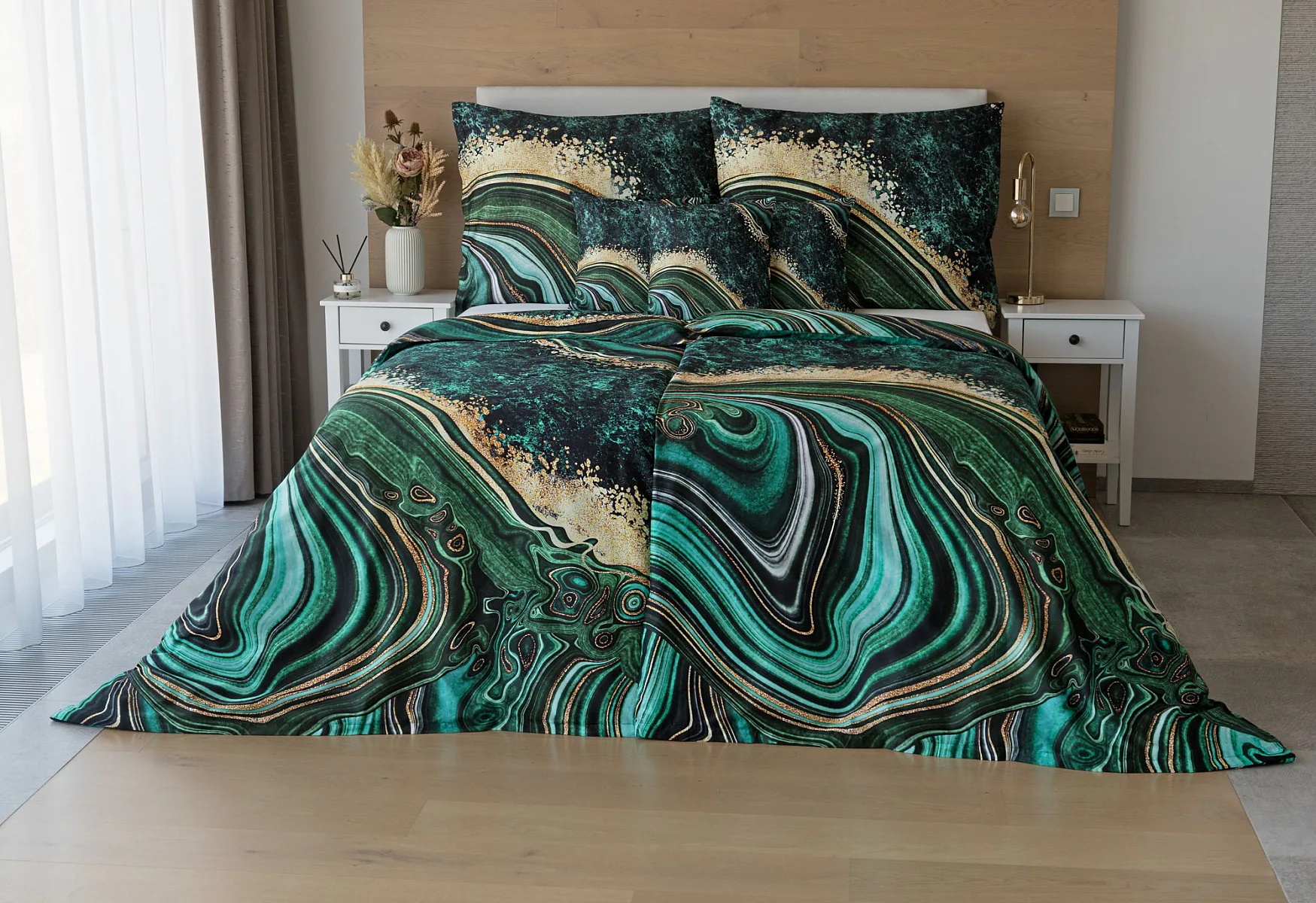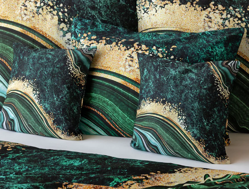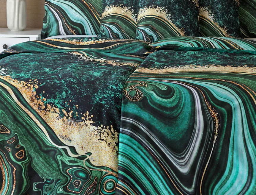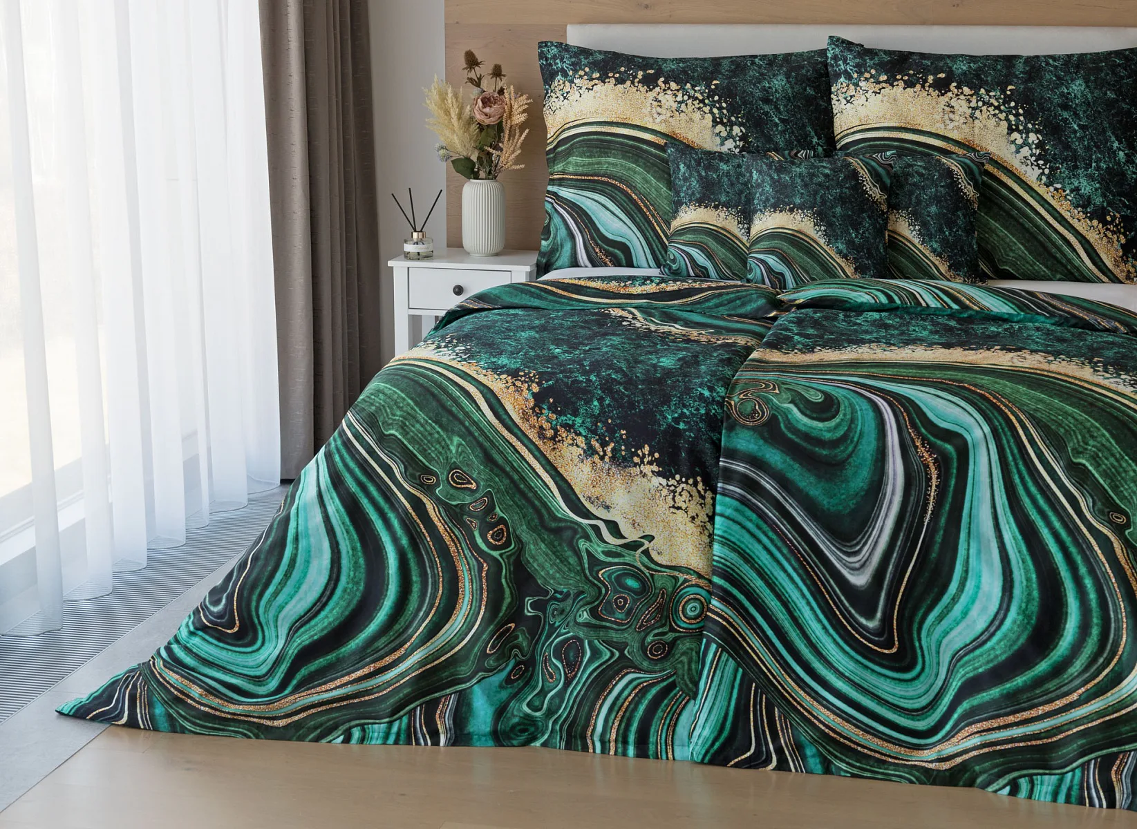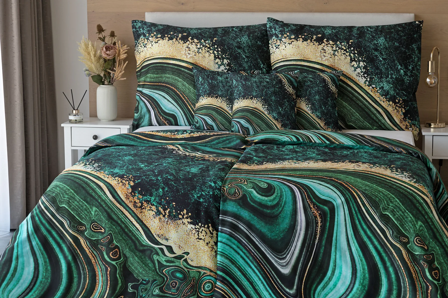 Nalaďte se na pozitivní vlnu s energickým vzorem ložního povlečení Metheora. Abstraktnímu motivu dominují odstíny smaragdově zelené barvy, která působí na lidskou mysl klidně, napomáhá regeneraci a načerpání nové síly. Zelené barvě sluší kombinace se zlatou, díky které získává noblesní nádech. A přesně tyto odstíny barev se snoubí ve vzoru Metheora, jehož eleganci navíc podtrhuje hebký bavlněný satén vyrobený ze 100% bavlny.
