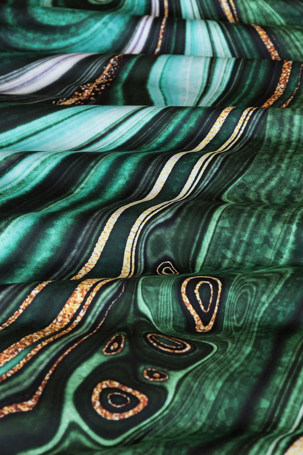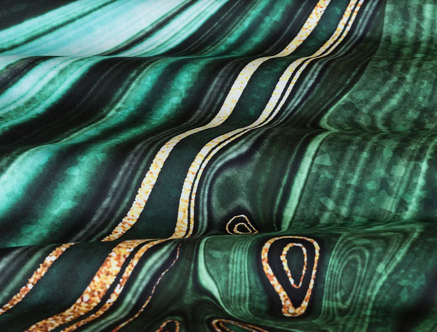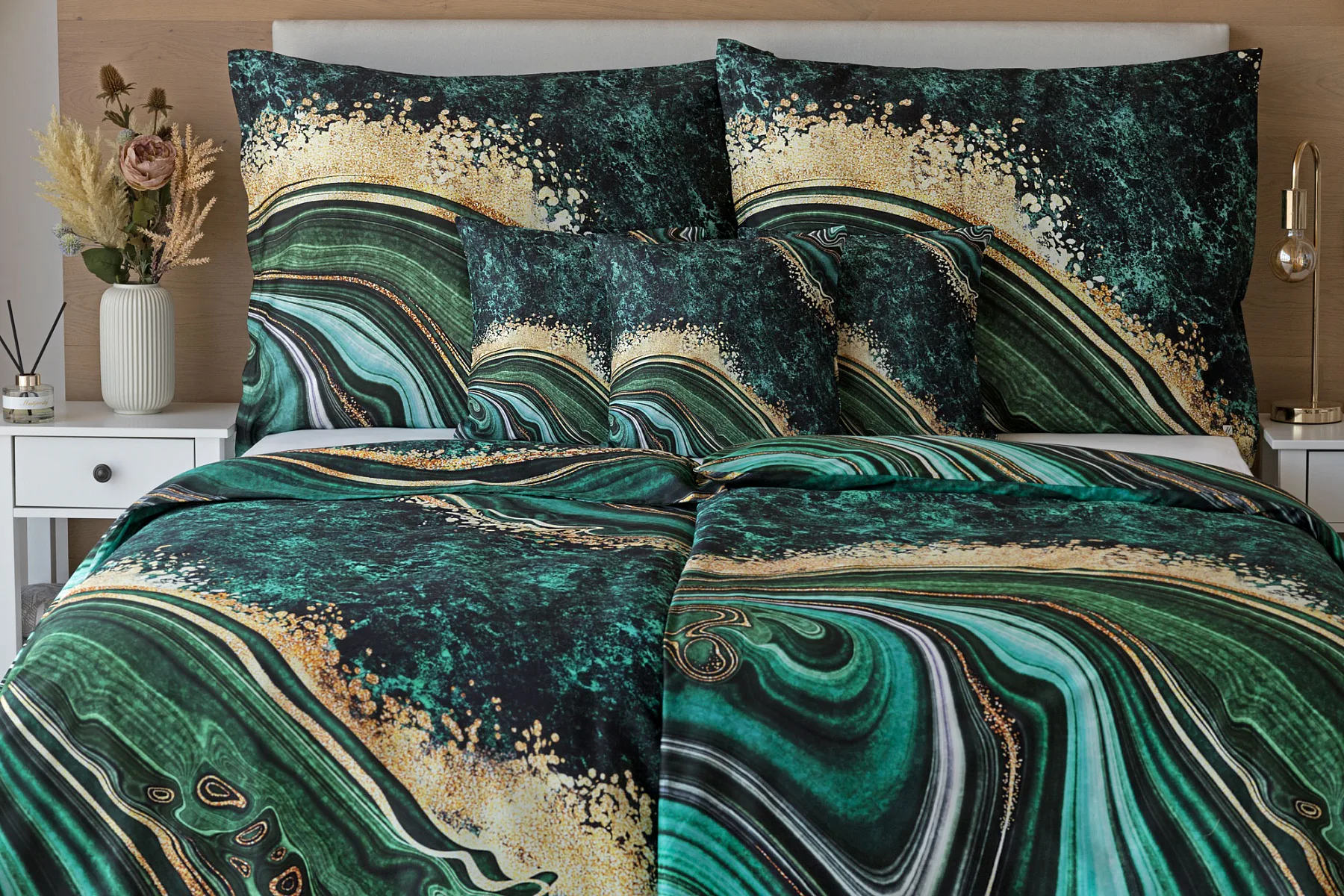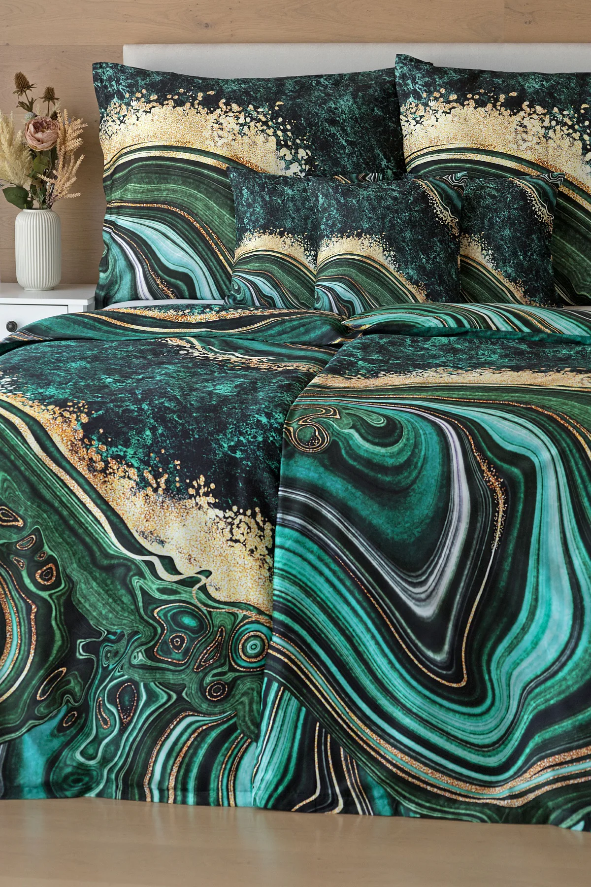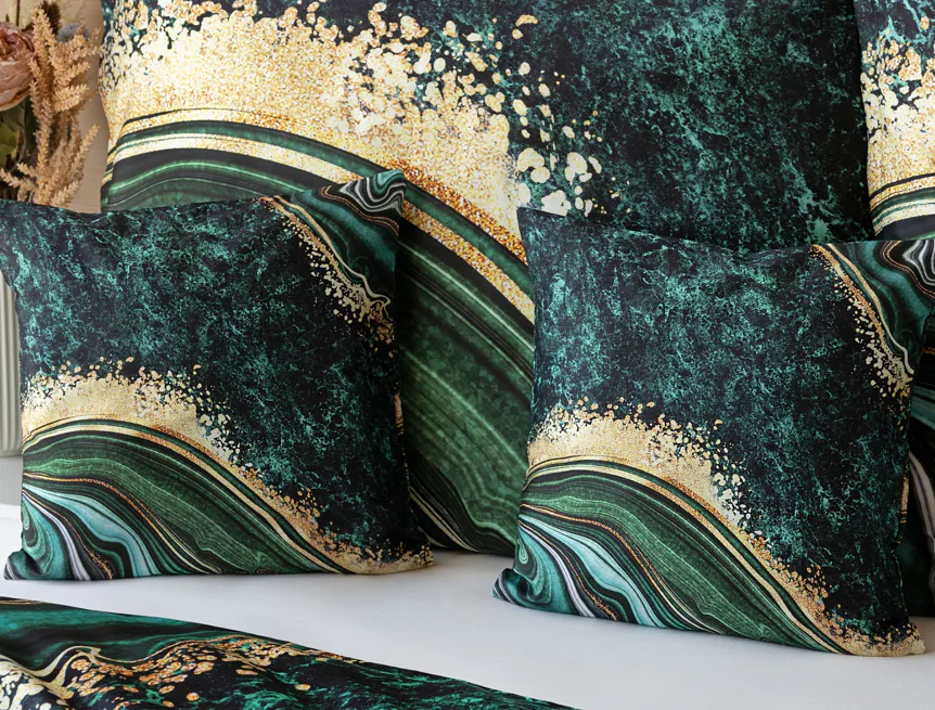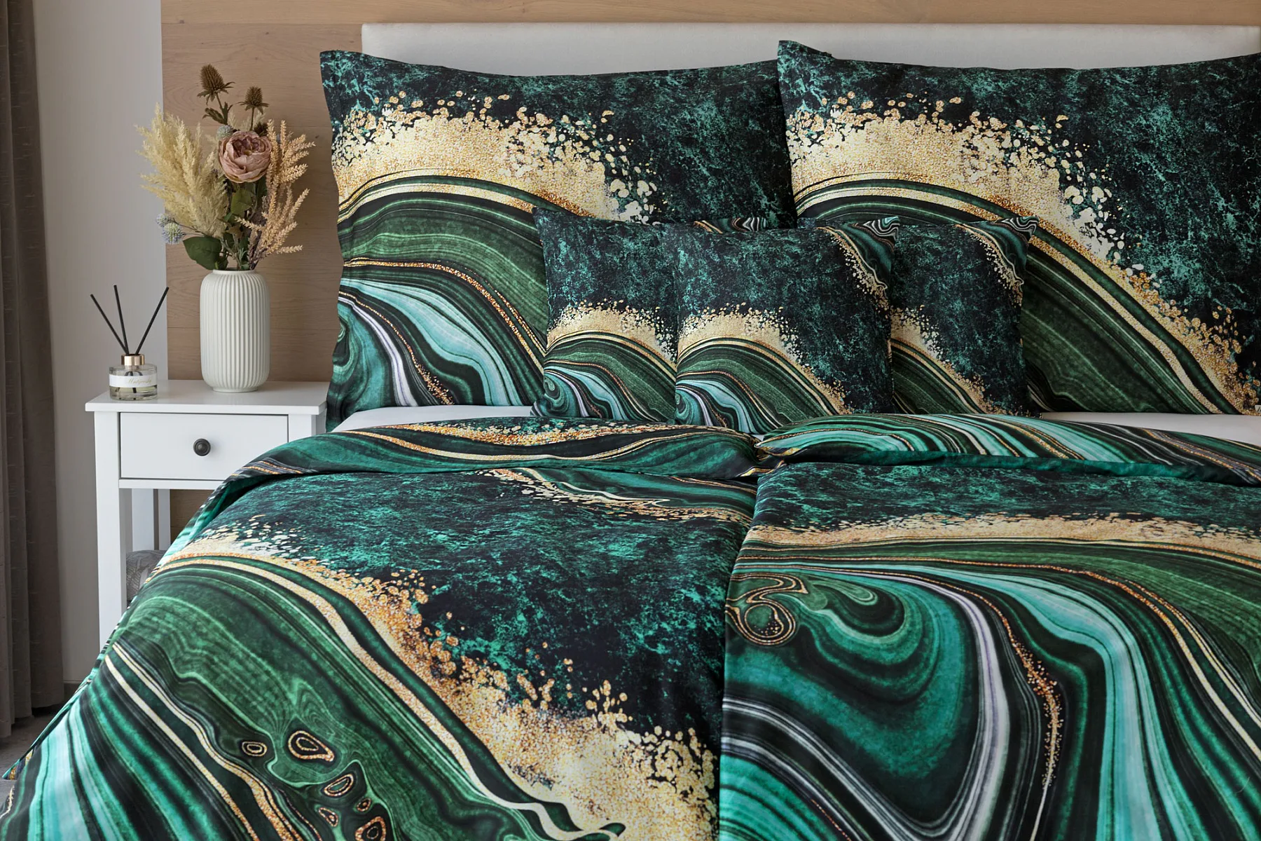 Nalaďte se na pozitivní vlnu s energickým vzorem ložního povlečení Metheora. Abstraktnímu motivu dominují odstíny smaragdově zelené barvy, která působí na lidskou mysl klidně, napomáhá regeneraci a načerpání nové síly. Zelené barvě sluší kombinace se zlatou, díky které získává noblesní nádech. A přesně tyto odstíny barev se snoubí ve vzoru Metheora, jehož eleganci navíc podtrhuje hebký bavlněný satén vyrobený ze 100% bavlny.