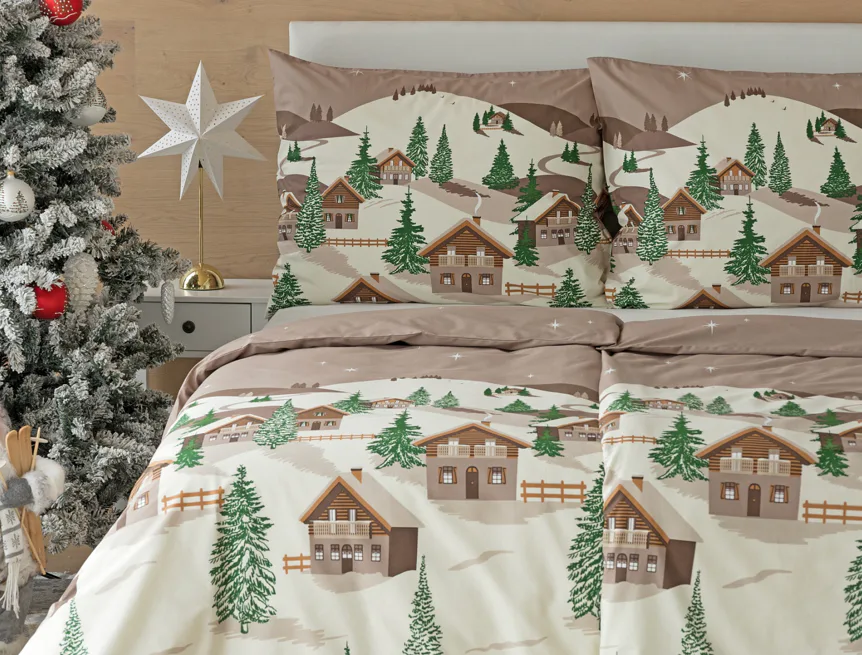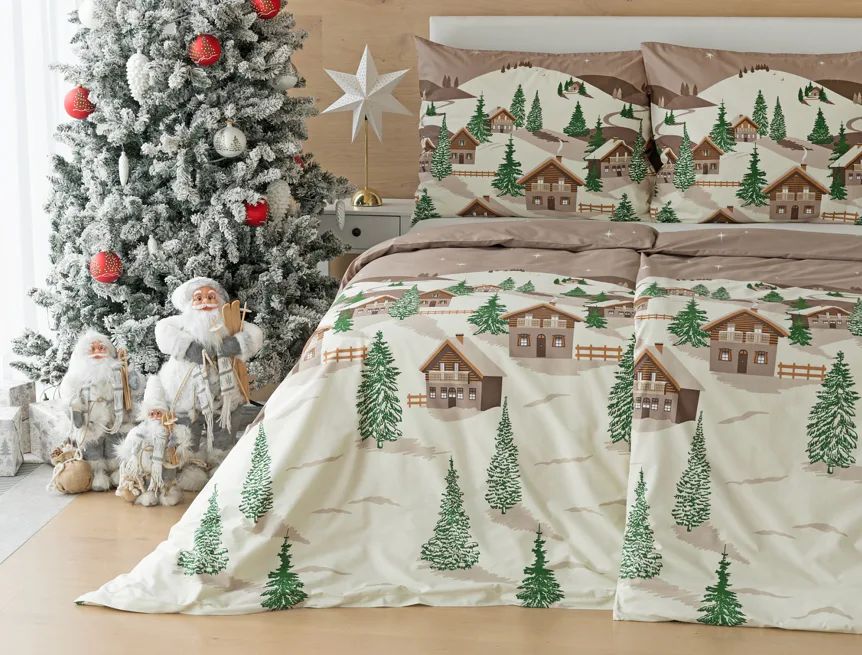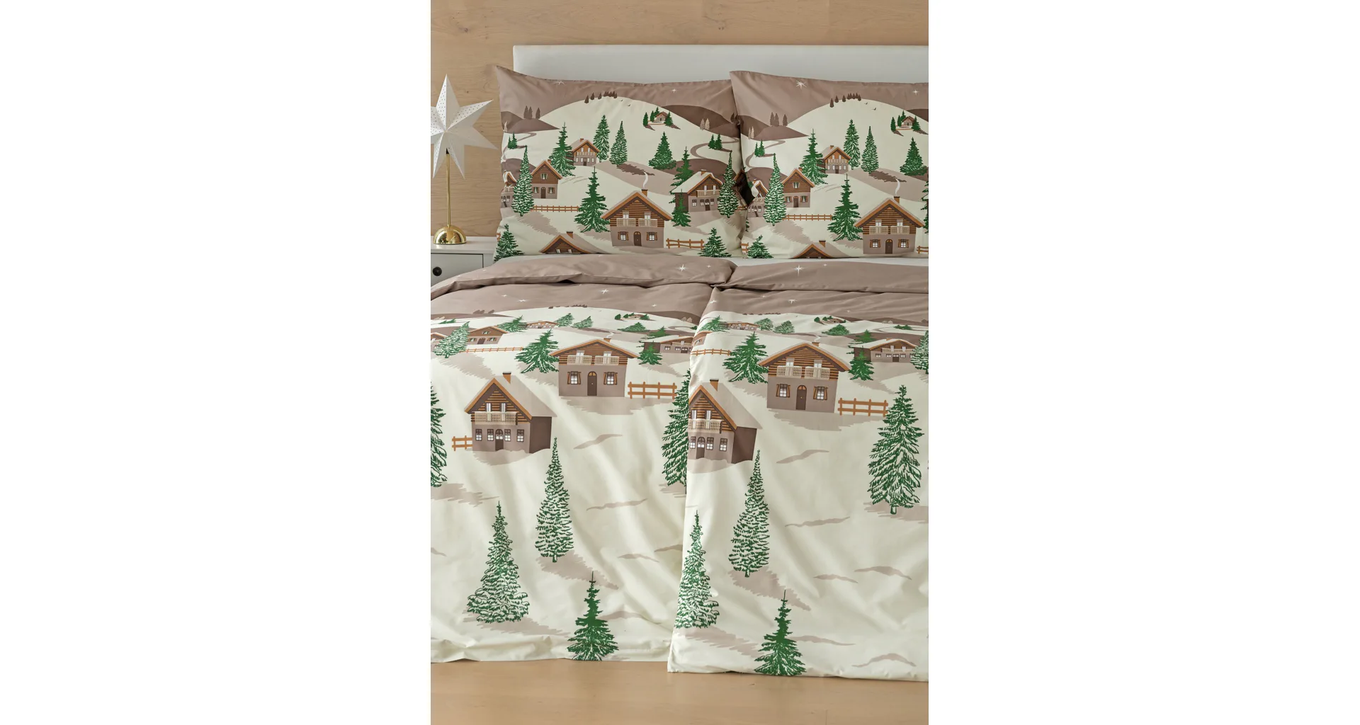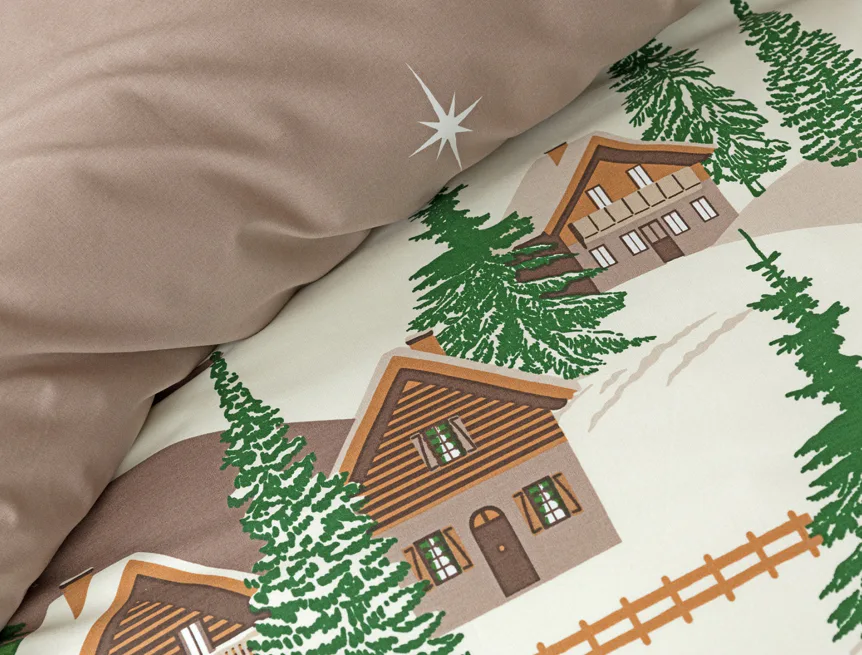 Bavlněné povlečení Niels s motivem zasněžené horské vesničky vnese do vaší ložnice poklidnou zimní atmosféru. Hřejivé odstíny krémové a hnědé oživí motiv zelených stromečků. Na podkladu v přírodní hnědé barvě září sem tam malá bílá hvězdička. Nechte se hýčkat a zachumlejte se do jemné bavlny deluxe.