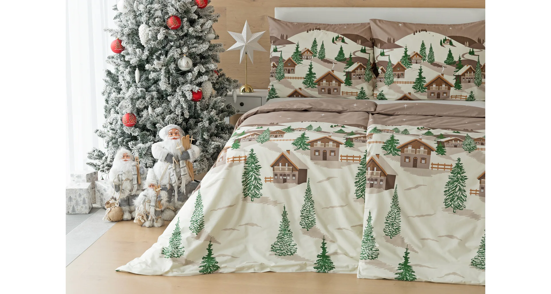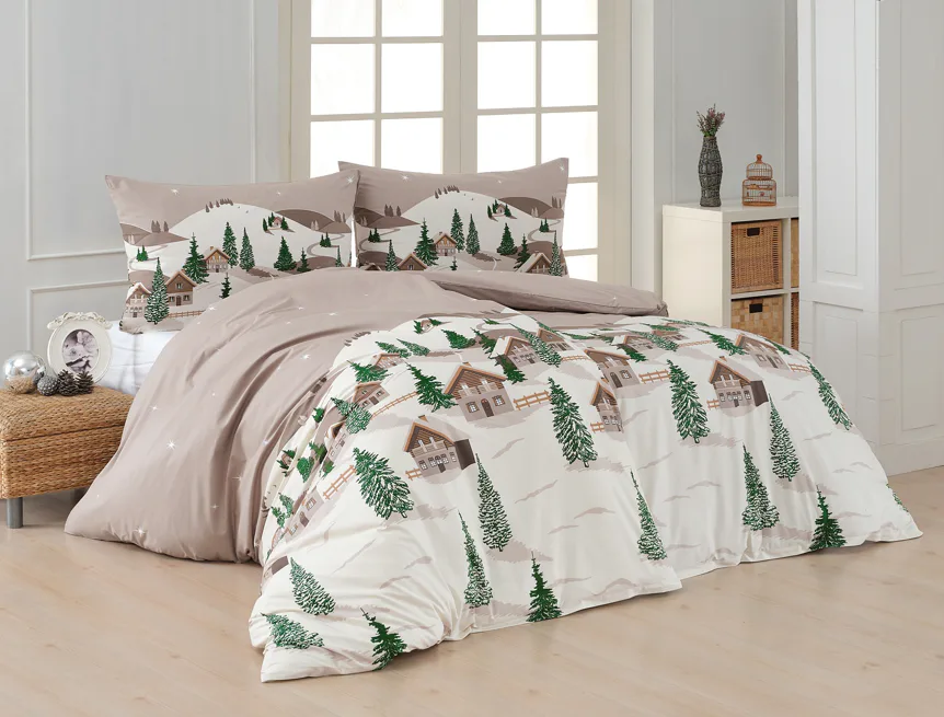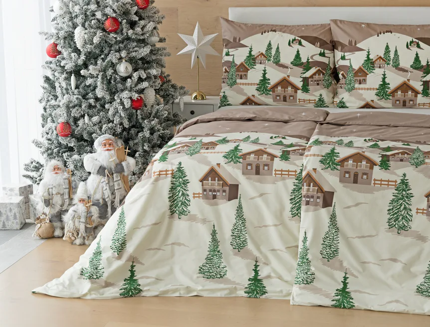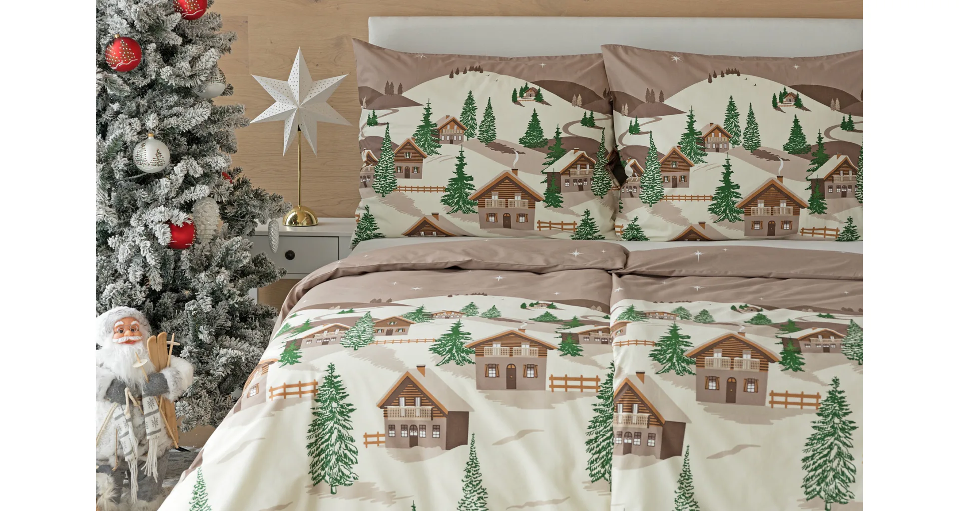 Bavlněné povlečení Niels s motivem zasněžené horské vesničky vnese do vaší ložnice poklidnou zimní atmosféru. Hřejivé odstíny krémové a hnědé oživí motiv zelených stromečků. Na podkladu v přírodní hnědé barvě září sem tam malá bílá hvězdička. Nechte se hýčkat a zachumlejte se do jemné bavlny deluxe.