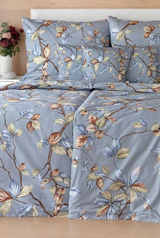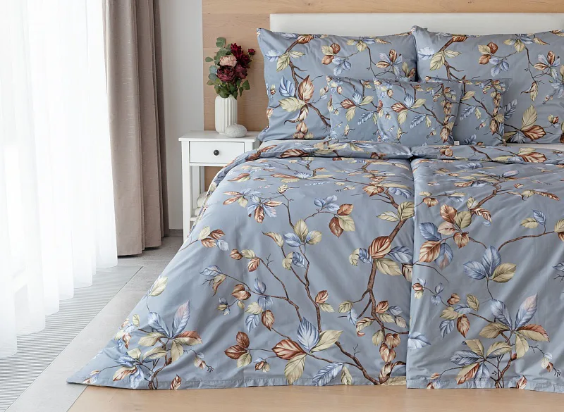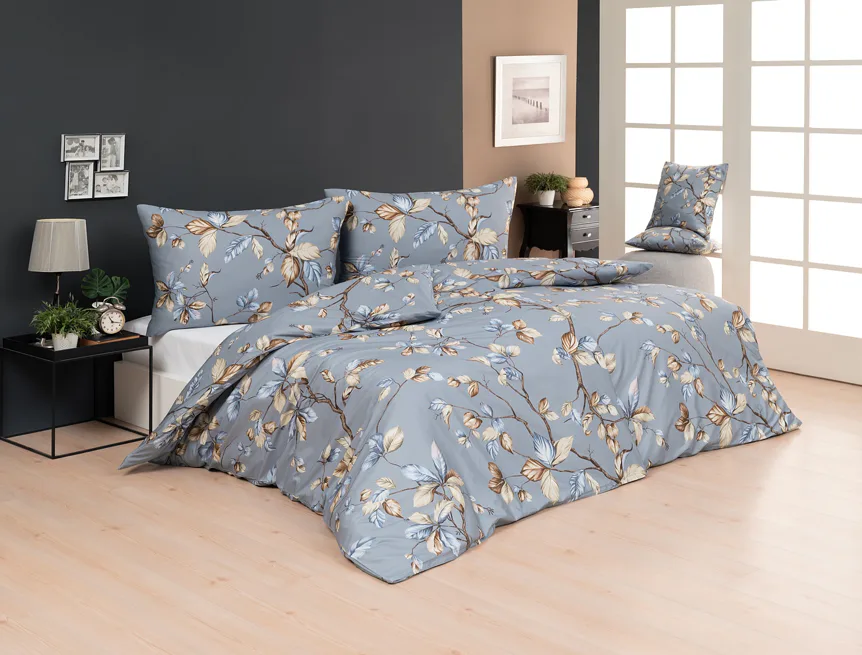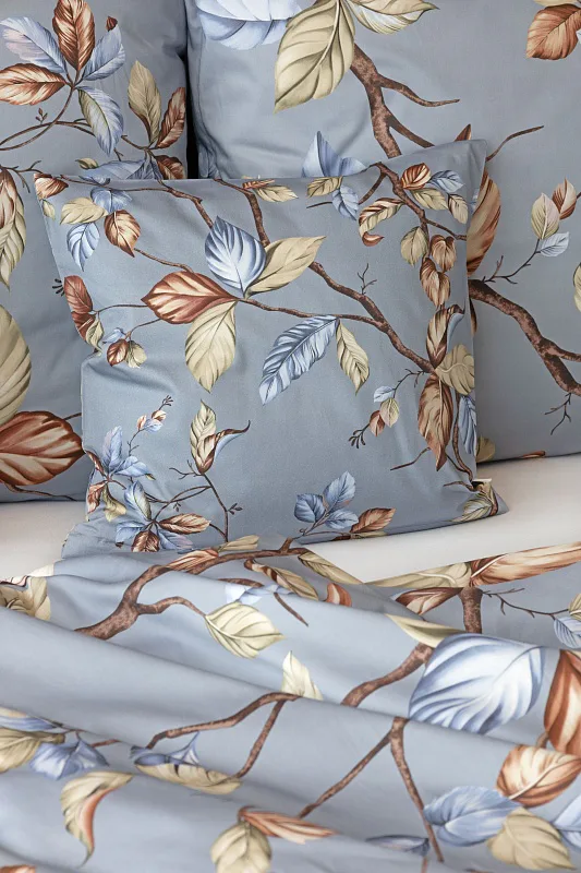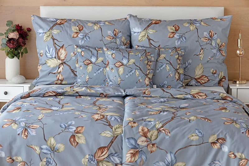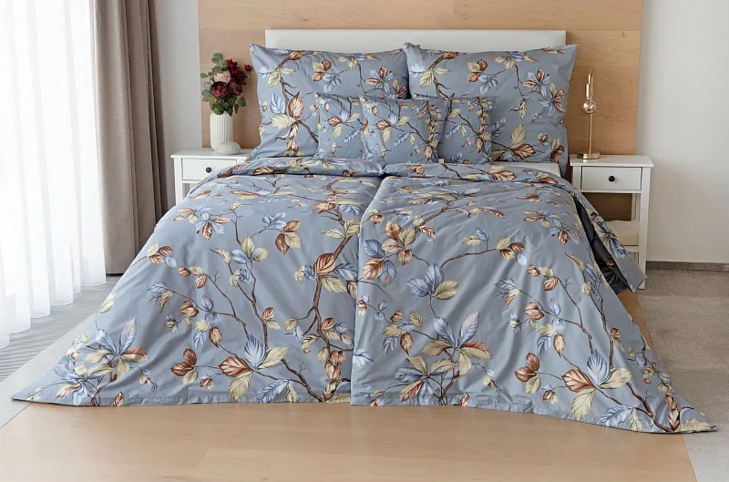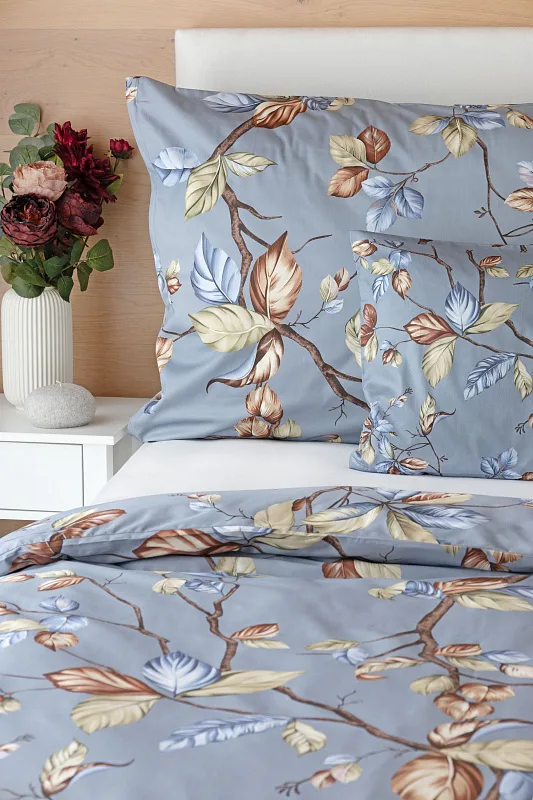 Ložní povlečení Nobilis vás nadchne ve všech ohledech. Na první pohled si zamilujete jednoduchý florální motiv v hřejivých barvách a na první dotek podlehnete kouzlu hebkého mako saténu ze 100% bavlny, který se postará o váš spokojený spánek. Podkladová barva ložního povlečení je kovově modrošedá.