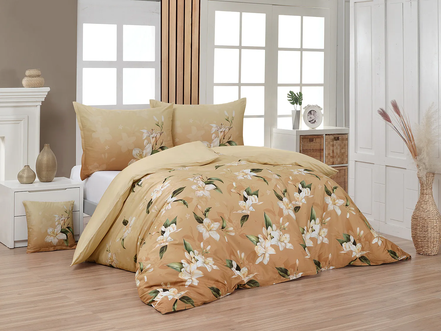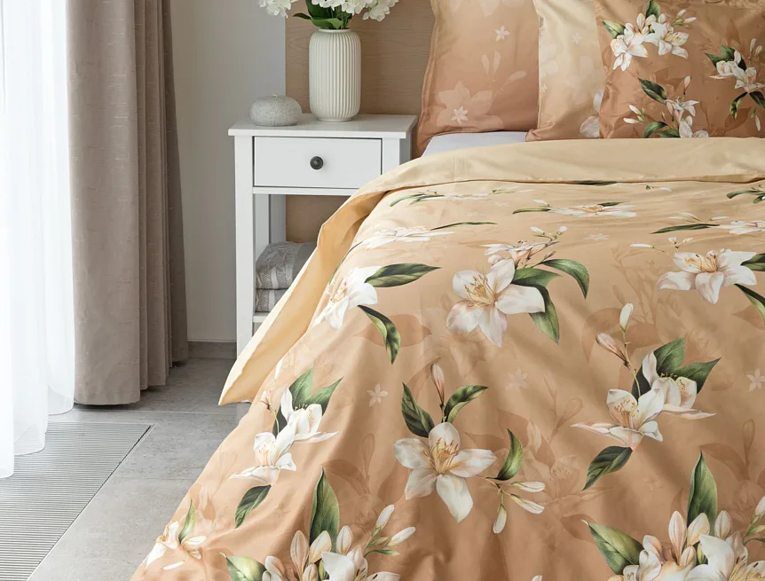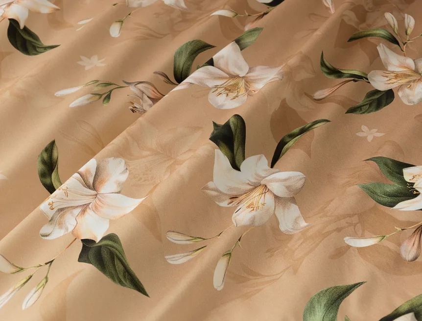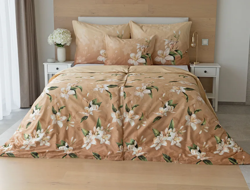 Saténové povlečení Nova s okouzlujícím motivem bílých lilií se stane elegantní ozdobou každého interiéru. Hřejivý oříškově hnědý podklad přechází postupně do béžového odstínu a dává vyniknout precizním detailům digitálního potisku.