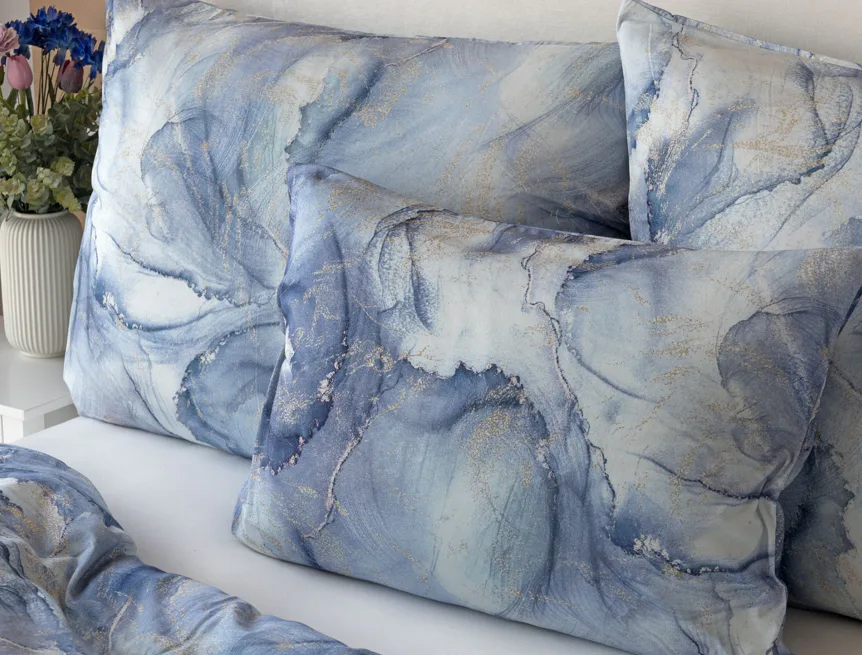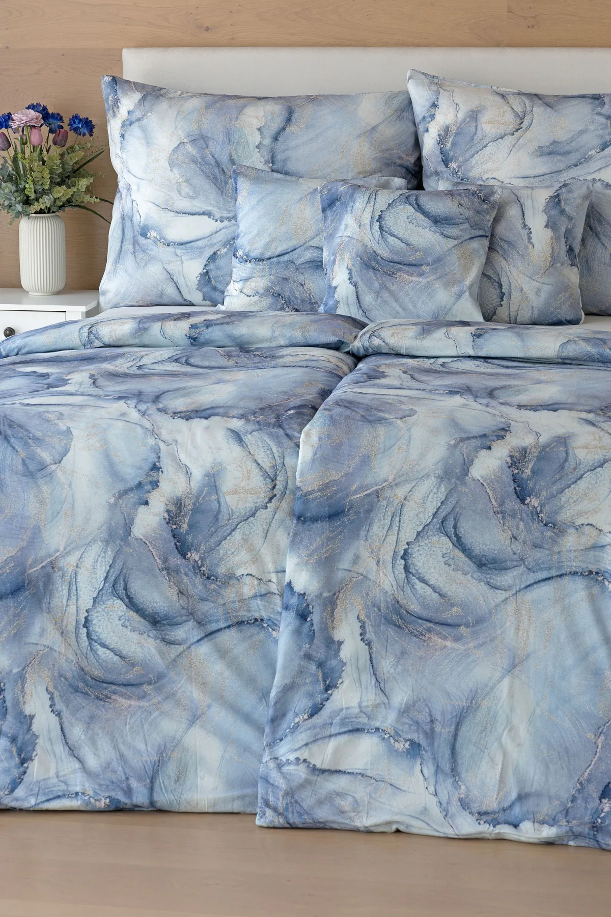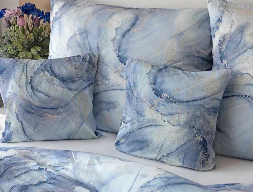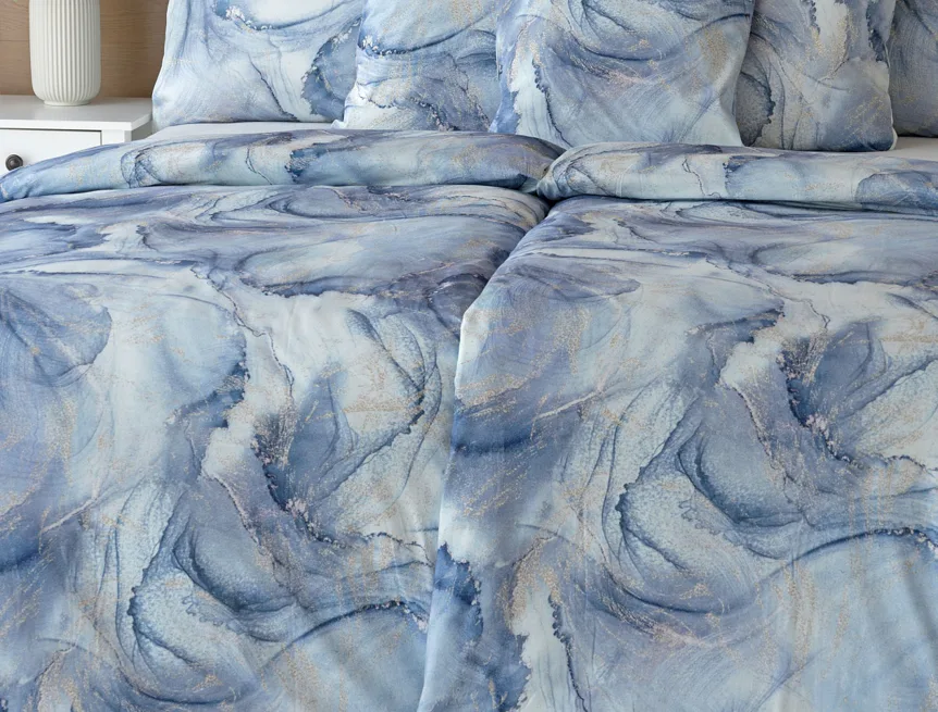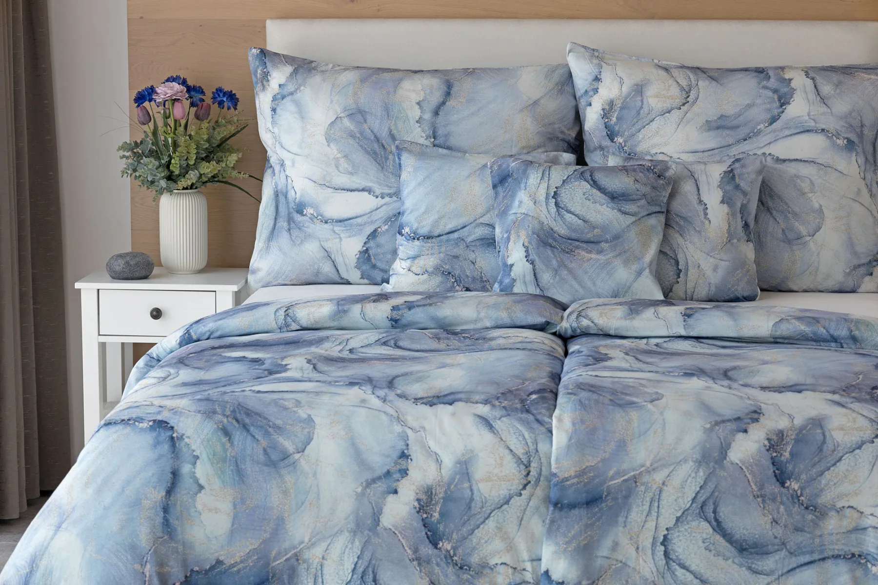 Pro novou kolekci ložního povlečení Mako jersey jsme pečlivě vybírali motivy, které tomuto pružnému materiálu sluší. Abstraktní vzor Odine, který je tvořen paletou modrých tónů protkaných zlatavými prvky, rozzáří vaši ložnici.