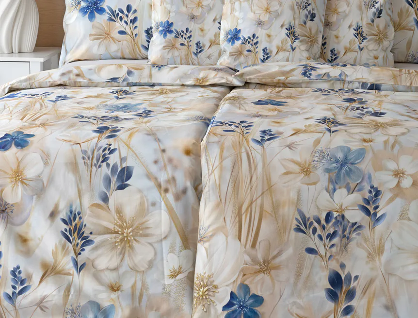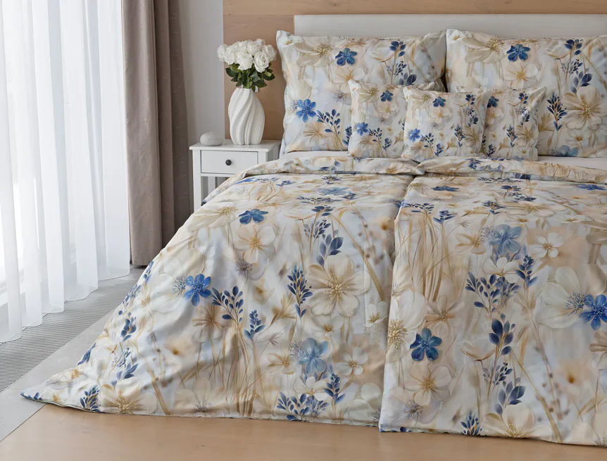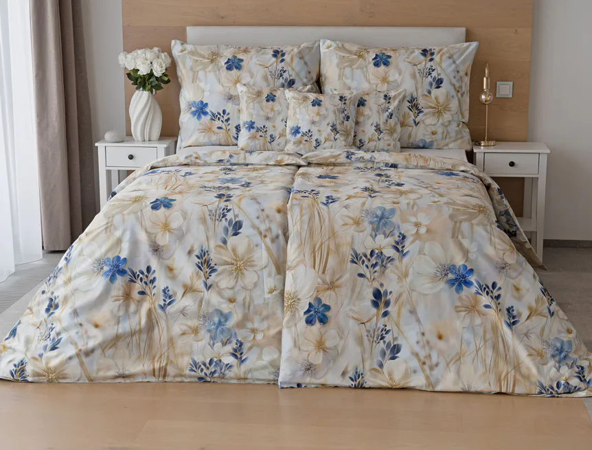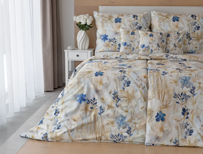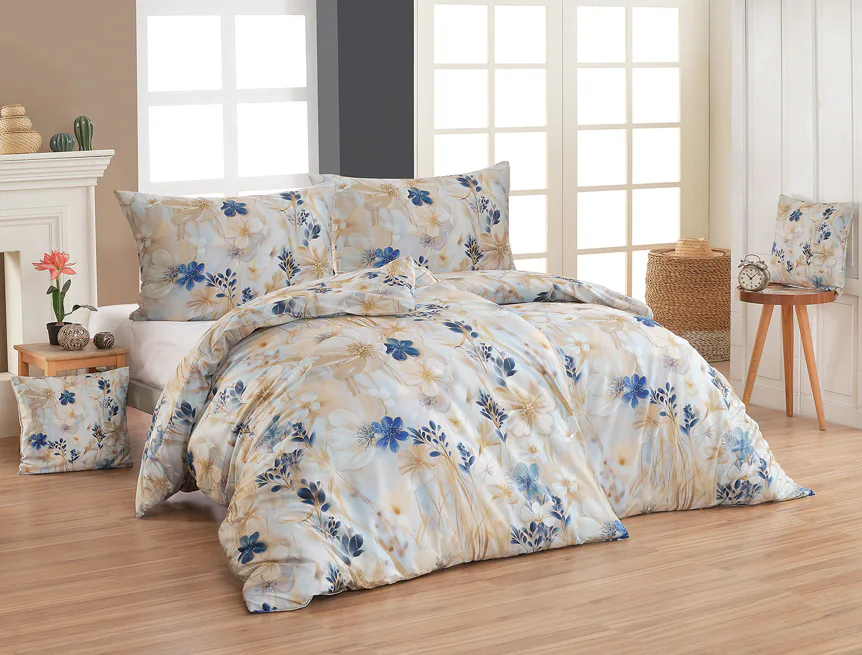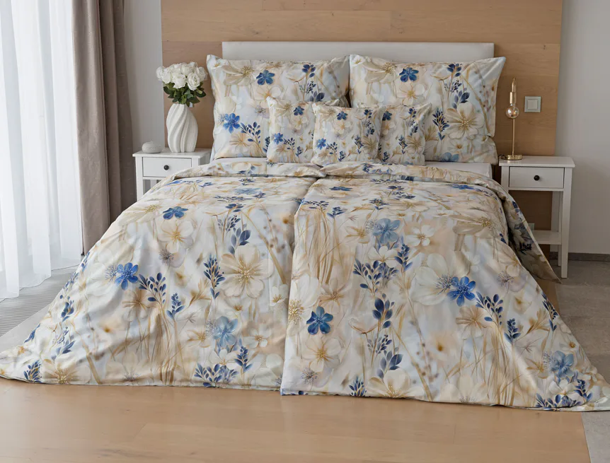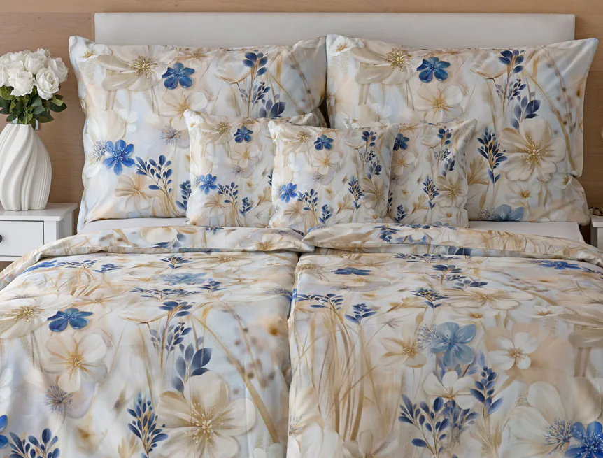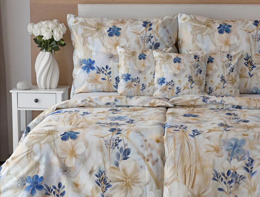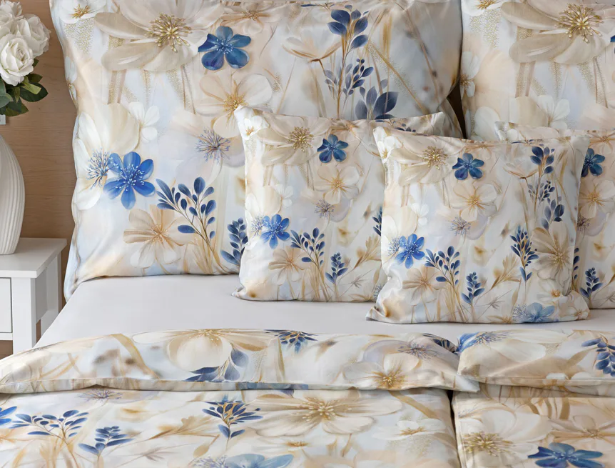 Decentní květinový vzor ložního povlečení Olivian vdechne vaší ložnici elegantní nádech a stane se originálním doplňkem v každé roční době. Hřejivé přírodní tóny florálního motivu doplňují modré květy, které dotváří uklidňující atmostéru. O precizní detail květinového vzoru se postarala nejmodernější digitální tisková technologie a decentní lesk bavlněného saténu podtrhuje eleganci tohoto ložního povlečení.