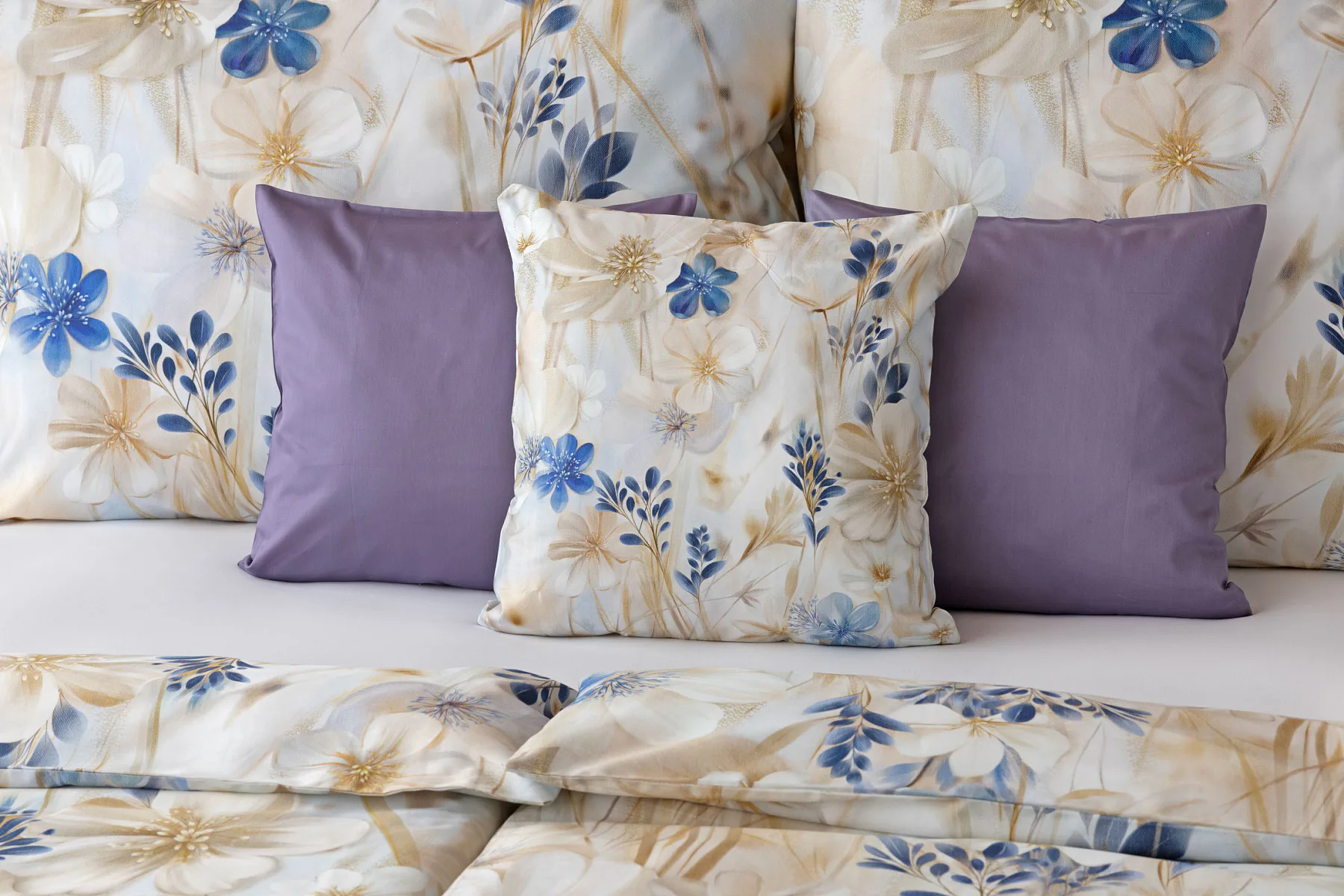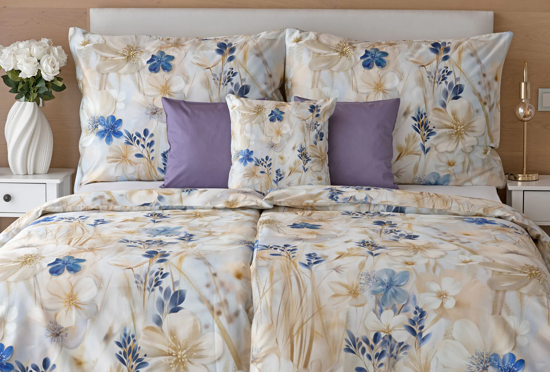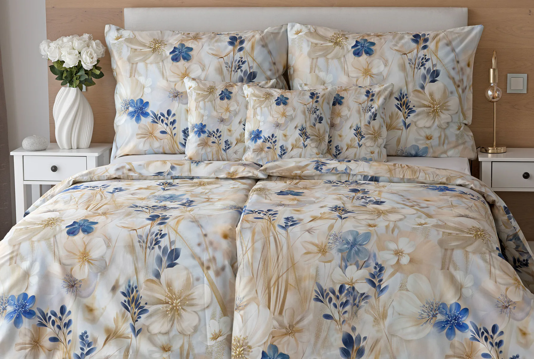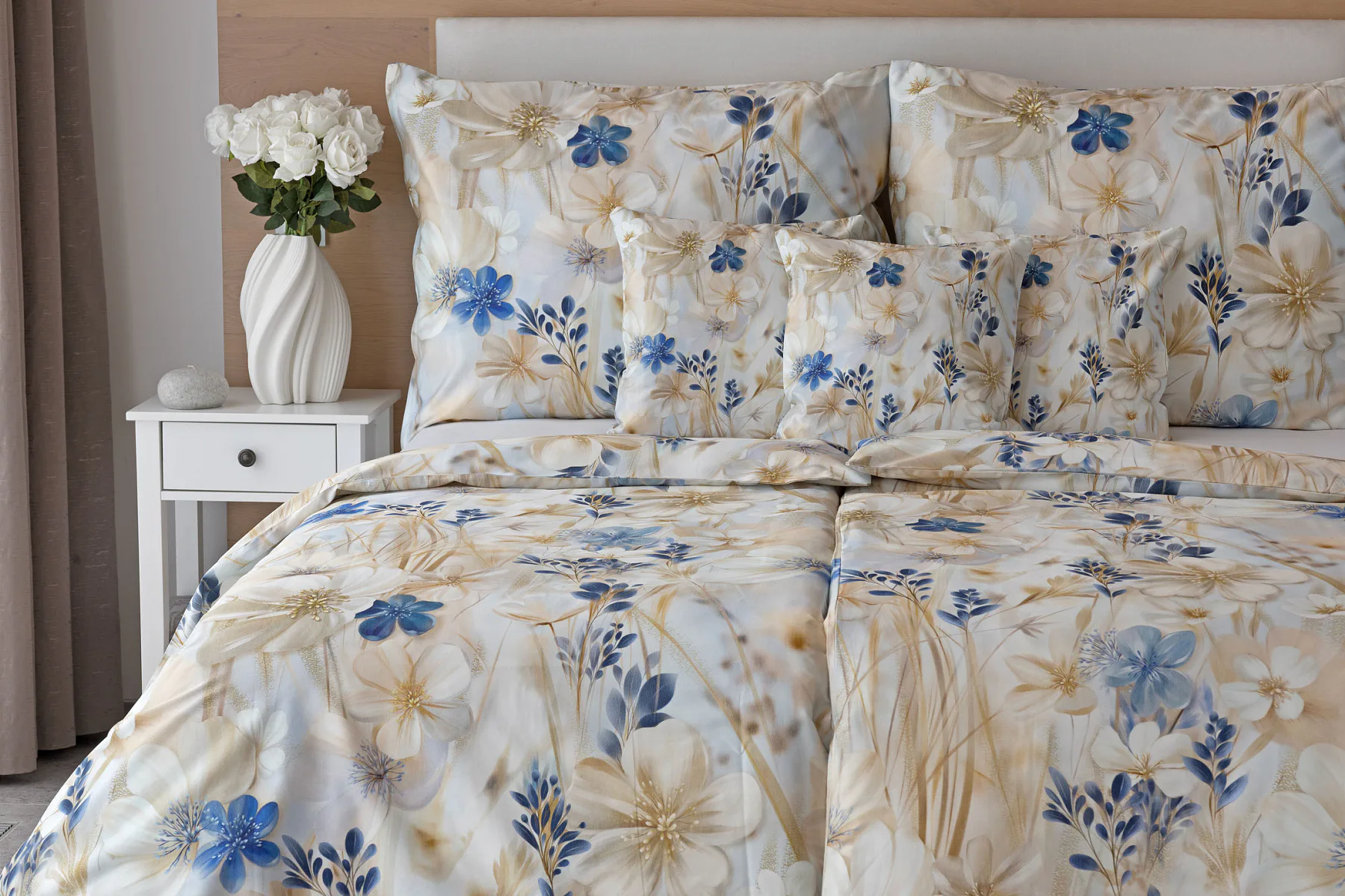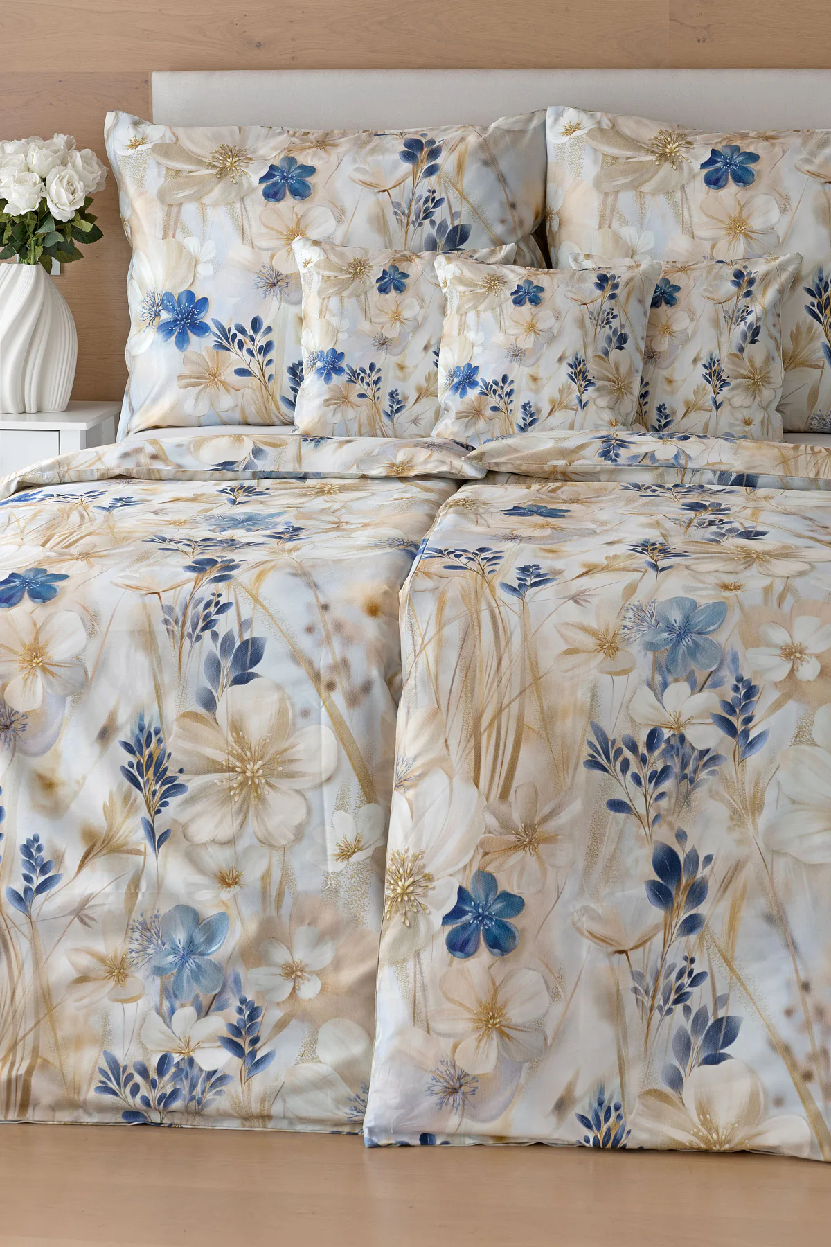 Decentní květinový vzor ložního povlečení Olivian vdechne vaší ložnici elegantní nádech a stane se originálním doplňkem v každé roční době. Hřejivé přírodní tóny florálního motivu doplňují modré květy, které dotváří uklidňující atmostéru. O precizní detail květinového vzoru se postarala nejmodernější digitální tisková technologie a decentní lesk bavlněného saténu podtrhuje eleganci tohoto ložního povlečení.