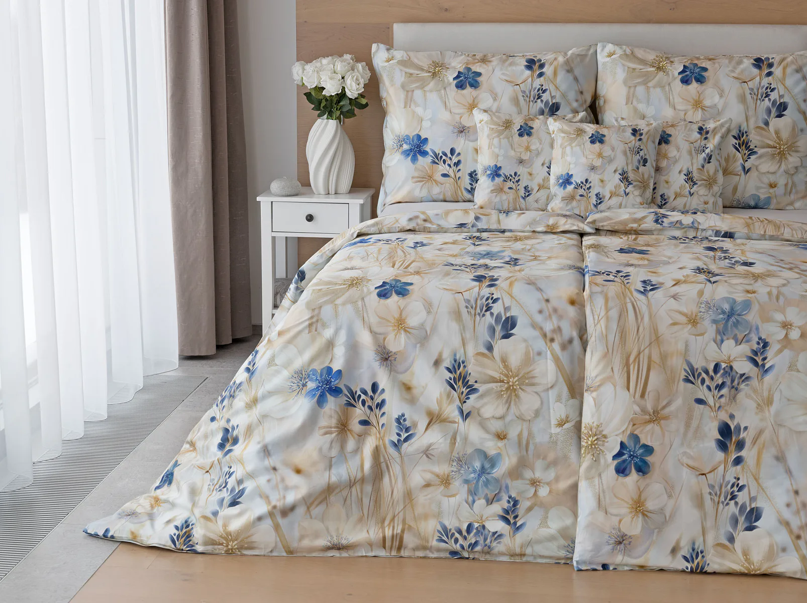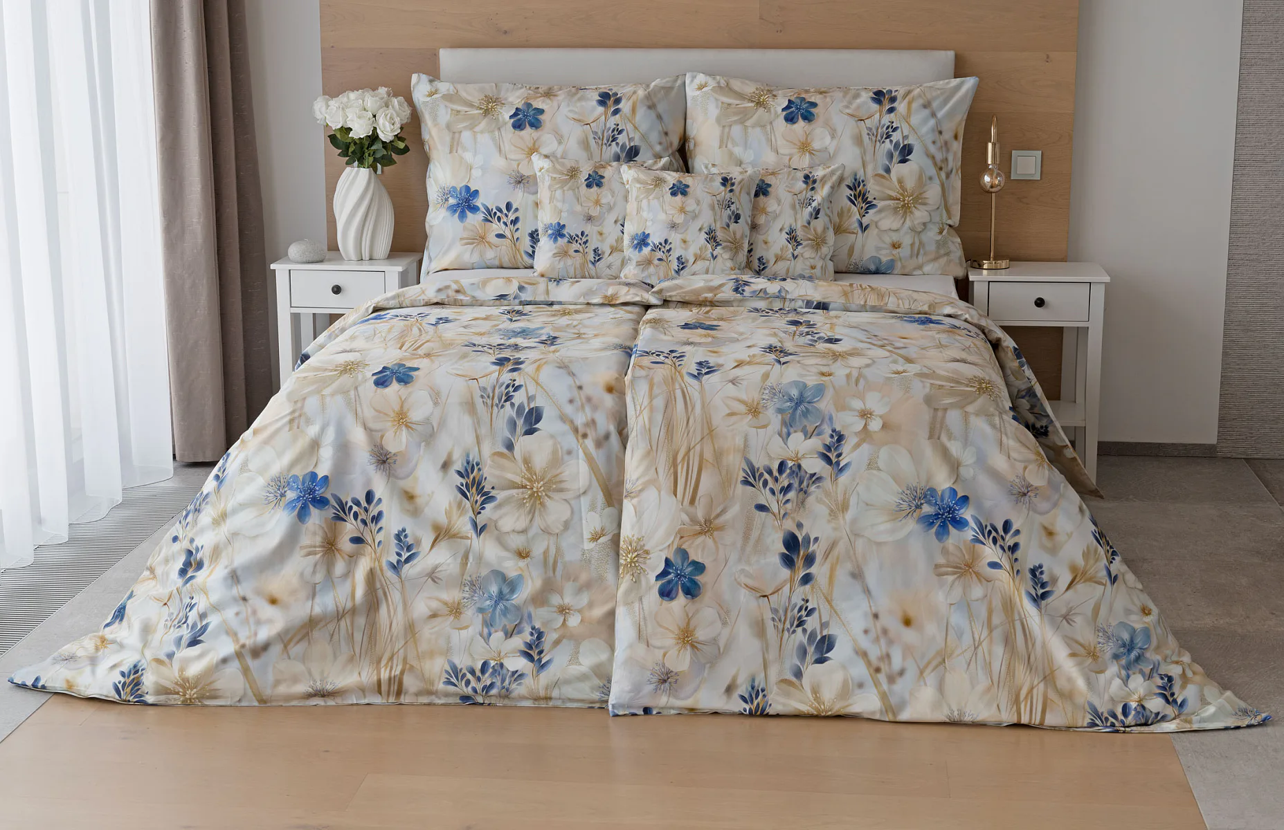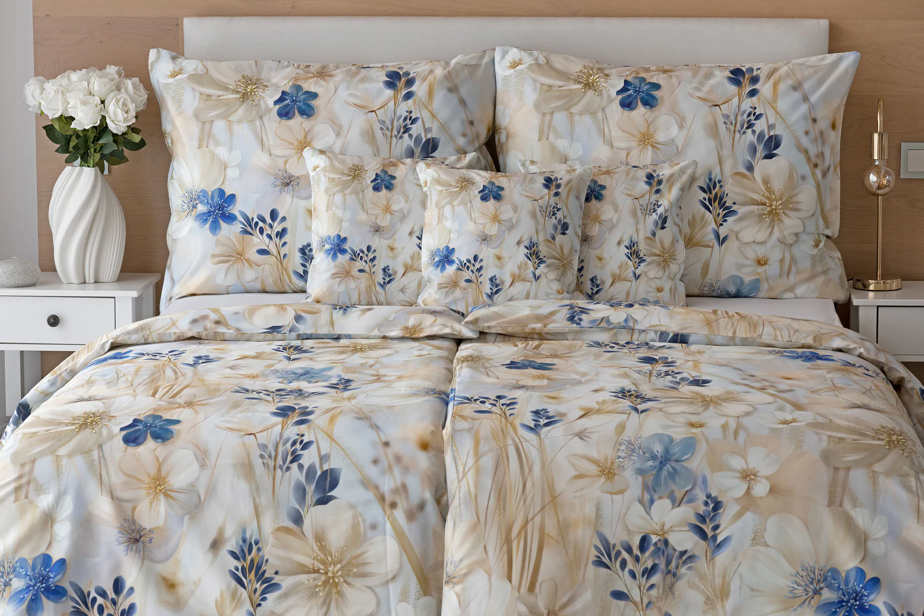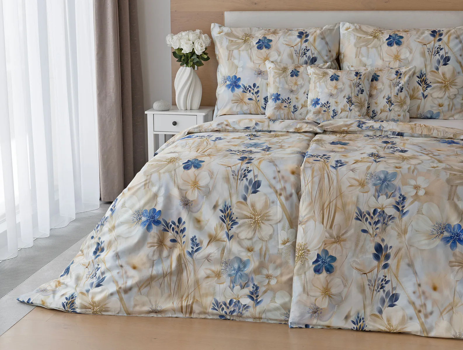 Decentní květinový vzor ložního povlečení Olivian vdechne vaší ložnici elegantní nádech a stane se originálním doplňkem v každé roční době. Hřejivé přírodní tóny florálního motivu doplňují modré květy, které dotváří uklidňující atmostéru. O precizní detail květinového vzoru se postarala nejmodernější digitální tisková technologie a decentní lesk bavlněného saténu podtrhuje eleganci tohoto ložního povlečení.