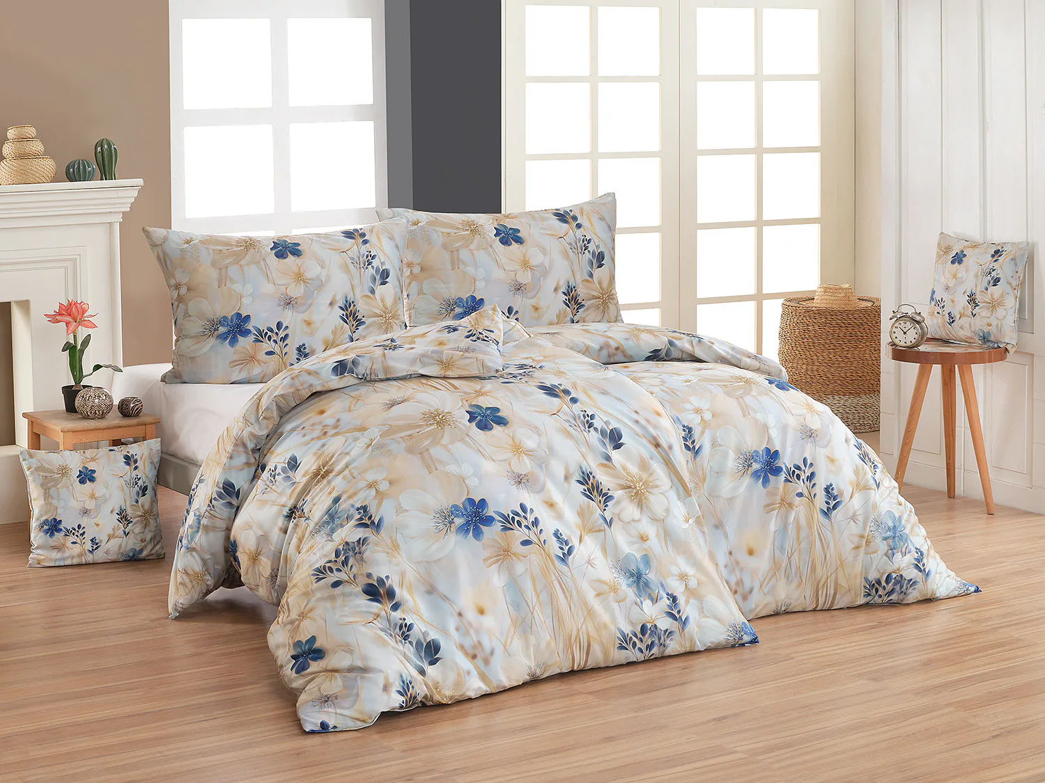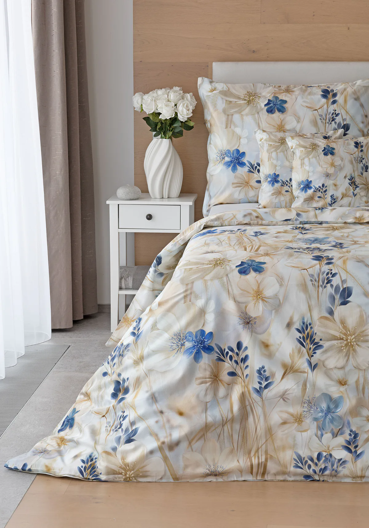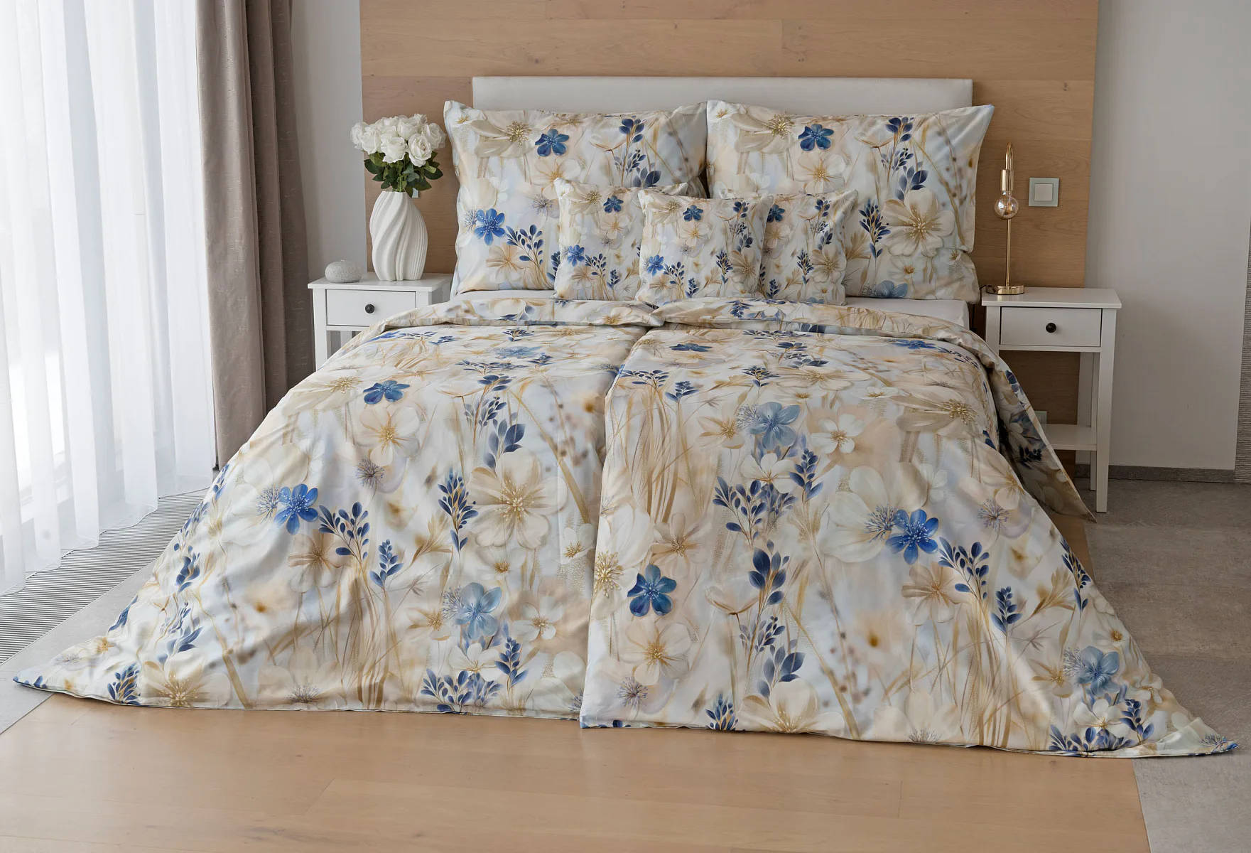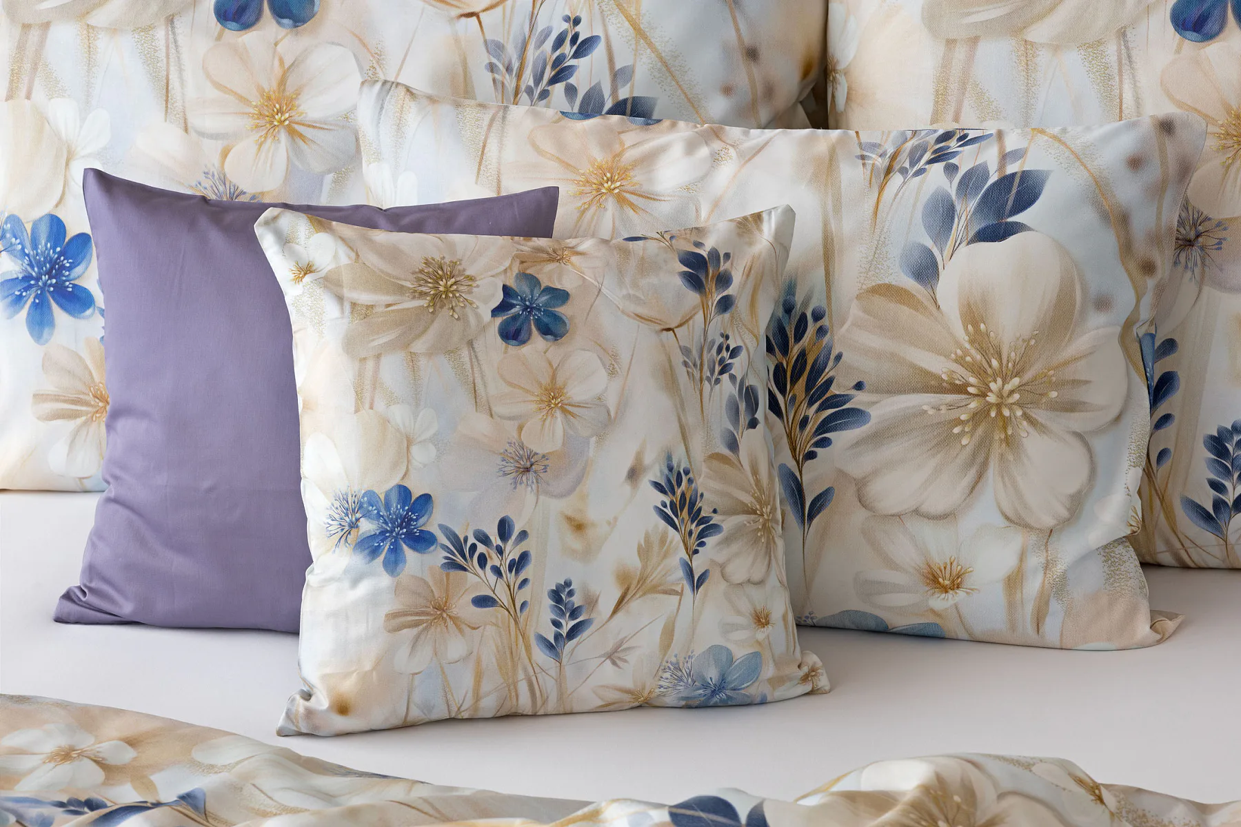 Decentní květinový vzor ložního povlečení Olivian vdechne vaší ložnici elegantní nádech a stane se originálním doplňkem v každé roční době. Hřejivé přírodní tóny florálního motivu doplňují modré květy, které dotváří uklidňující atmostéru. O precizní detail květinového vzoru se postarala nejmodernější digitální tisková technologie a decentní lesk bavlněného saténu podtrhuje eleganci tohoto ložního povlečení.