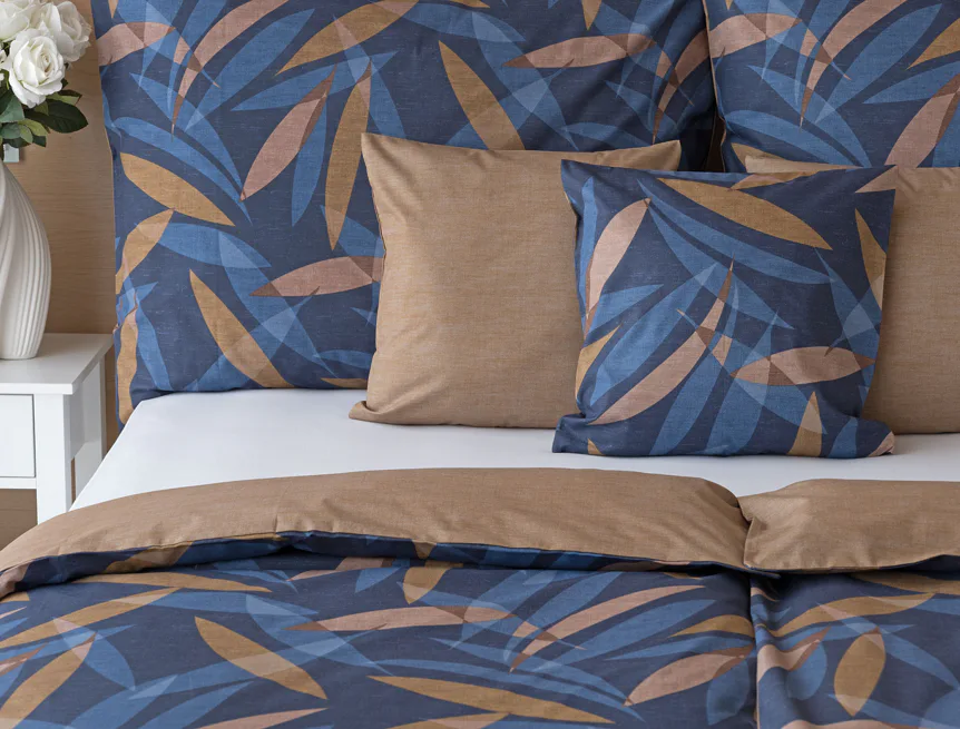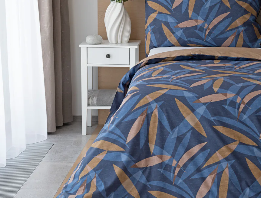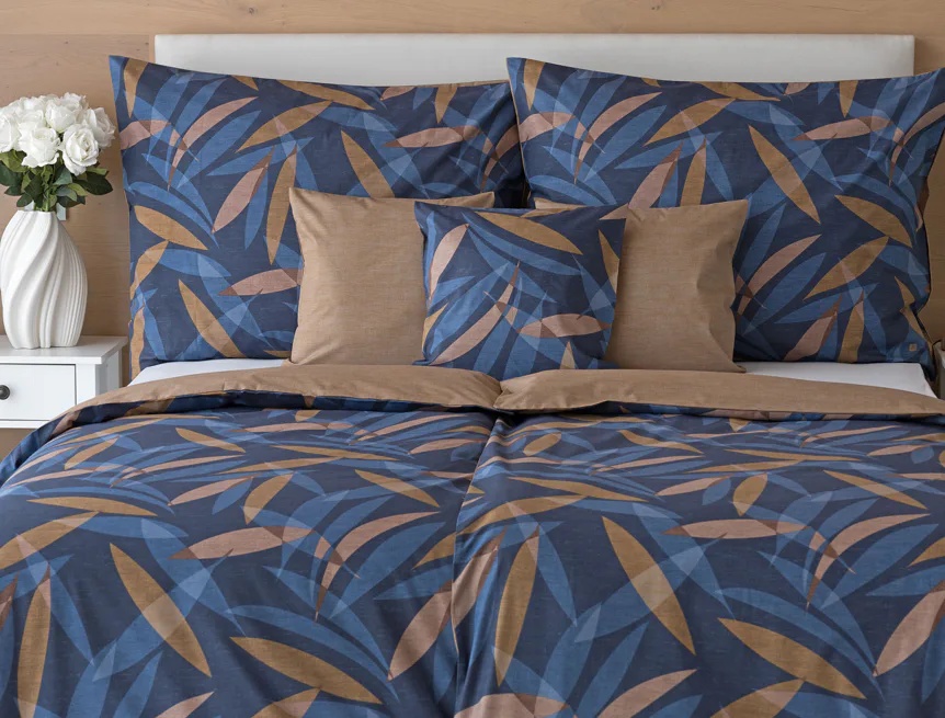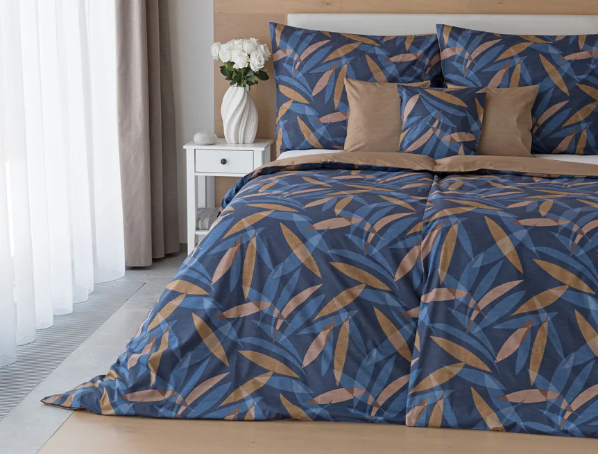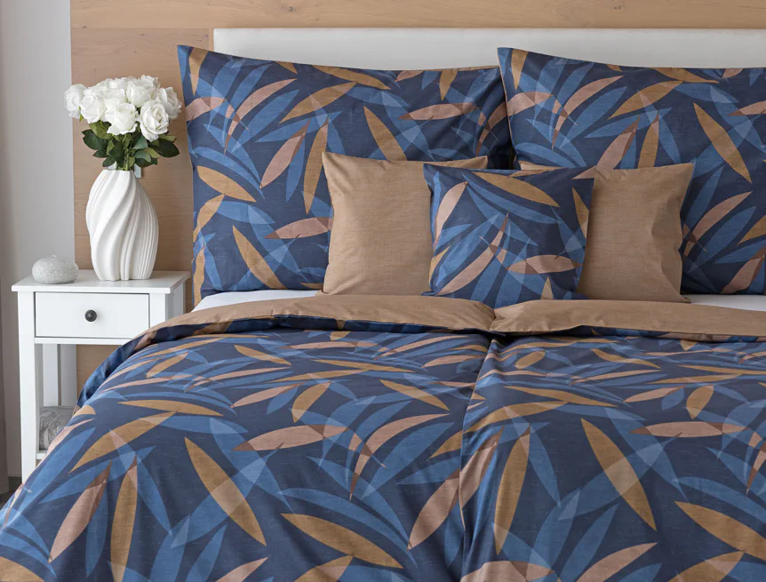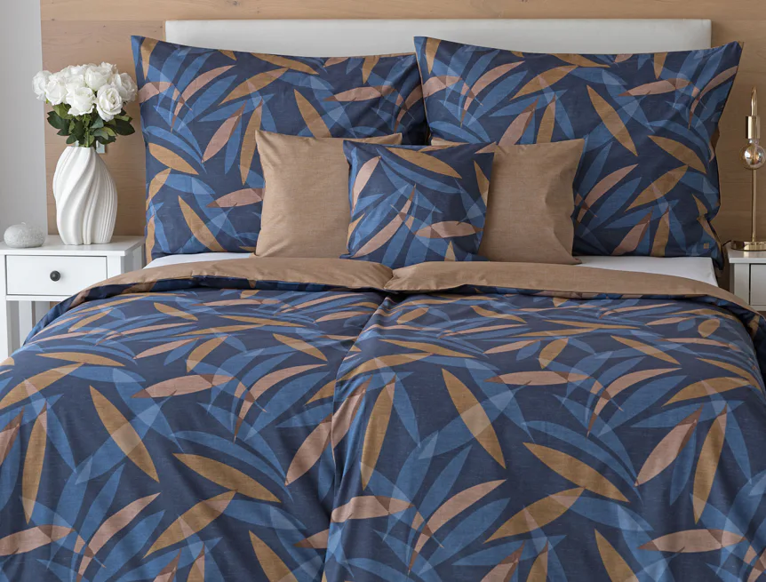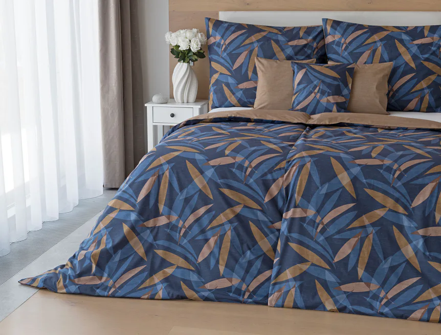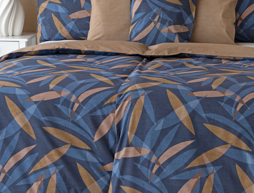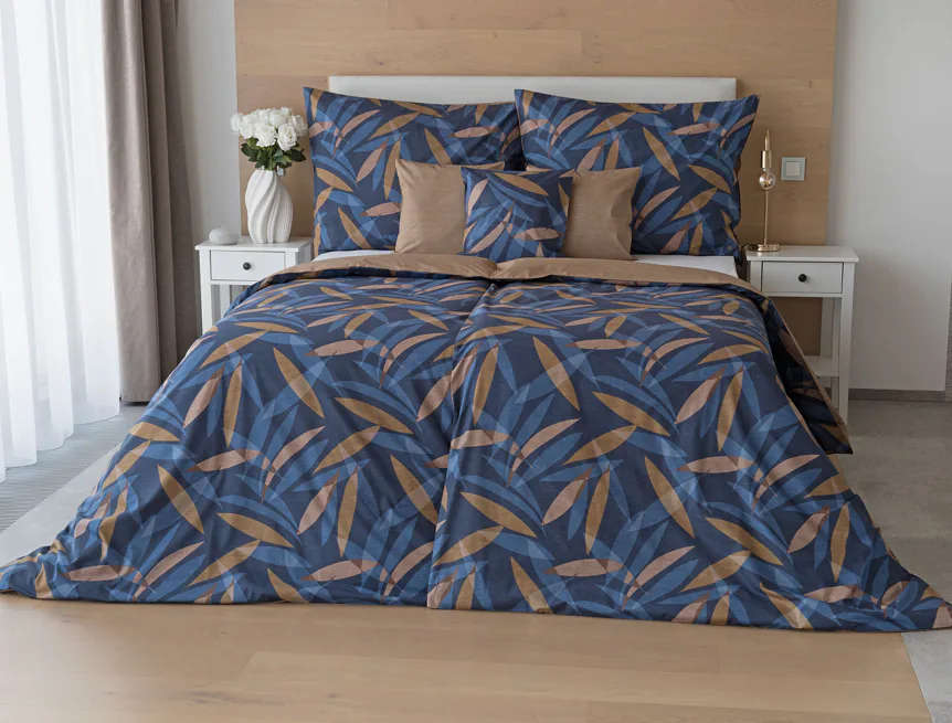 Vneste do své ložnice harmonii přírody v moderním pojetí. Bavlněné povlečení Orlando zdobí na vrchní straně výrazný abstraktní motiv, který kombinuje tóny modré a hnědé barvy na temně modrém podkladu. Prolínající se prvky ve tvaru listů vytvářejí dynamický, ale zároveň uklidňující celek. Spodní strana povlečení nabízí příjemný kontrast v podobě jednobarevného hnědého podkladu se strukturou přírodního plátna. Tento originální vzor oživí jak minimalistický, tak přírodně laděný interiér.