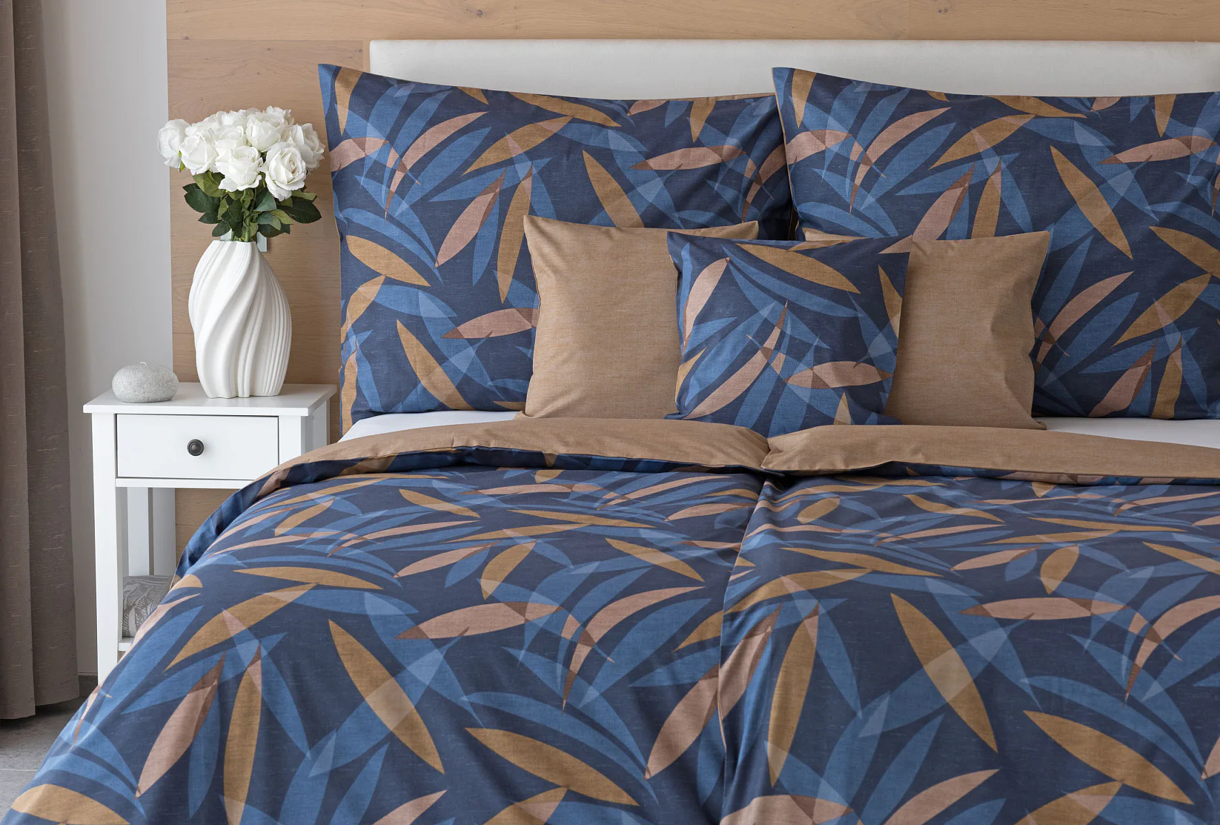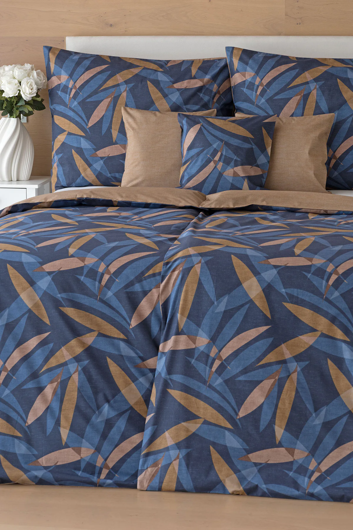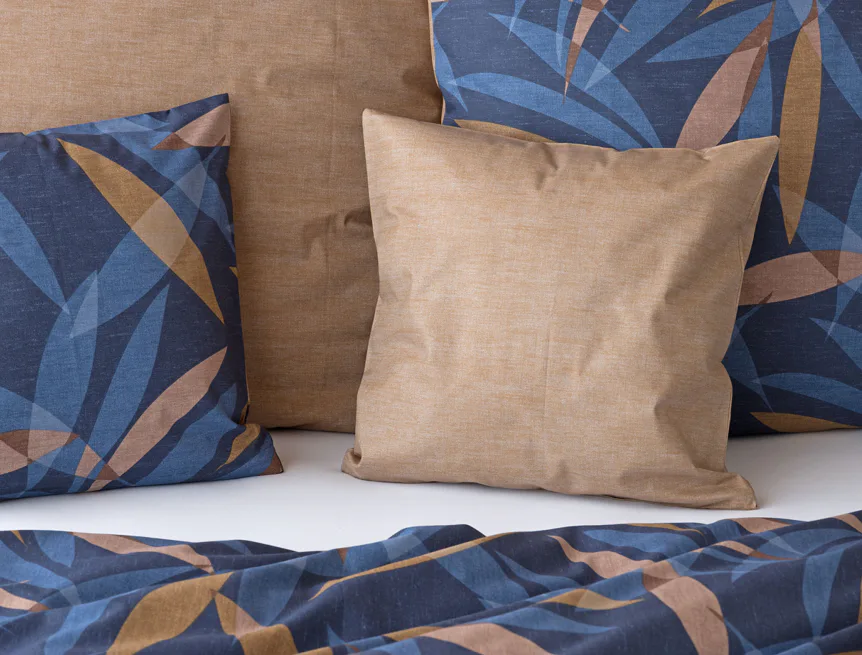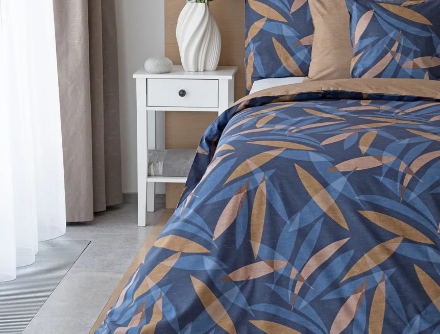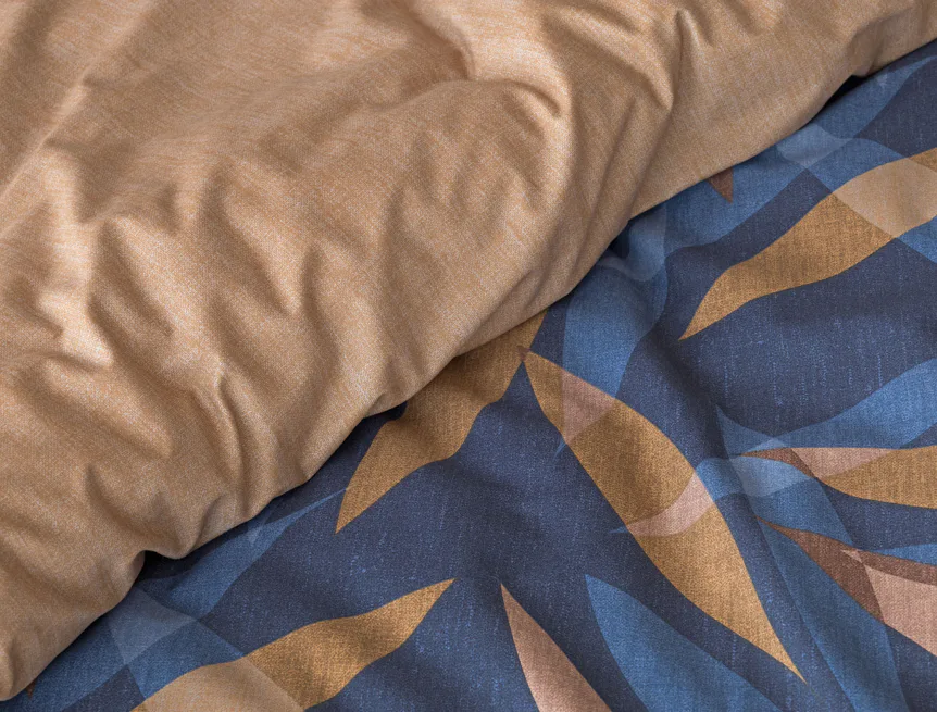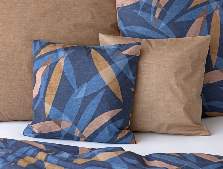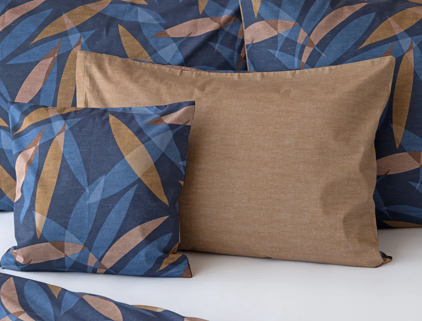 Vneste do své ložnice harmonii přírody v moderním pojetí. Bavlněné povlečení Orlando zdobí na vrchní straně výrazný abstraktní motiv, který kombinuje tóny modré a hnědé barvy na temně modrém podkladu. Prolínající se prvky ve tvaru listů vytvářejí dynamický, ale zároveň uklidňující celek. Spodní strana povlečení nabízí příjemný kontrast v podobě jednobarevného hnědého podkladu se strukturou přírodního plátna. Tento originální vzor oživí jak minimalistický, tak přírodně laděný interiér.