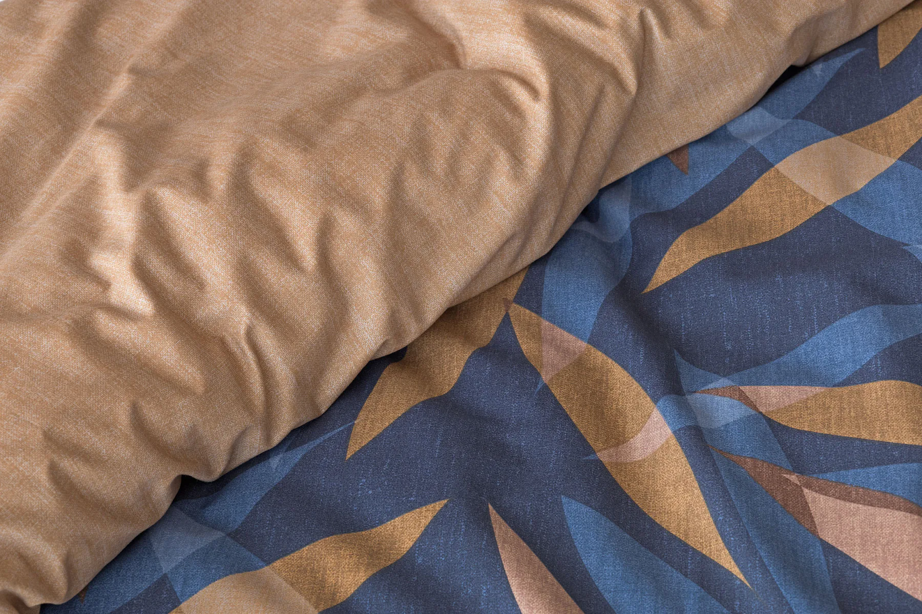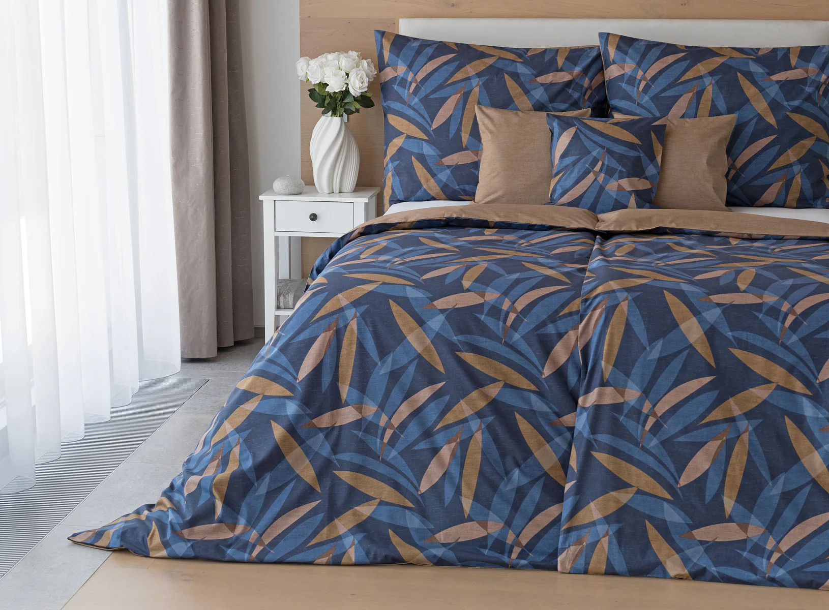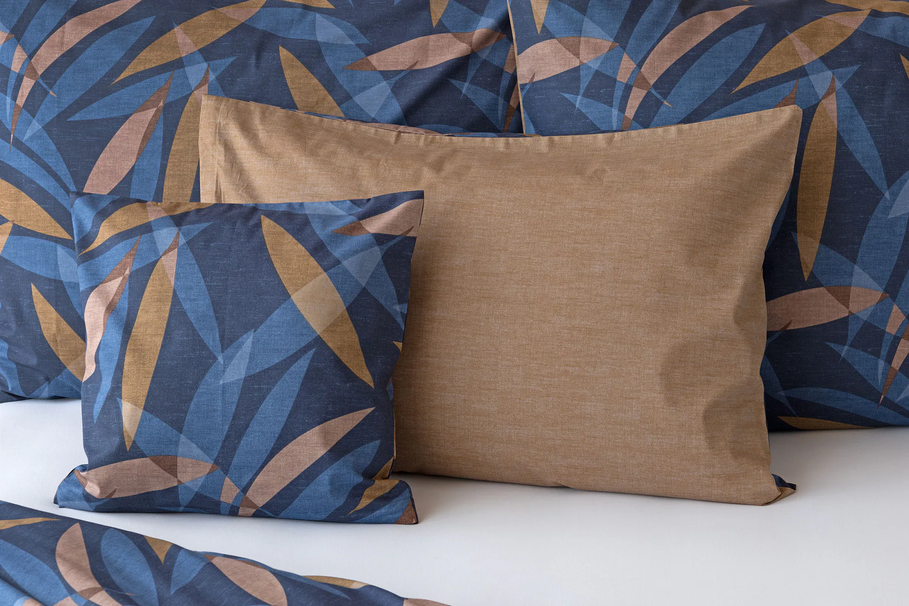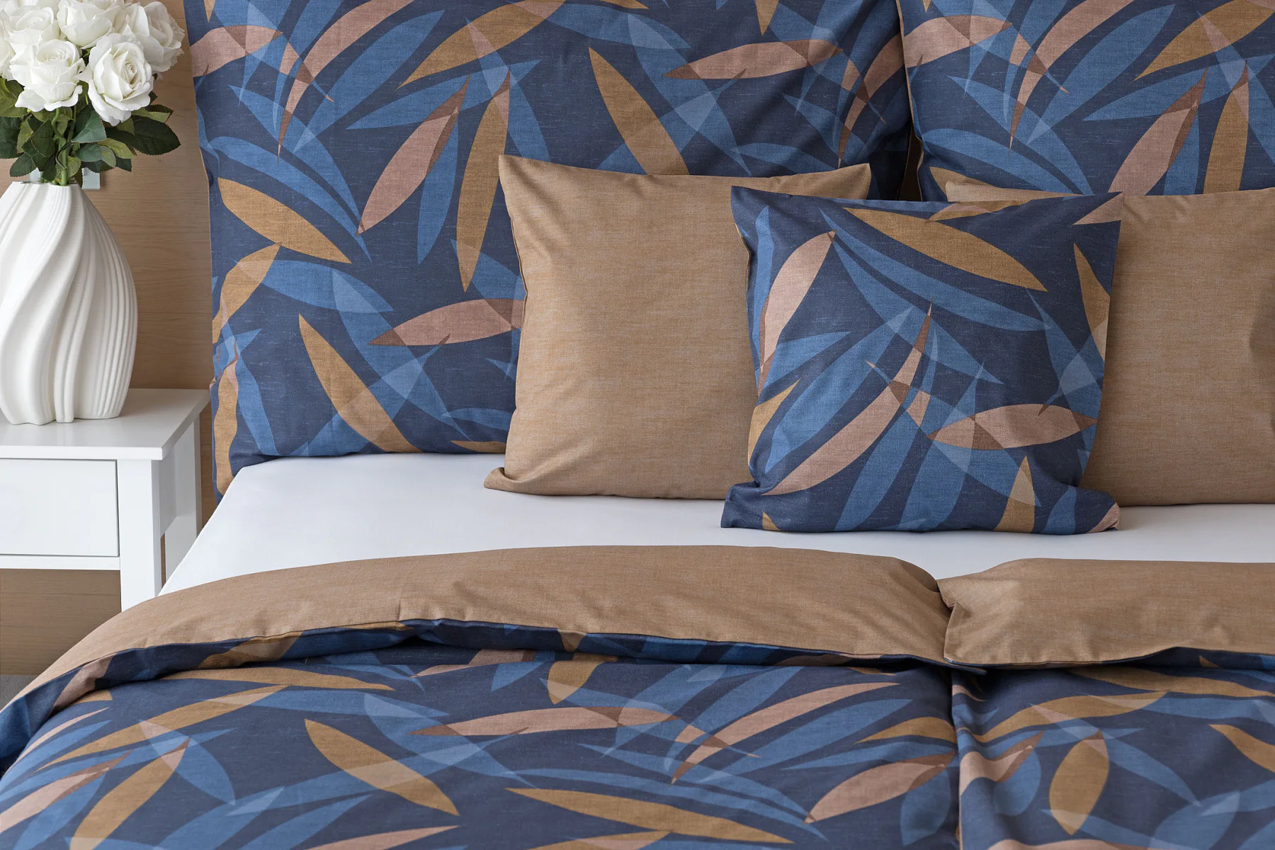 Vneste do své ložnice harmonii přírody v moderním pojetí. Bavlněné povlečení Orlando zdobí na vrchní straně výrazný abstraktní motiv, který kombinuje tóny modré a hnědé barvy na temně modrém podkladu. Prolínající se prvky ve tvaru listů vytvářejí dynamický, ale zároveň uklidňující celek. Spodní strana povlečení nabízí příjemný kontrast v podobě jednobarevného hnědého podkladu se strukturou přírodního plátna. Tento originální vzor oživí jak minimalistický, tak přírodně laděný interiér.