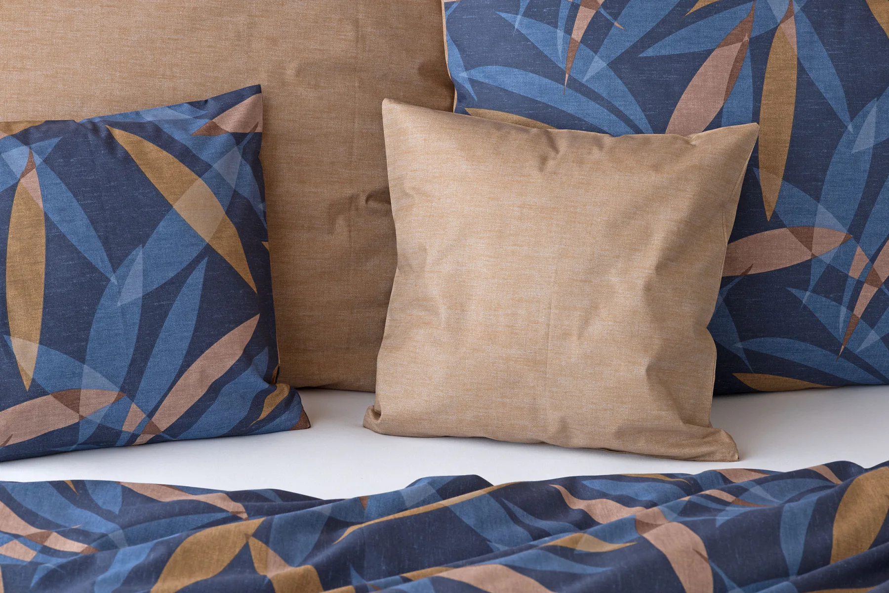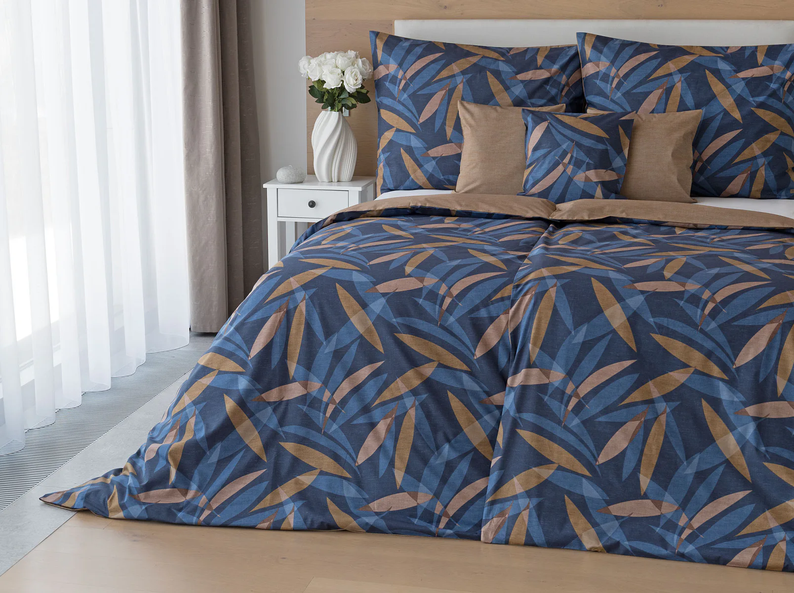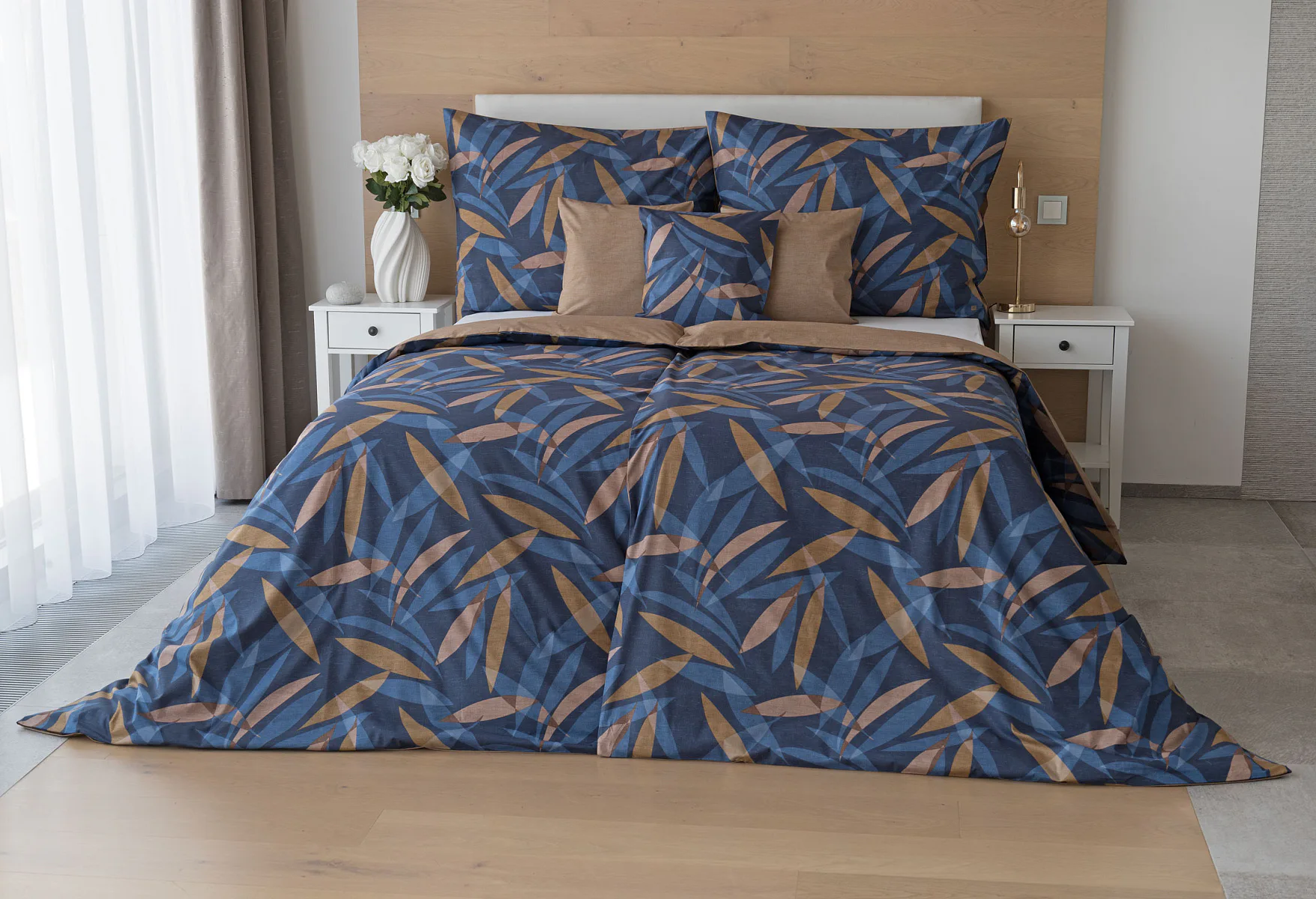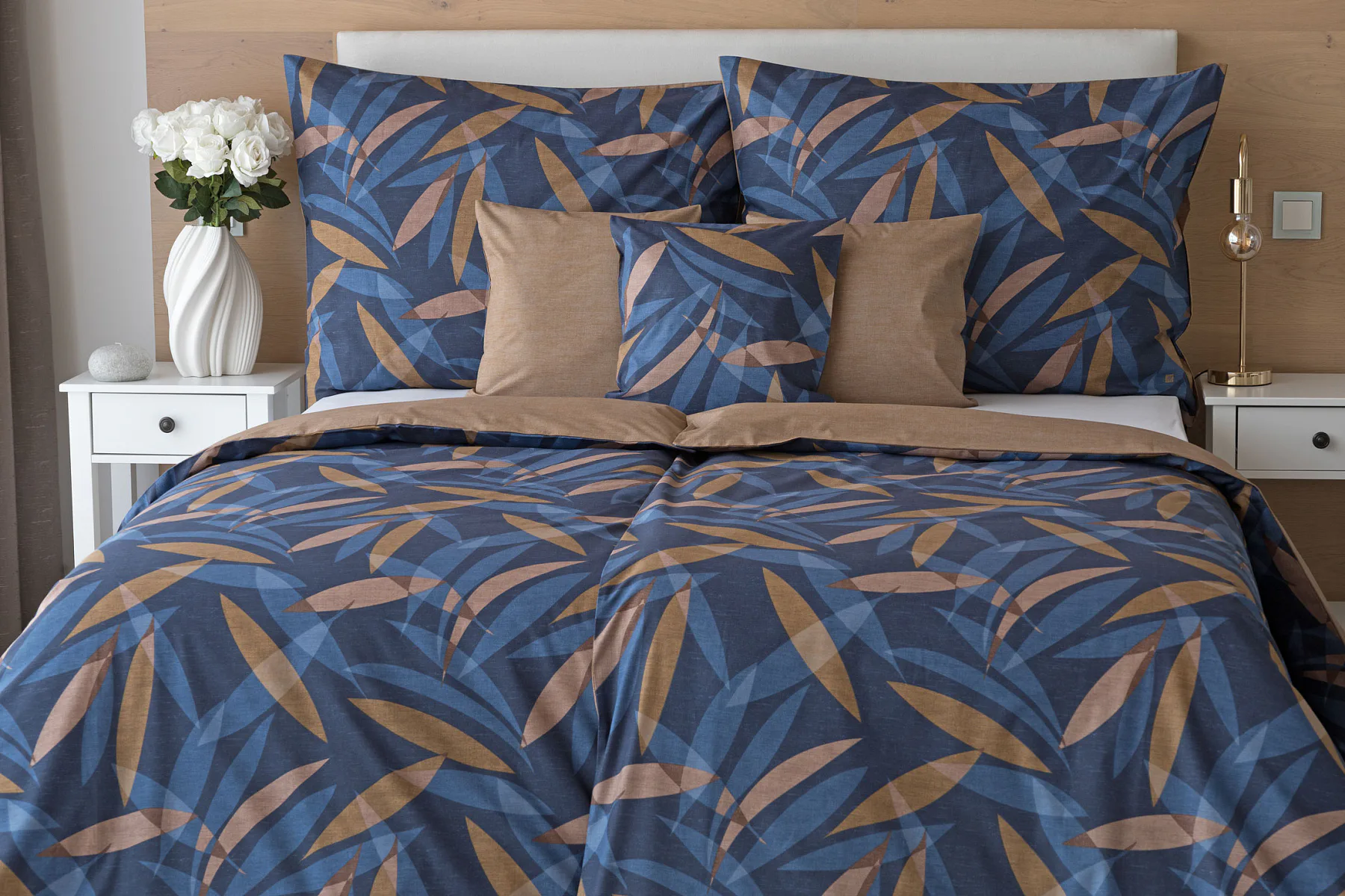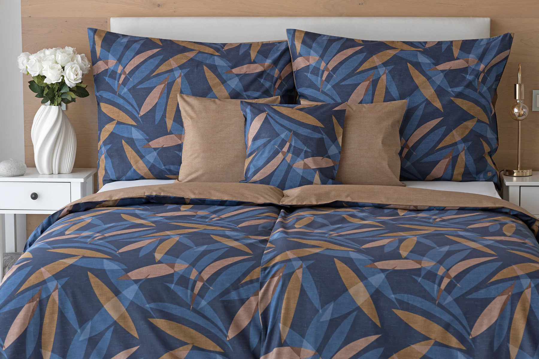 Vneste do své ložnice harmonii přírody v moderním pojetí. Bavlněné povlečení Orlando zdobí na vrchní straně výrazný abstraktní motiv, který kombinuje tóny modré a hnědé barvy na temně modrém podkladu. Prolínající se prvky ve tvaru listů vytvářejí dynamický, ale zároveň uklidňující celek. Spodní strana povlečení nabízí příjemný kontrast v podobě jednobarevného hnědého podkladu se strukturou přírodního plátna. Tento originální vzor oživí jak minimalistický, tak přírodně laděný interiér.