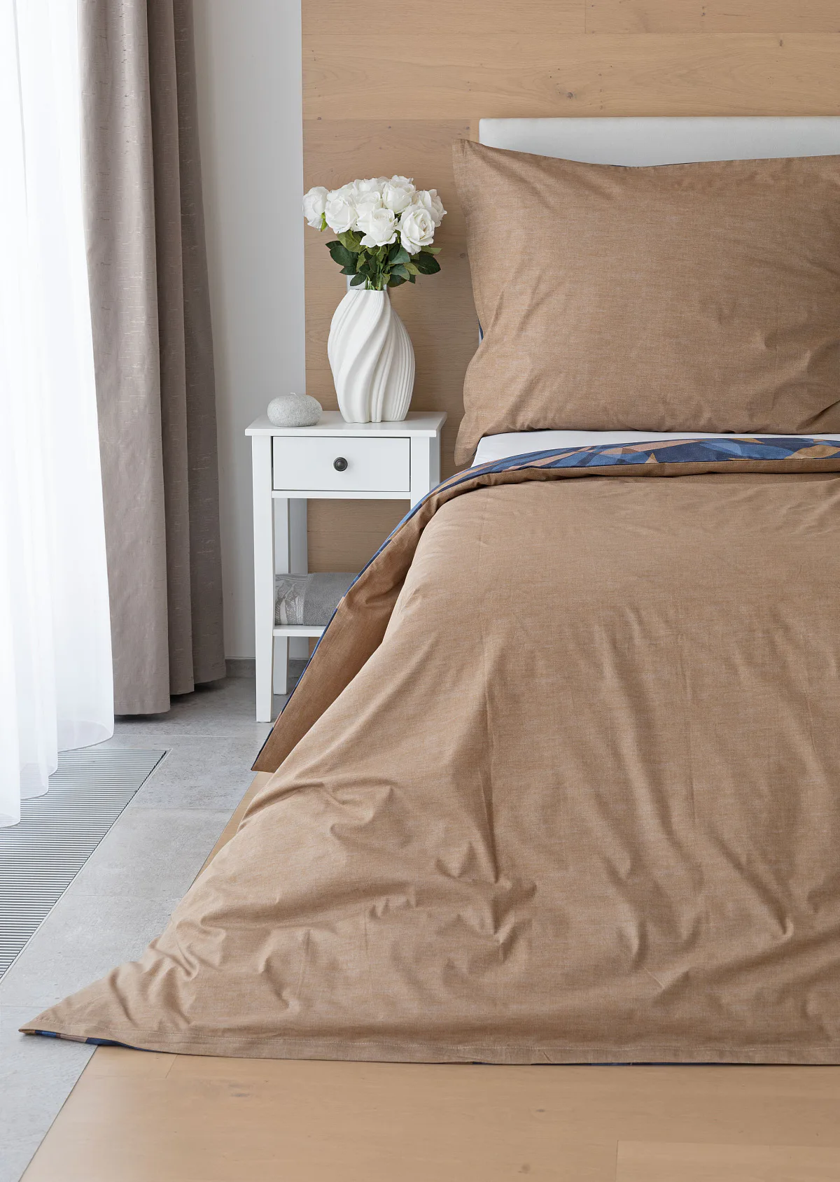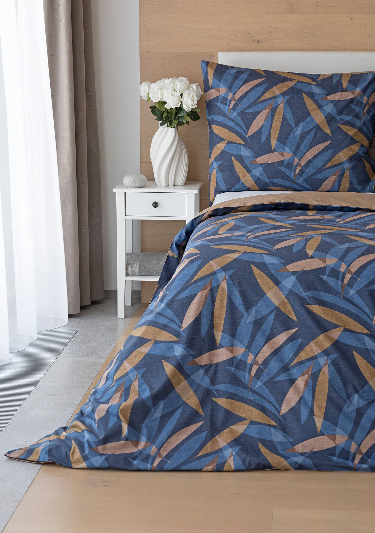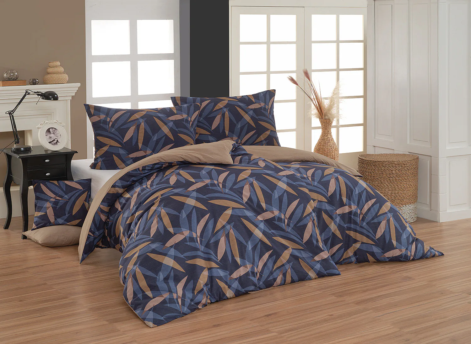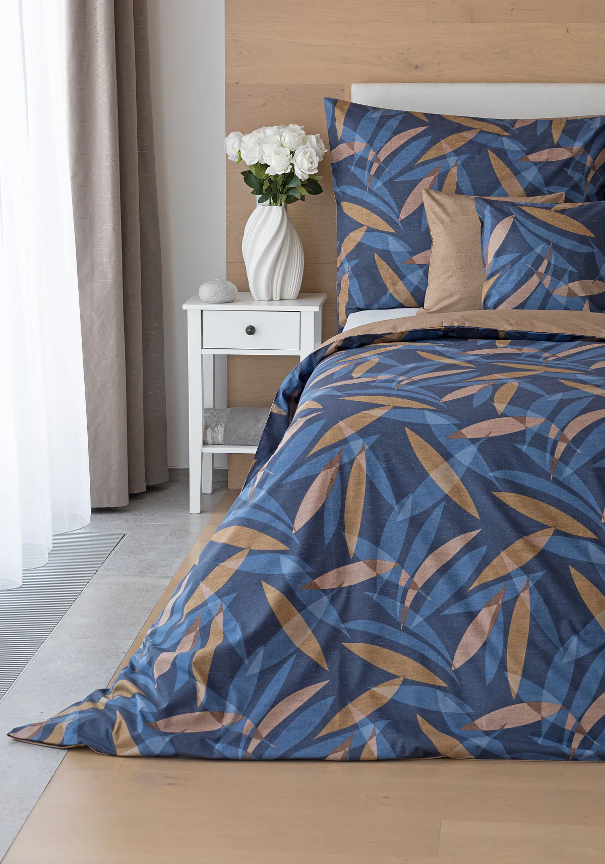 Vneste do své ložnice harmonii přírody v moderním pojetí. Bavlněné povlečení Orlando zdobí na vrchní straně výrazný abstraktní motiv, který kombinuje tóny modré a hnědé barvy na temně modrém podkladu. Prolínající se prvky ve tvaru listů vytvářejí dynamický, ale zároveň uklidňující celek. Spodní strana povlečení nabízí příjemný kontrast v podobě jednobarevného hnědého podkladu se strukturou přírodního plátna. Tento originální vzor oživí jak minimalistický, tak přírodně laděný interiér.