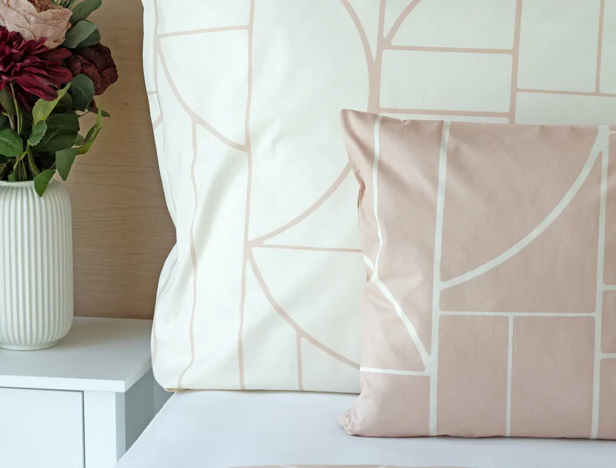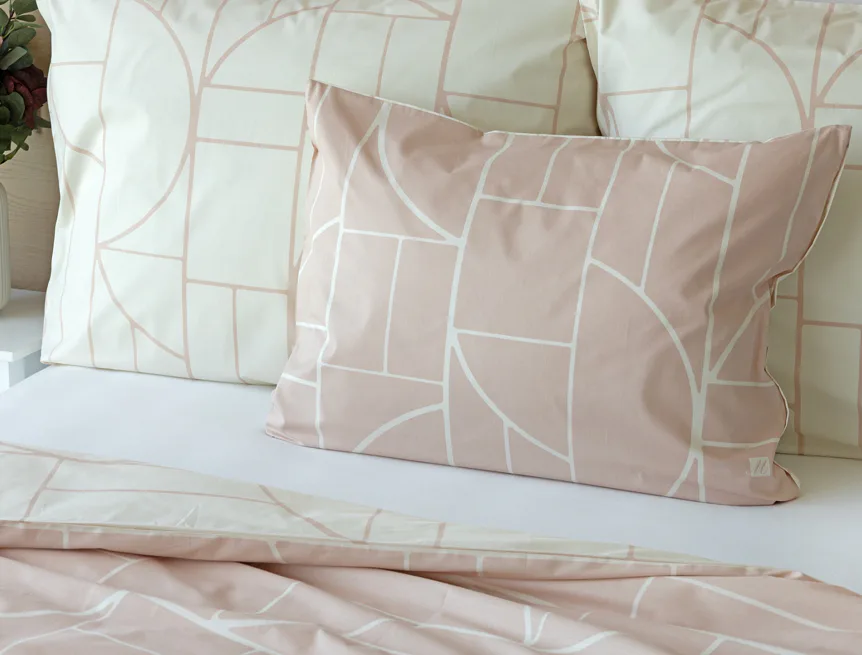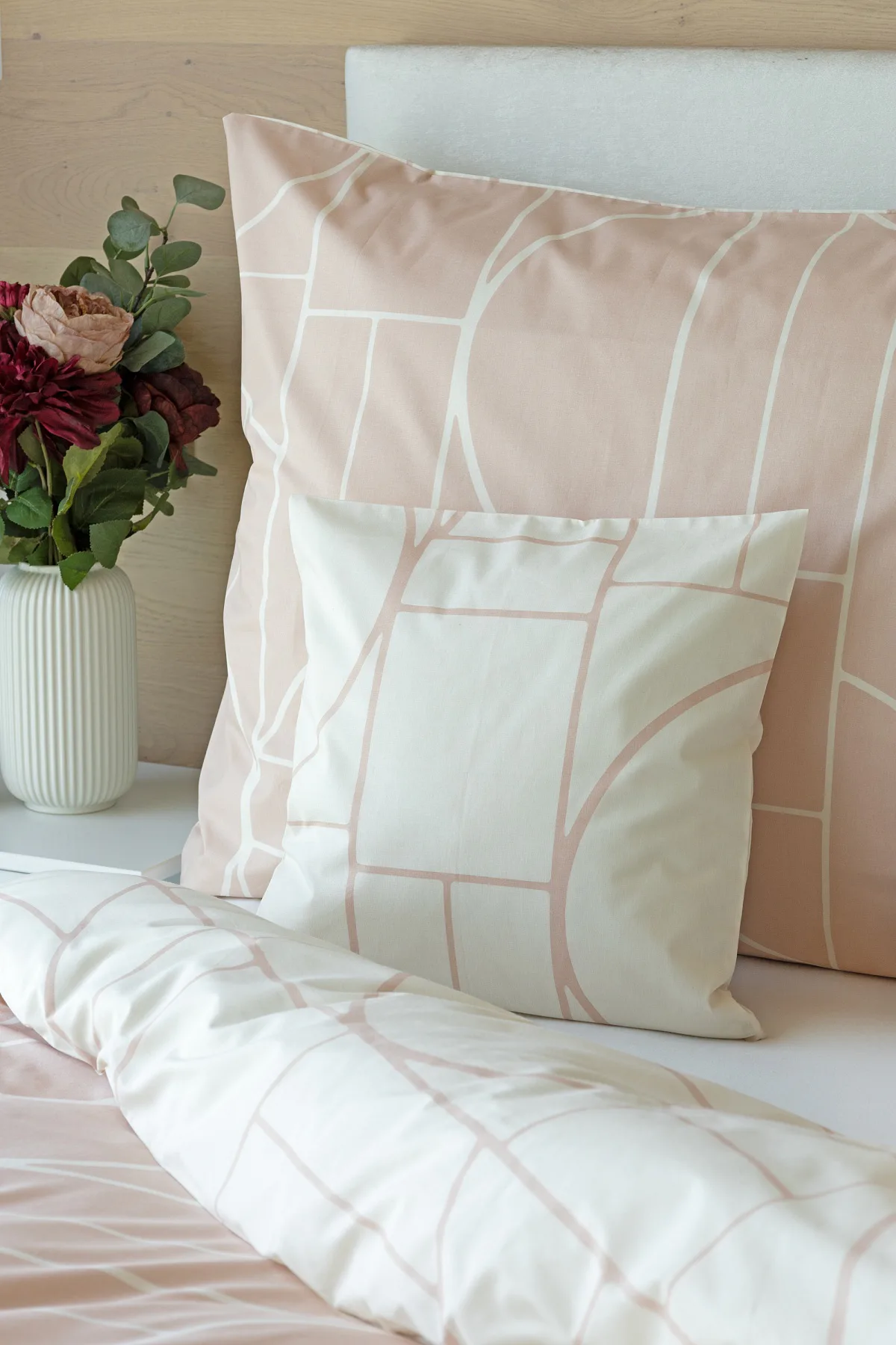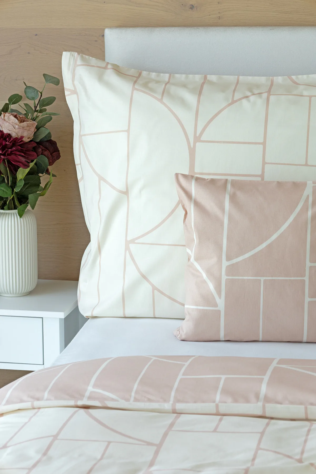 Povlak na polštář i na přikrývku je z každé strany jiný, na jedné straně dominuje pudrově růžový podklad, z druhé strany se geometrický vzor vyjímá na krémovém podkladu. Povlečení je opatřeno komfortním zipovým uzávěrem. 100% bavlna
