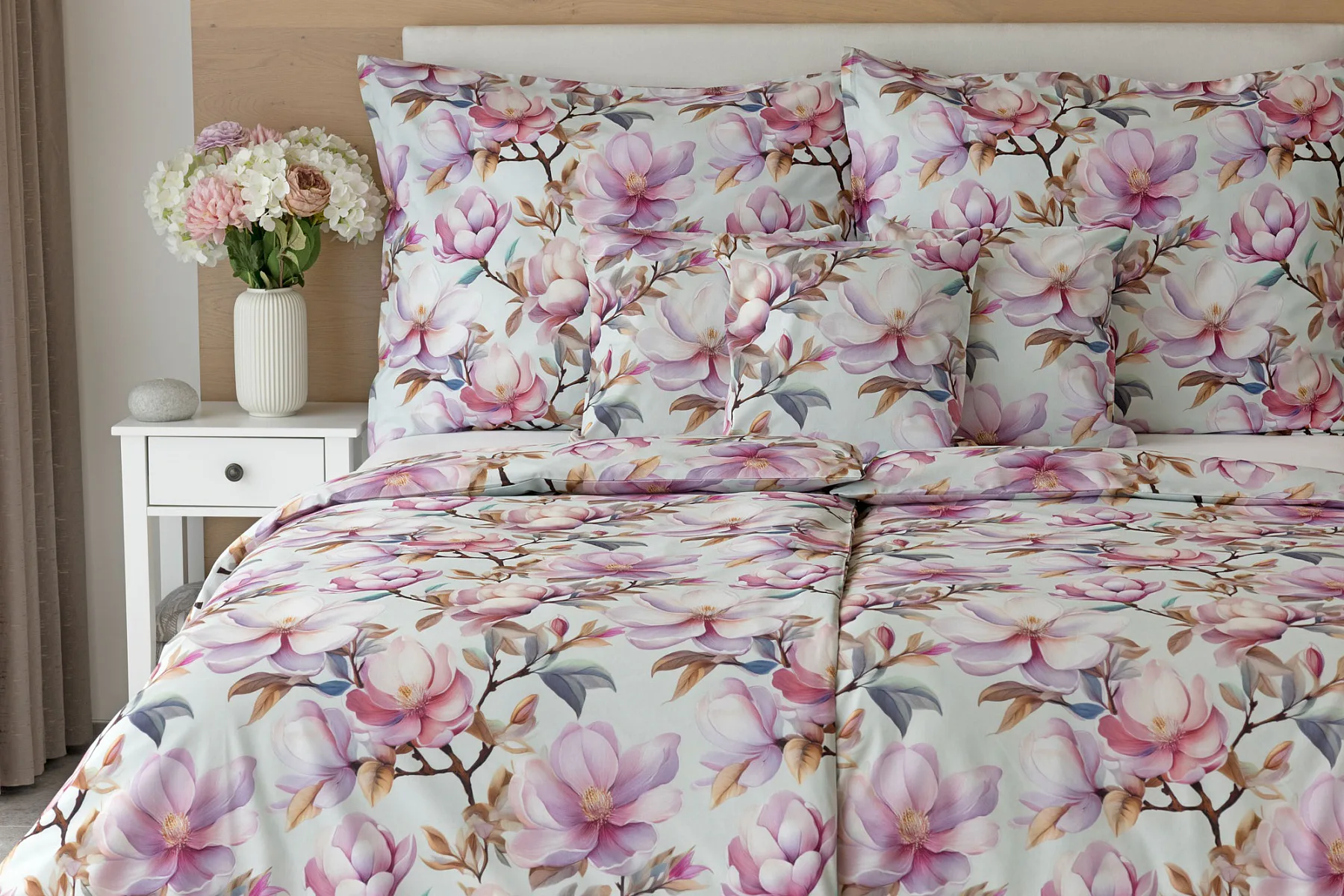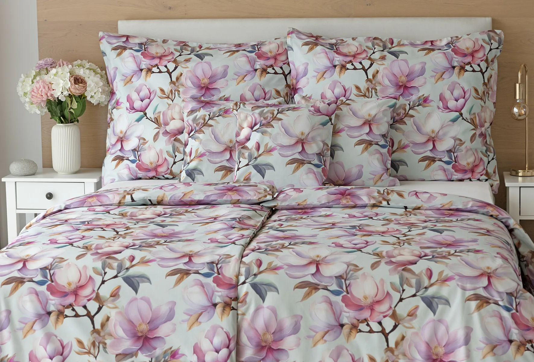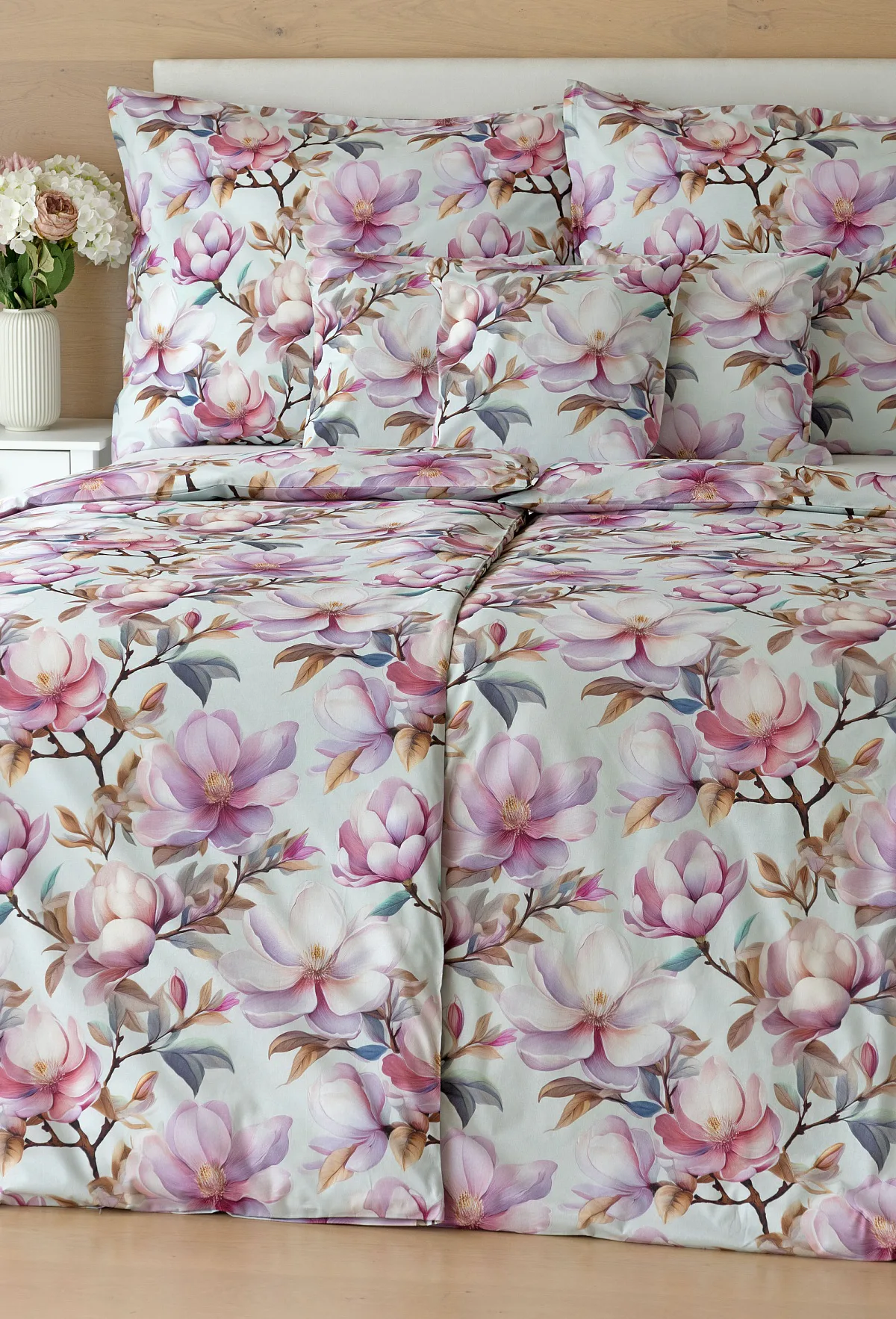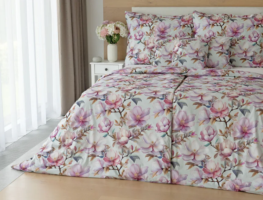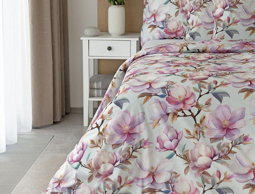 Bavlněné povlečení Pinkie vás okouzlí na první pohled originálním květinovým vzorem, kterému dominují odstíny pudrové a růžové barvy, doplněné jemnými prvky v paletě hnědých a petrolejových tónů. Květinový motiv je zasazen do tlumeného modrozeleného podkladu a díky nejmodernějšímu digitálnímu tisku vyniká v precizním detailu.