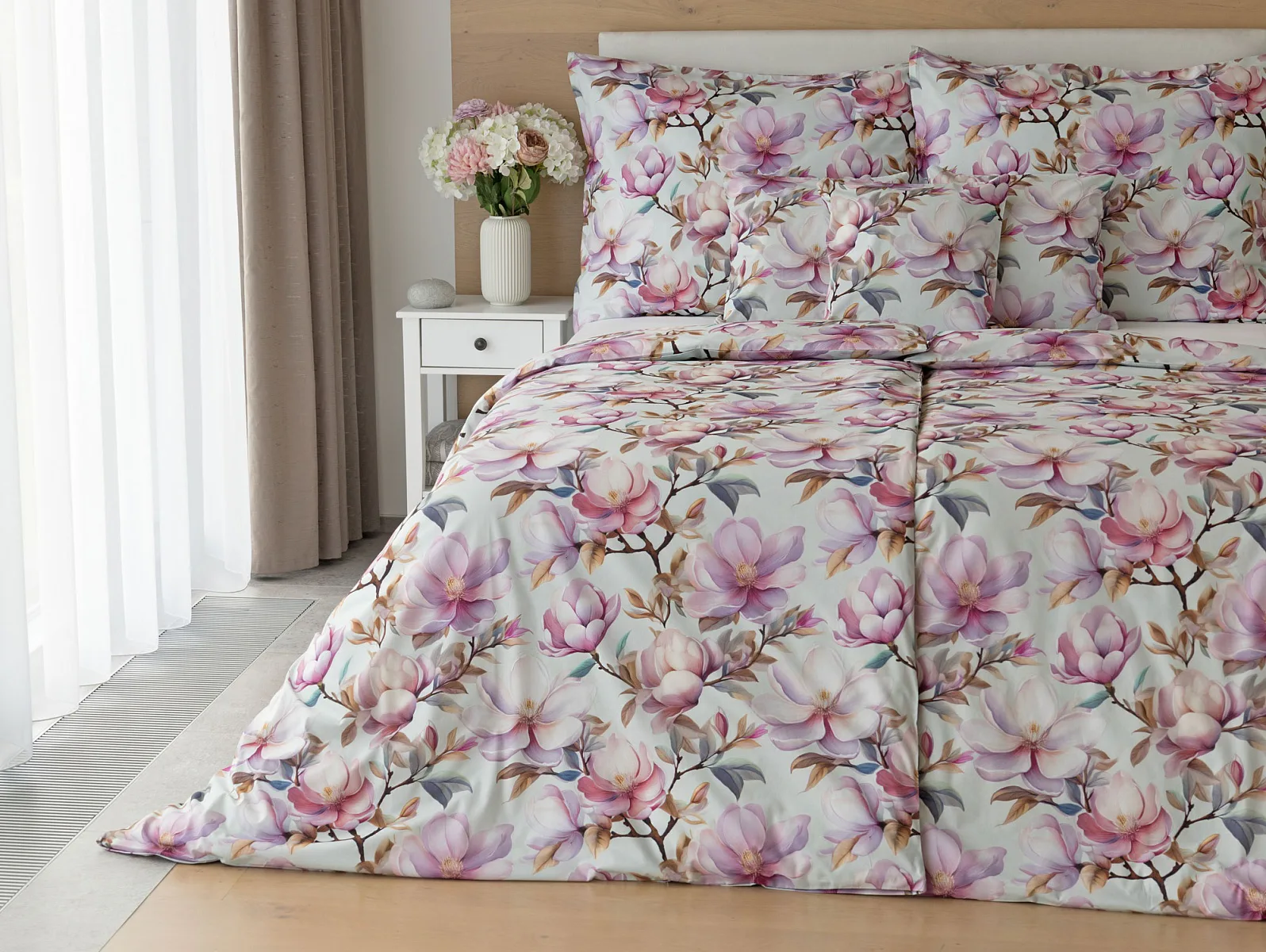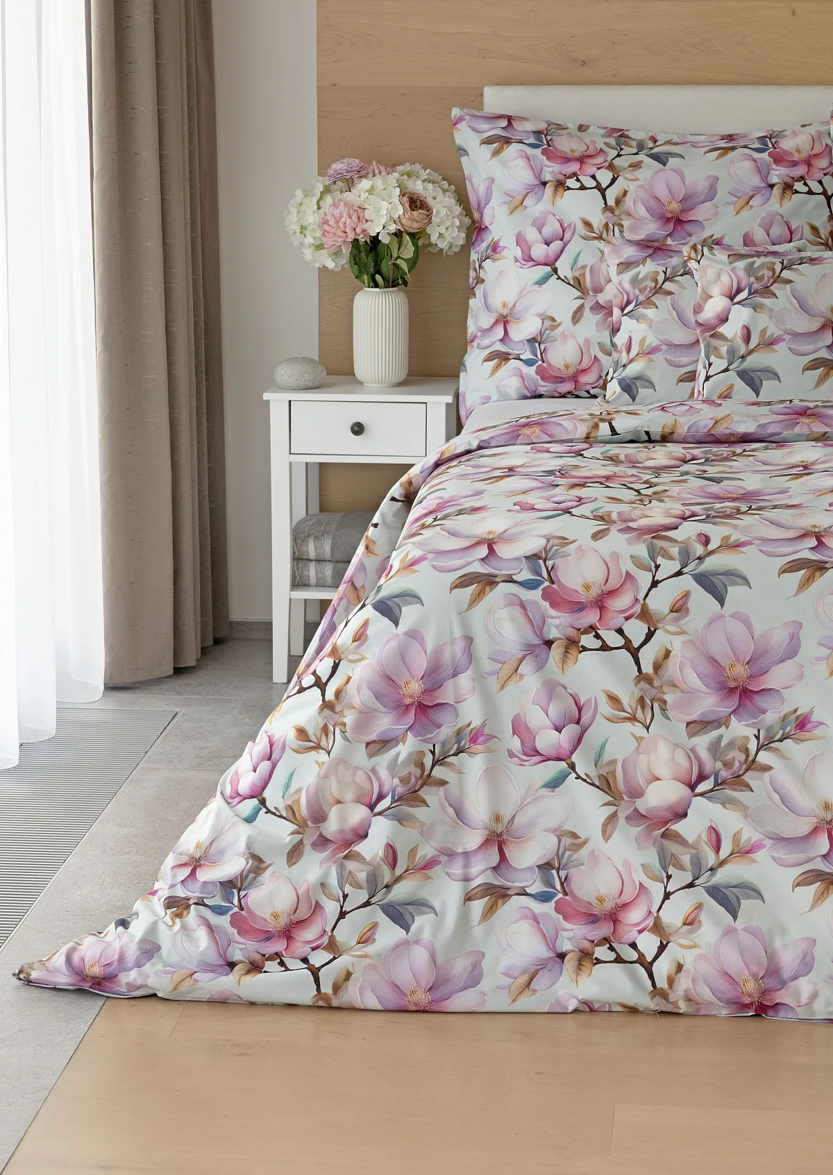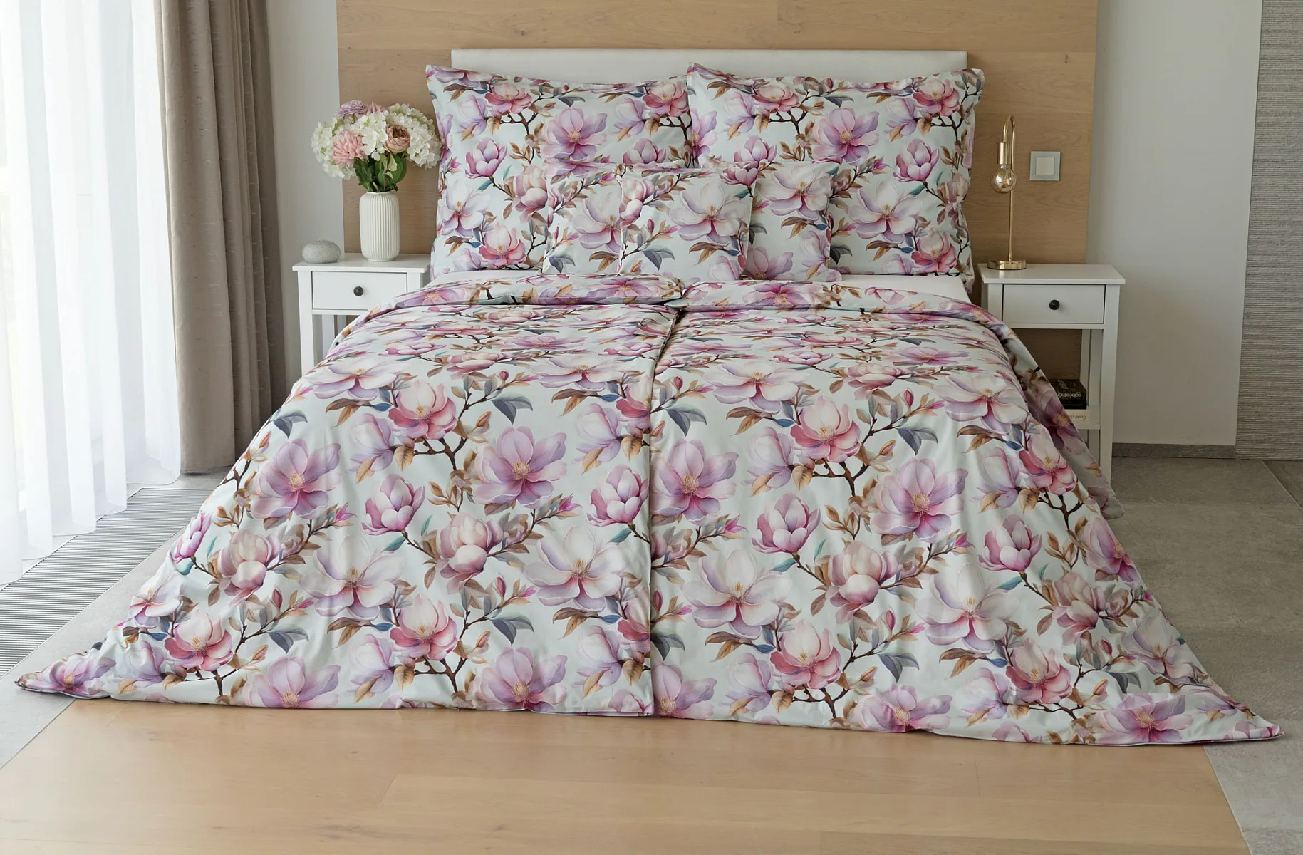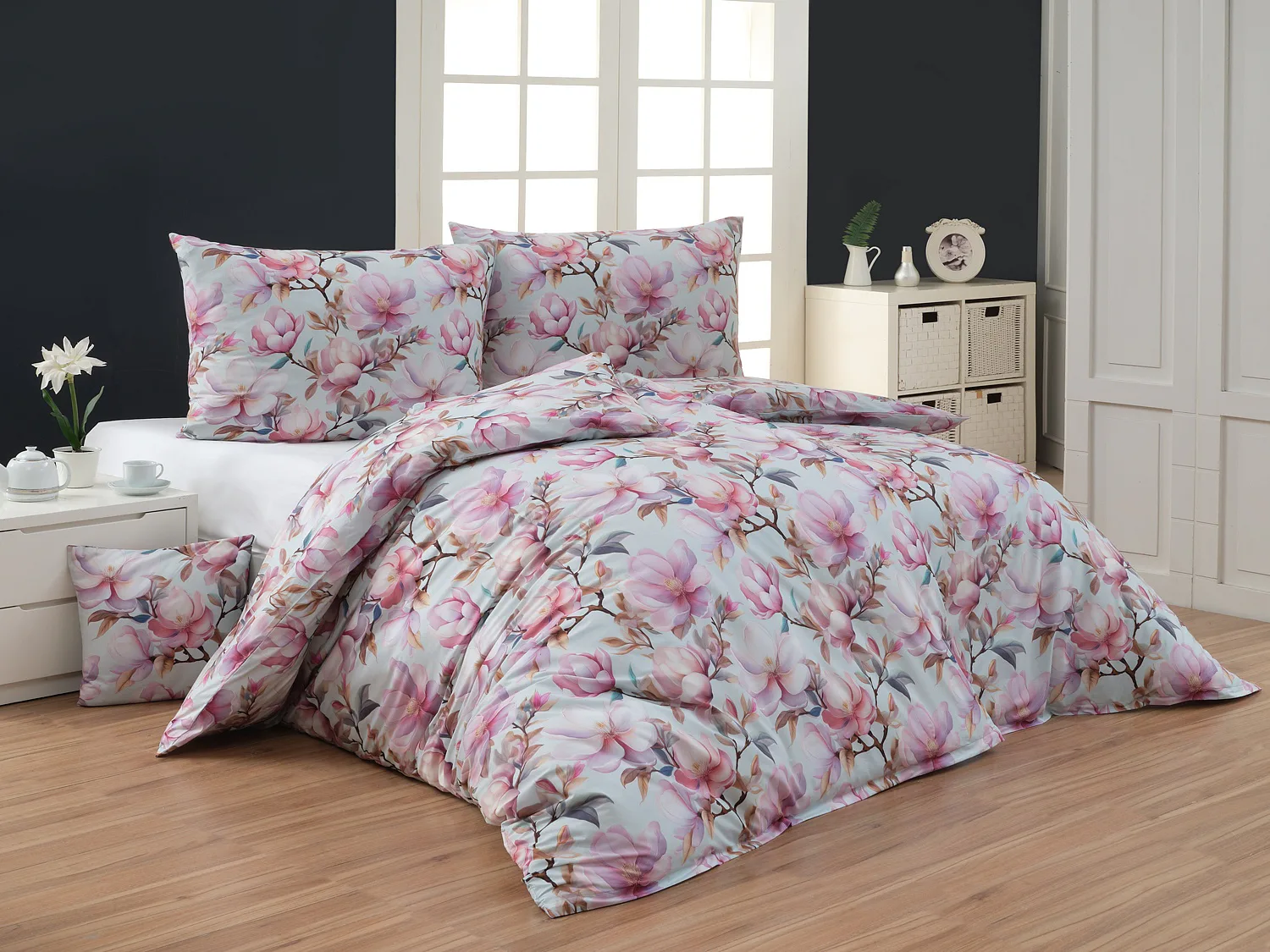 Bavlněné povlečení Pinkie vás okouzlí na první pohled originálním květinovým vzorem, kterému dominují odstíny pudrové a růžové barvy, doplněné jemnými prvky v paletě hnědých a petrolejových tónů. Květinový motiv je zasazen do tlumeného modrozeleného podkladu a díky nejmodernějšímu digitálnímu tisku vyniká v precizním detailu.