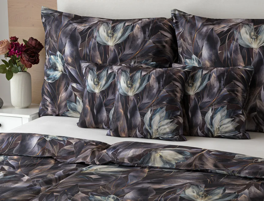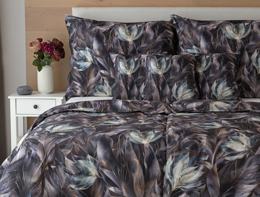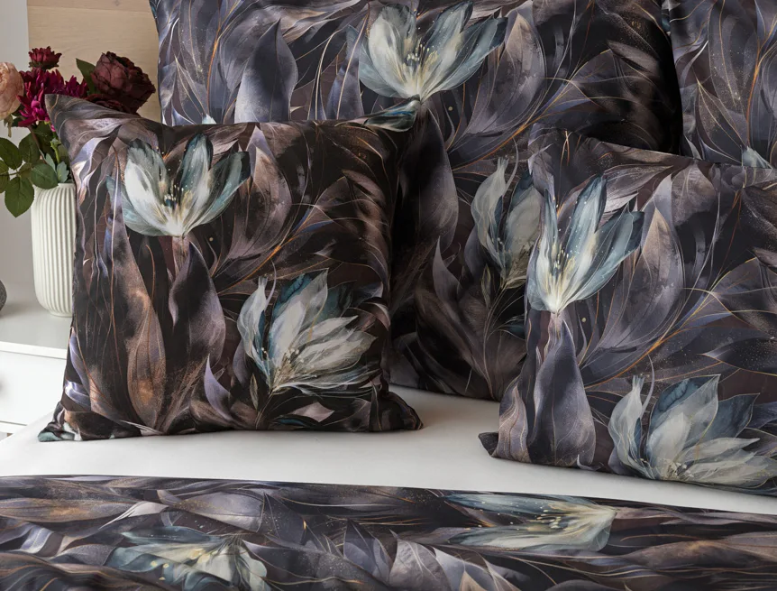 Vychutnejte si magické souznění barev v okouzlujícím vzoru ložního povlečení Poema, které se stane dominantou vaší ložnice. Abstraktní květy v paletě temně fialových a tlumeně petrolejových tónů vynikají v precizním detailu díky nejmodernějšímu digitálnímu tisku.