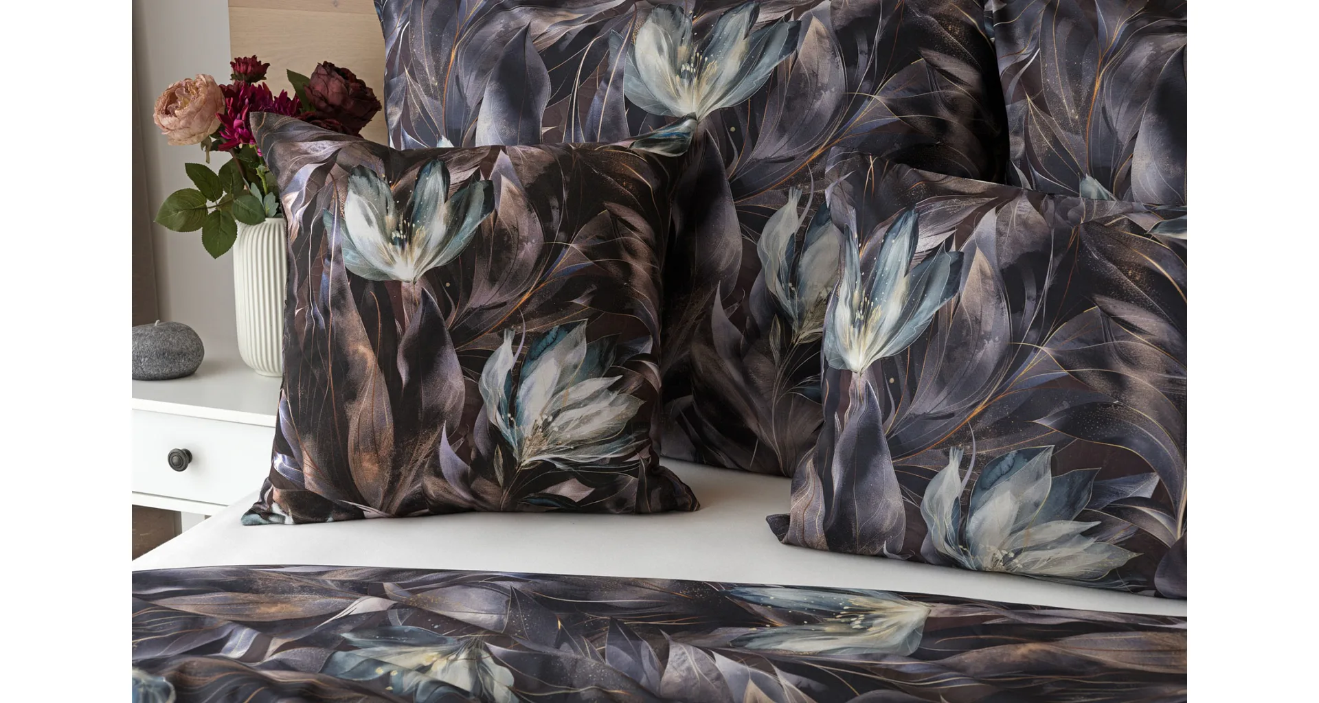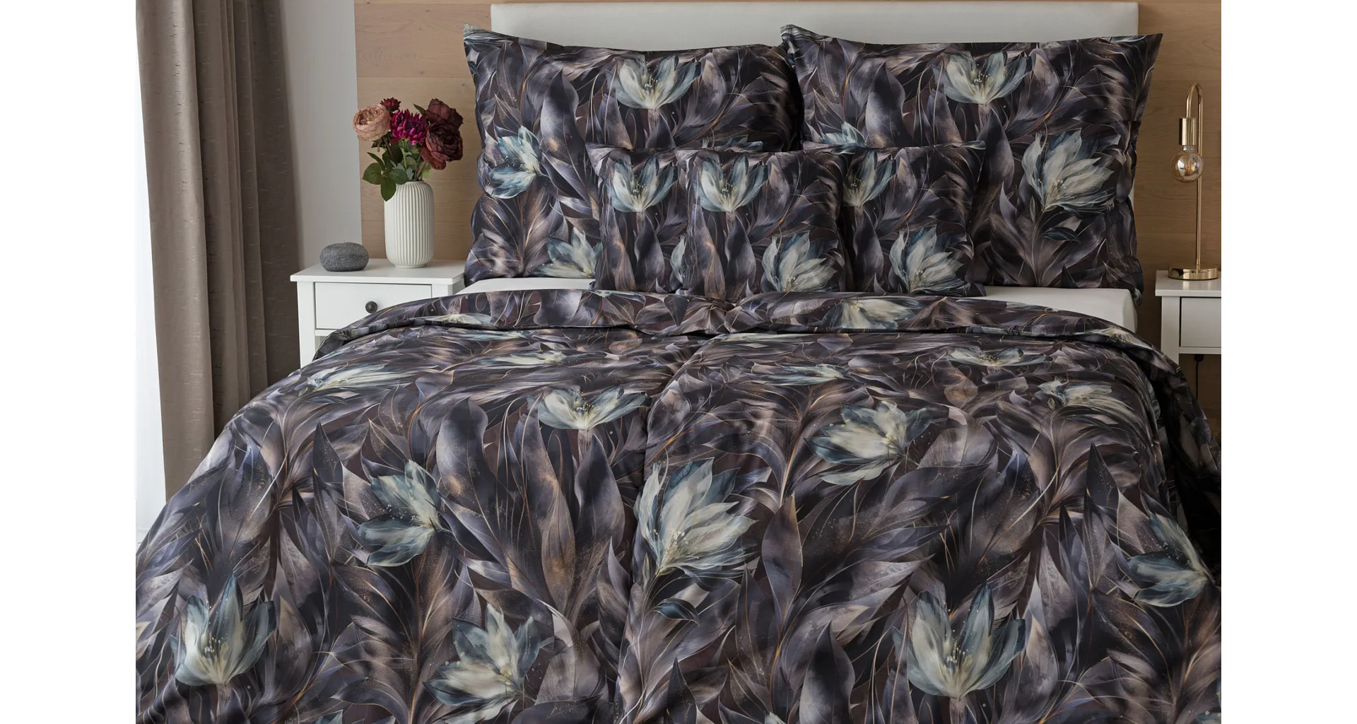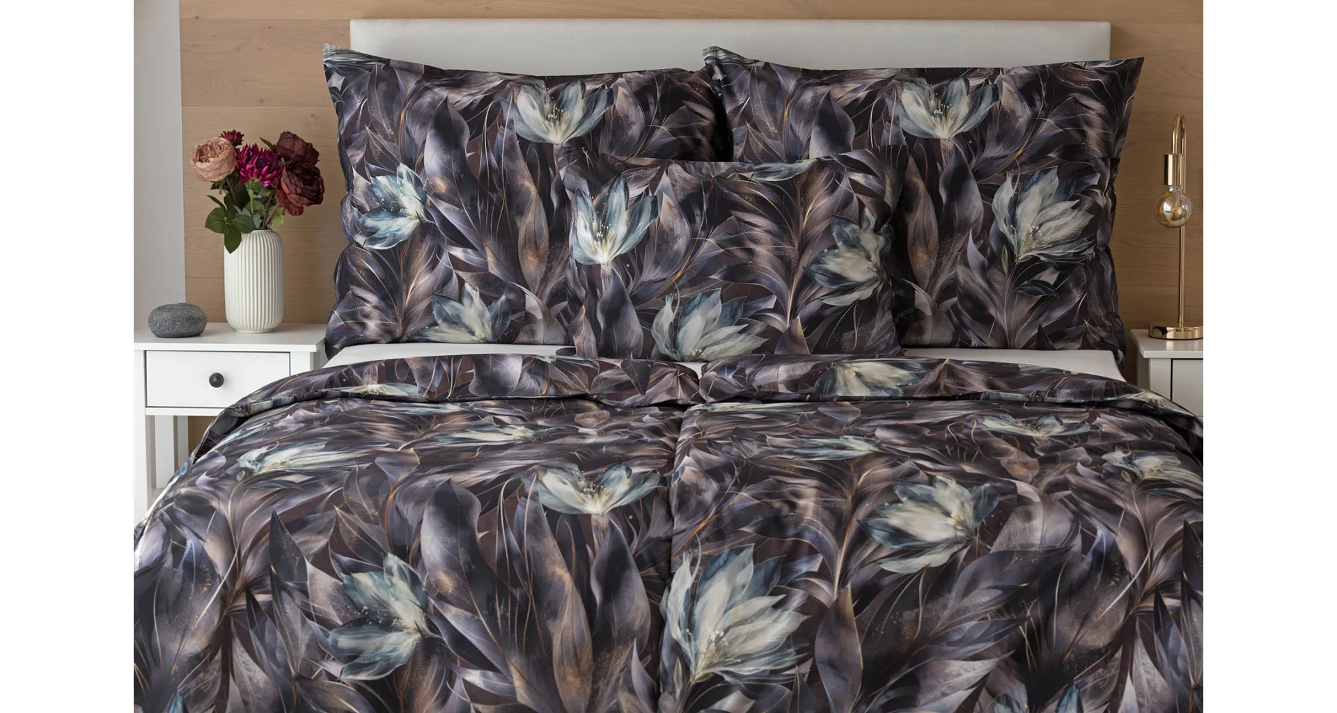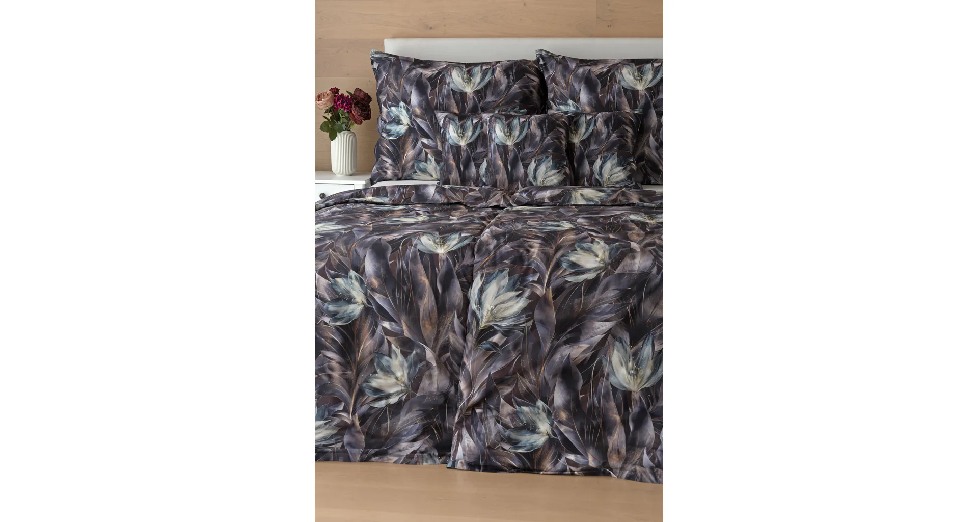 Vychutnejte si magické souznění barev v okouzlujícím vzoru ložního povlečení Poema, které se stane dominantou vaší ložnice. Abstraktní květy v paletě temně fialových a tlumeně petrolejových tónů vynikají v precizním detailu díky nejmodernějšímu digitálnímu tisku.