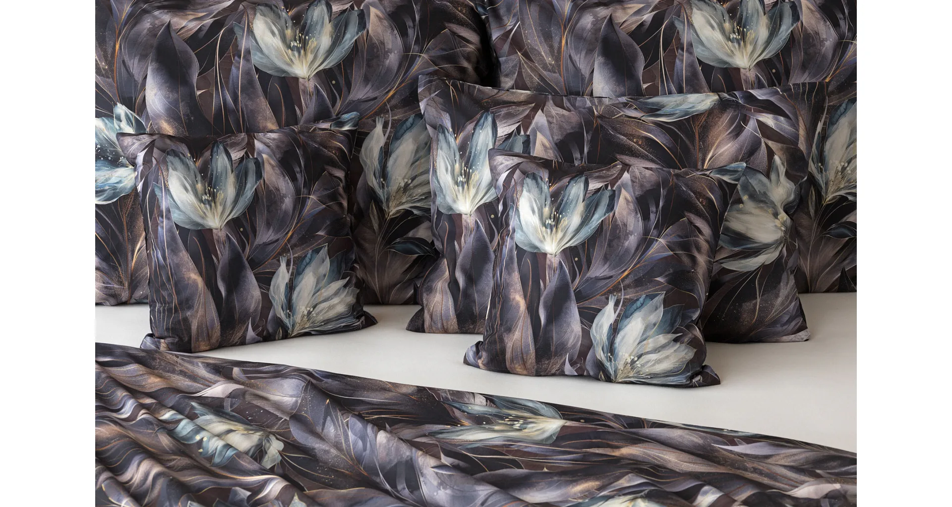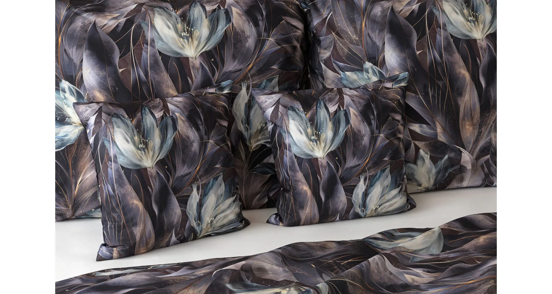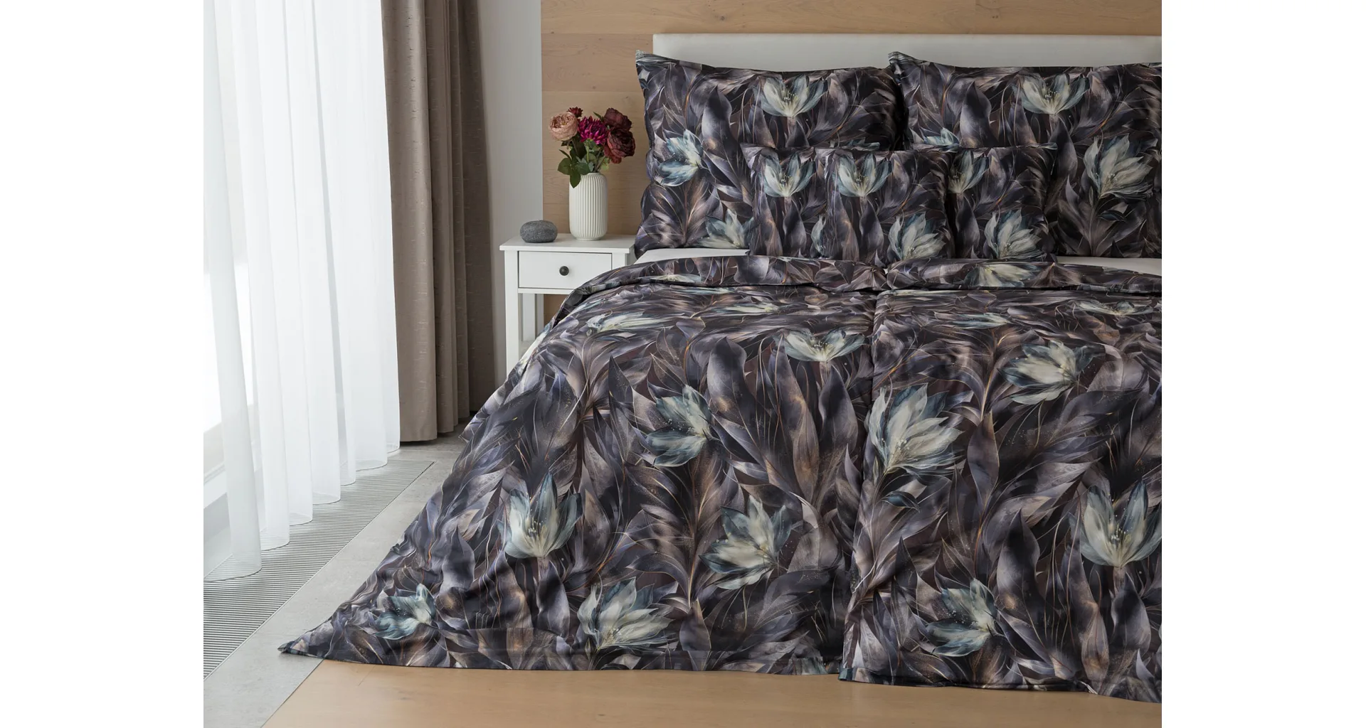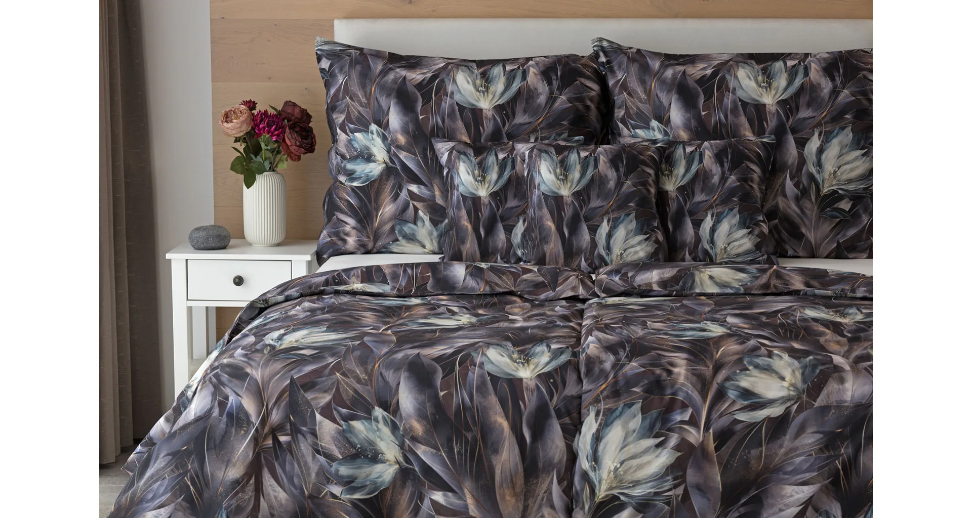 Vychutnejte si magické souznění barev v okouzlujícím vzoru ložního povlečení Poema, které se stane dominantou vaší ložnice. Abstraktní květy v paletě temně fialových a tlumeně petrolejových tónů vynikají v precizním detailu díky nejmodernějšímu digitálnímu tisku.