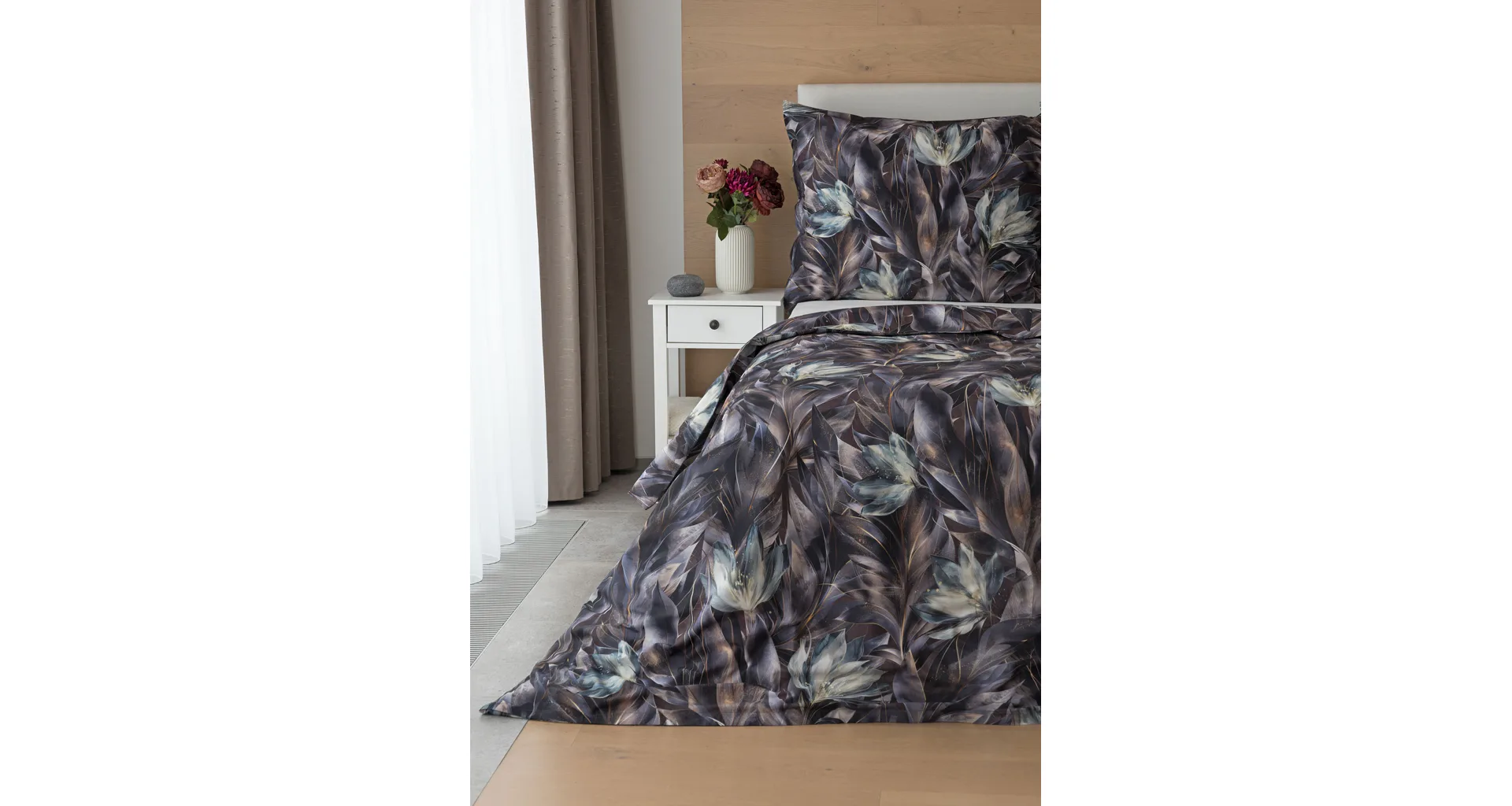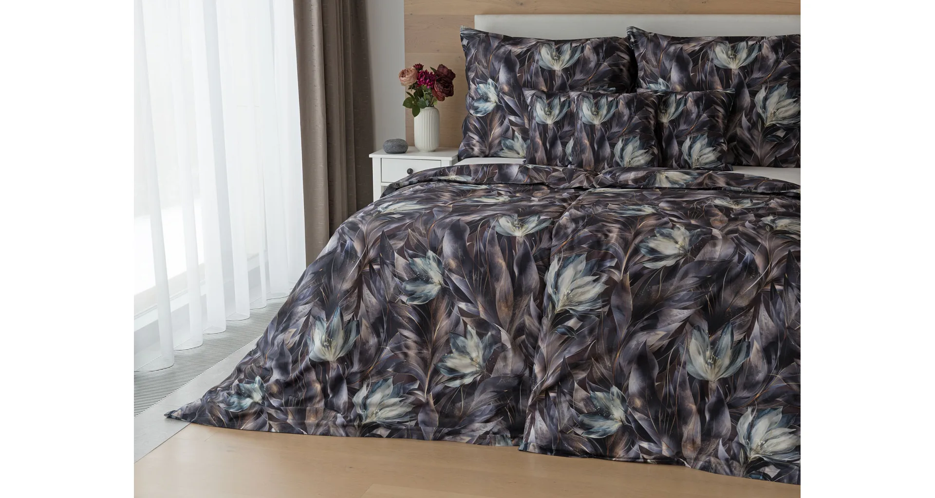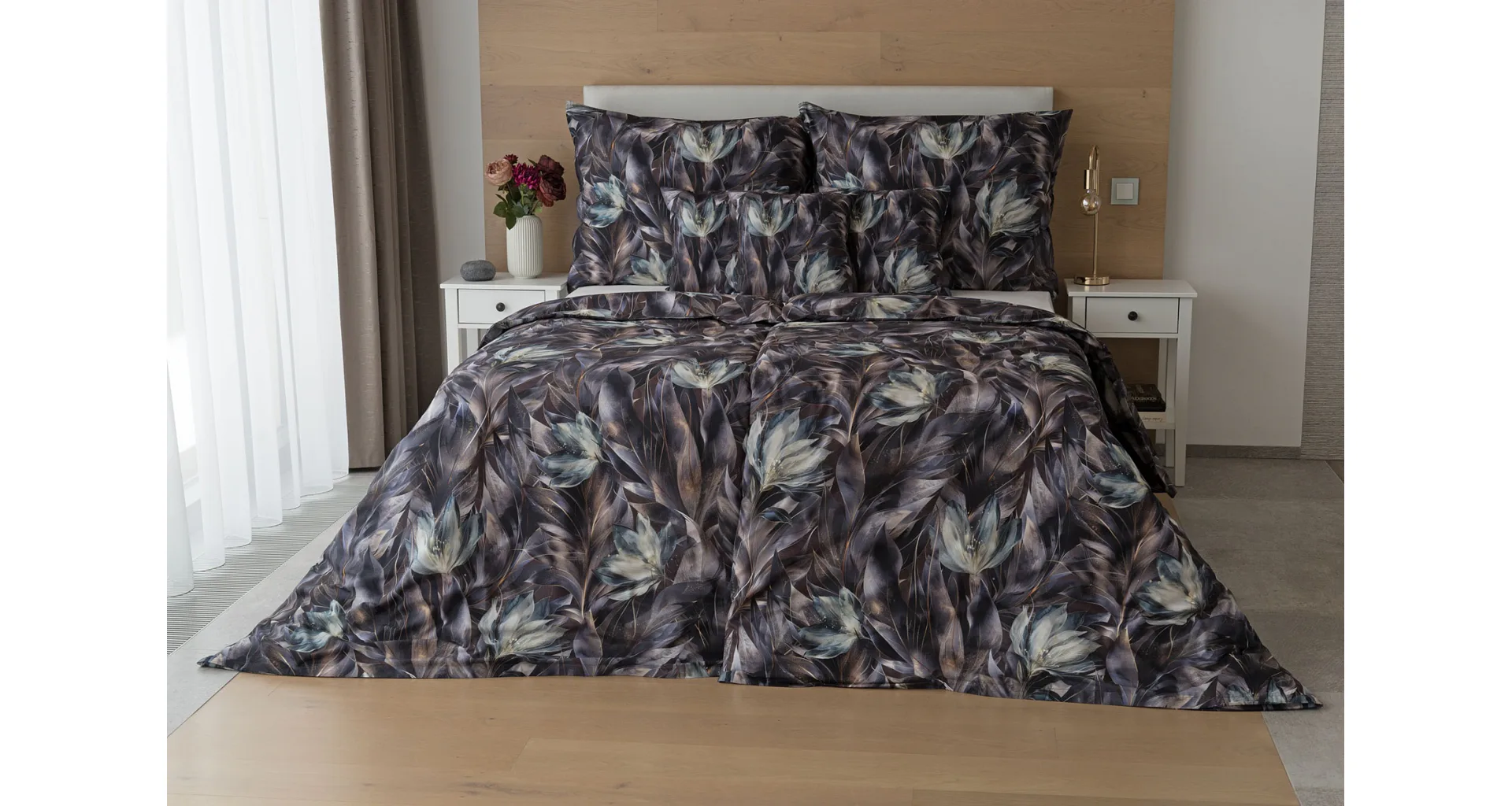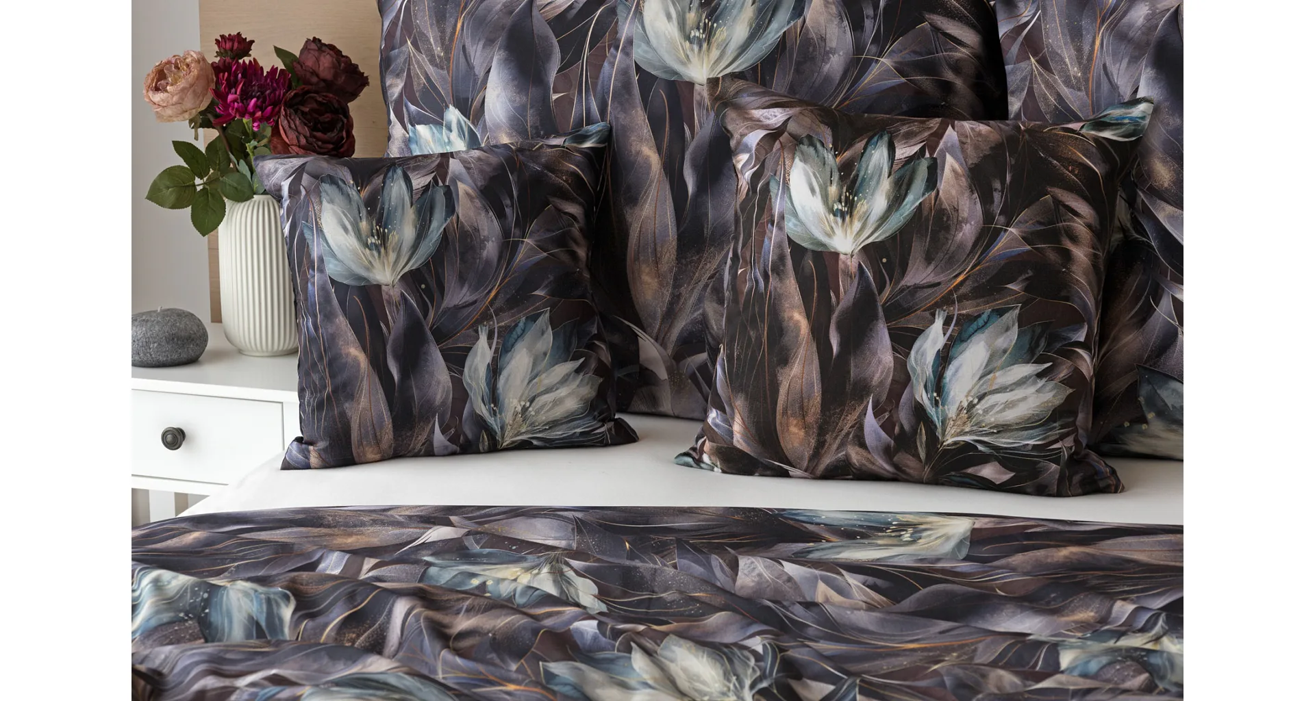 Vychutnejte si magické souznění barev v okouzlujícím vzoru ložního povlečení Poema, které se stane dominantou vaší ložnice. Abstraktní květy v paletě temně fialových a tlumeně petrolejových tónů vynikají v precizním detailu díky nejmodernějšímu digitálnímu tisku.