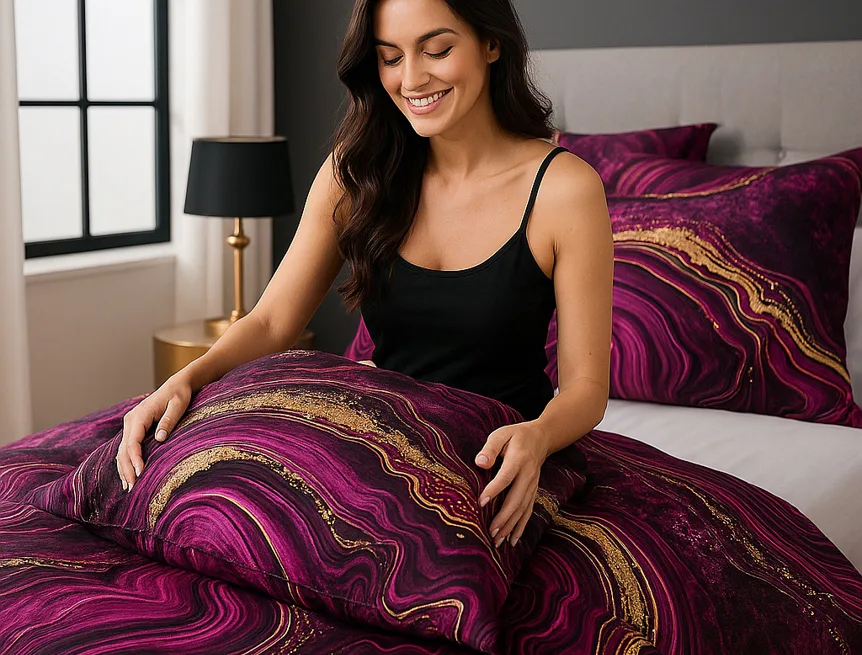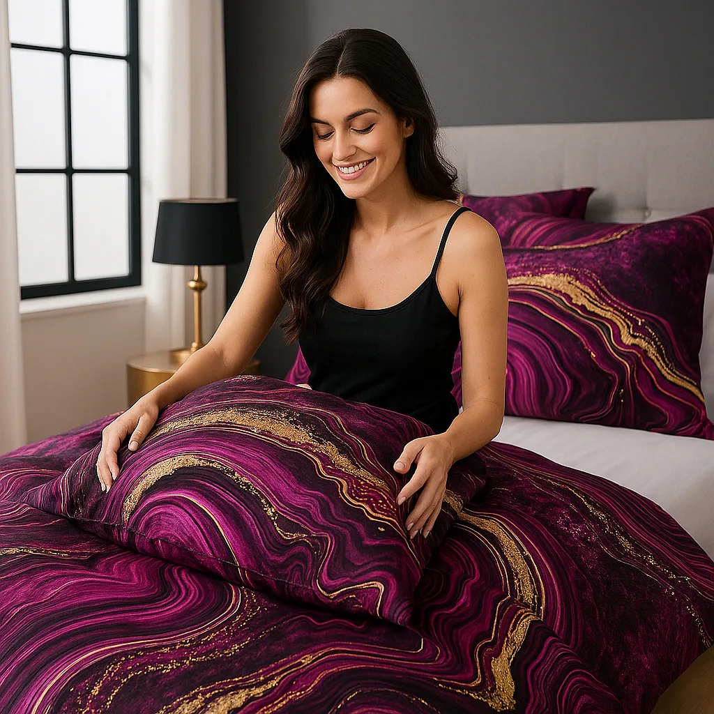 Obměna velmi oblíbeného modrého povlečení Iris, ložní set Ramada, potěší všechny milovníky zářivě růžových tónů. Abstraktnímu vzoru dominují odstíny malinově růžové, fuchsiové a ostře fialové barvy, které v abstraktním vzoru zdobí zlatavé prvky.