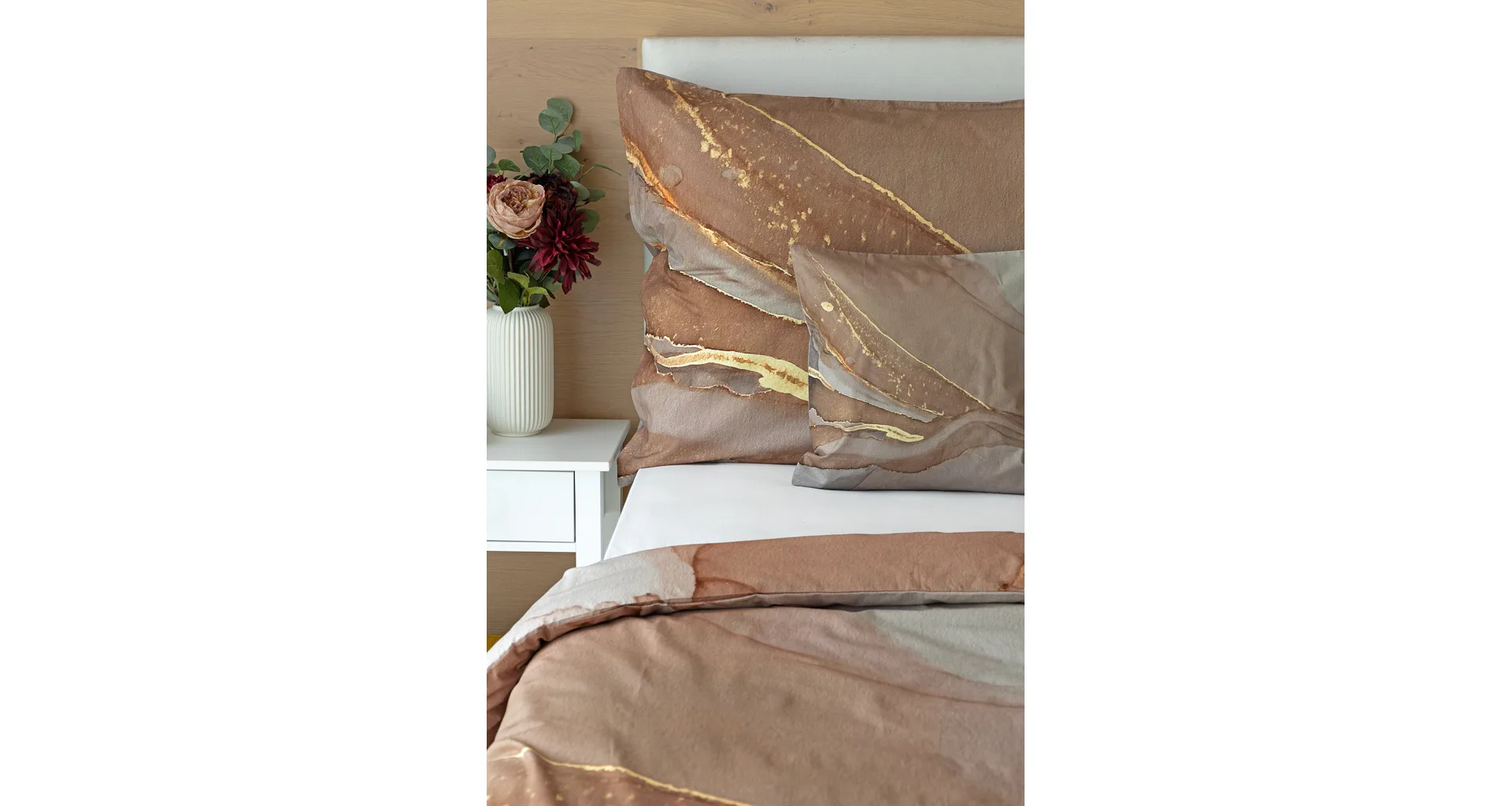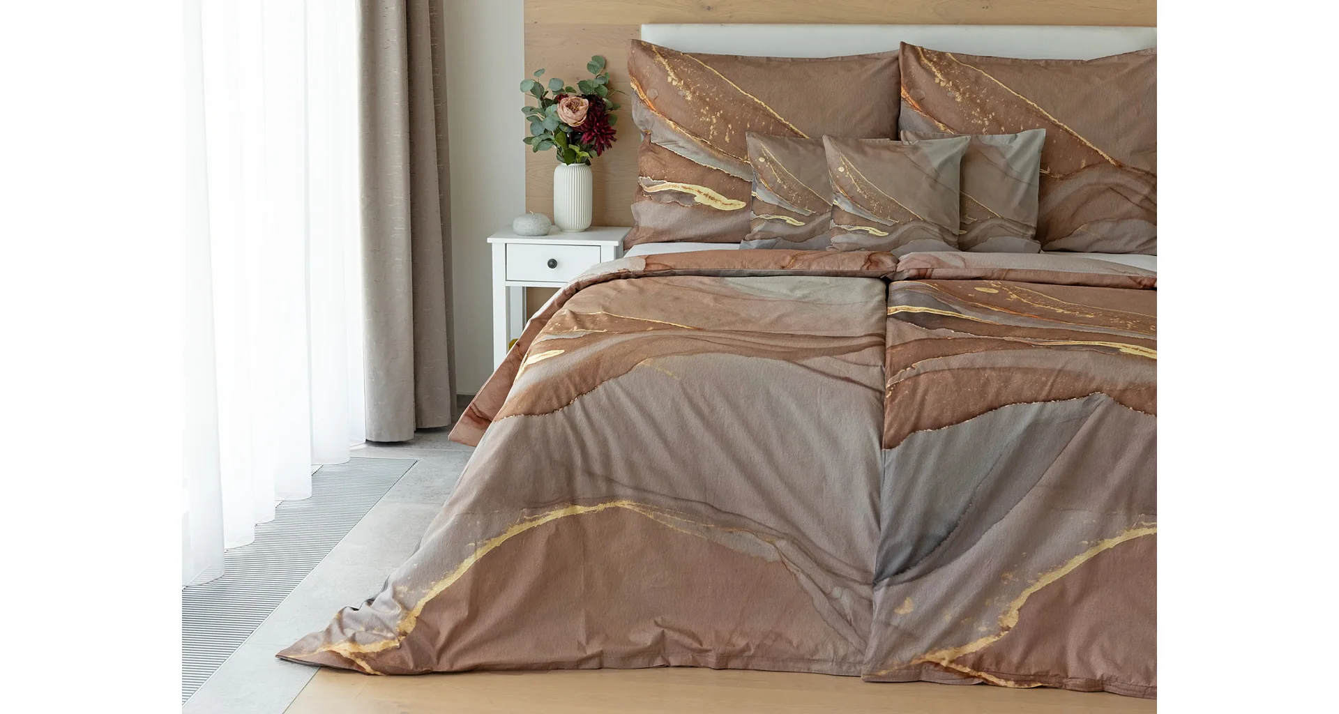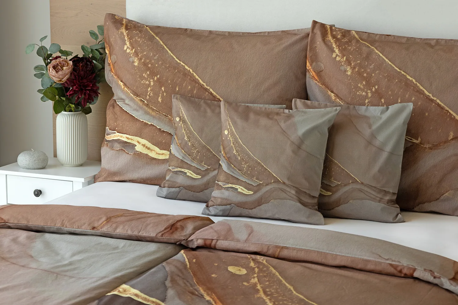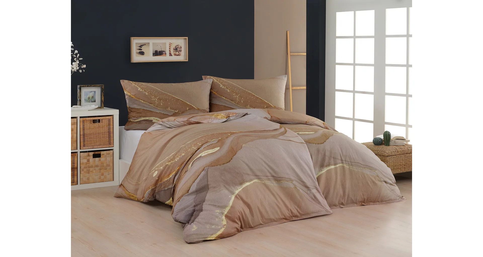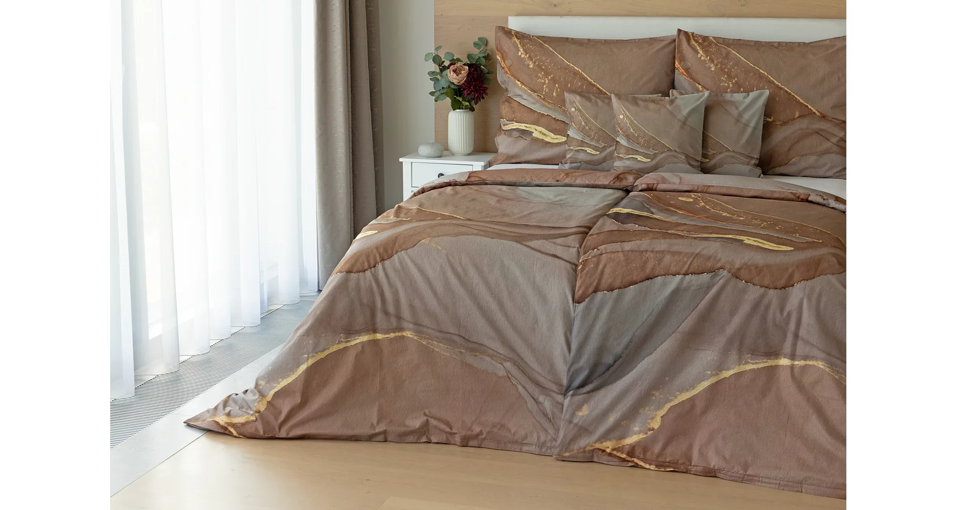 Bavlněné povlečení Riana vnese do vaší ložnice jedinečný styl a eleganci. Abstraktní vzor kombinuje paletu hnědých a šedohnědých tónů protnutých zlatavou linkou. Povlečení je vyrobeno ze 100% prvotřídní bavlny a přináší nejen estetickou hodnotu, ale i výjimečný komfort.