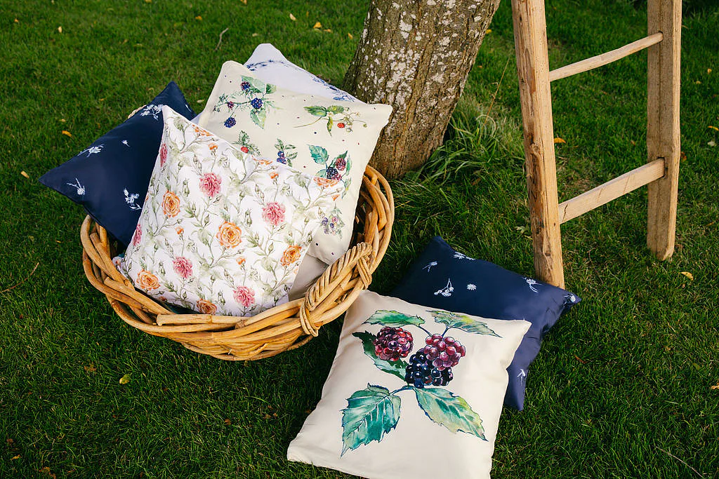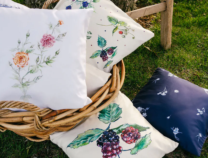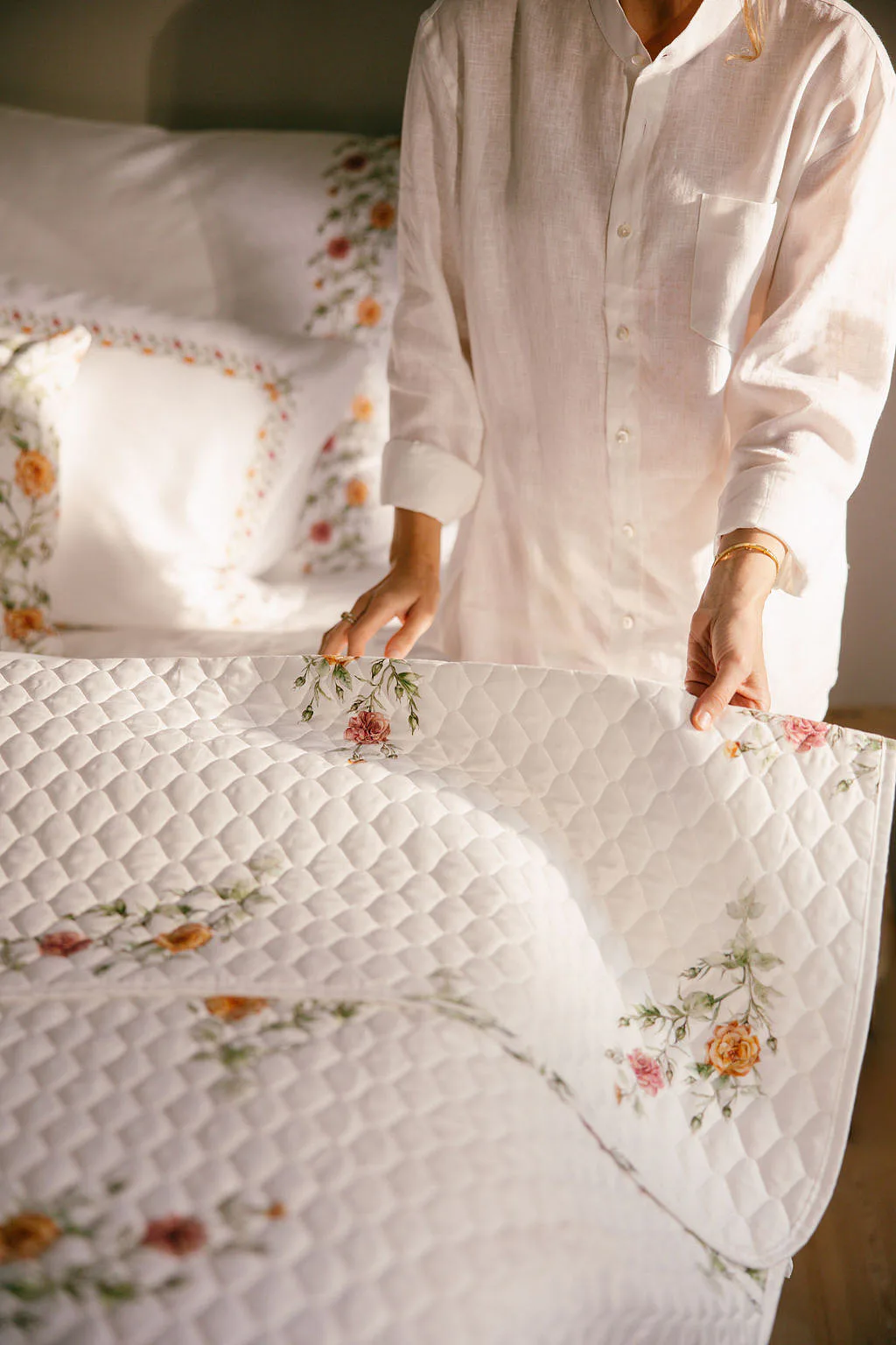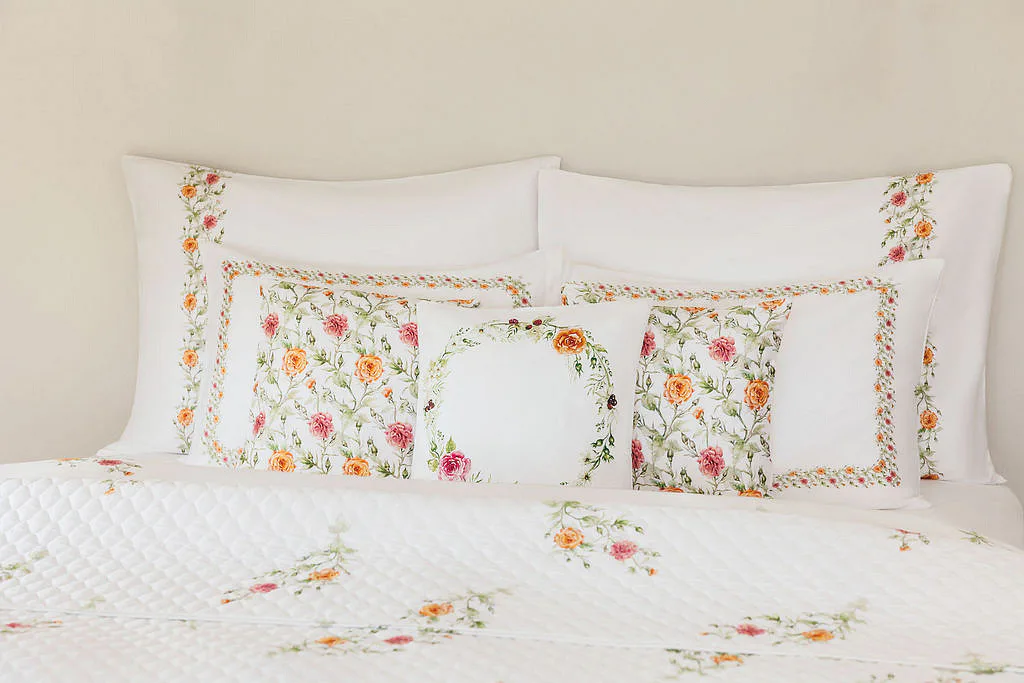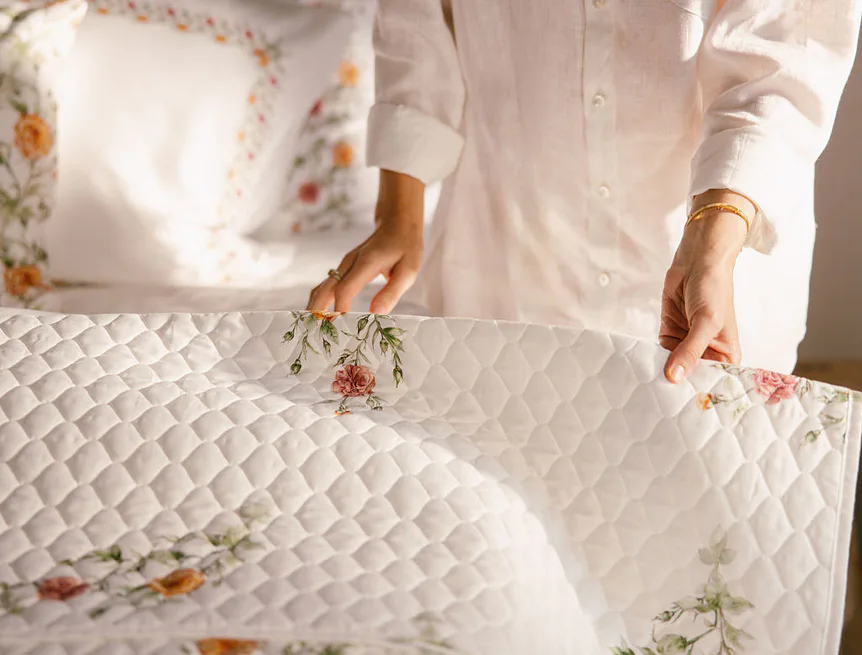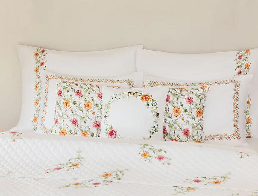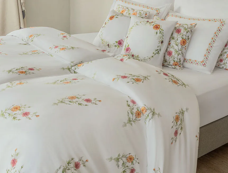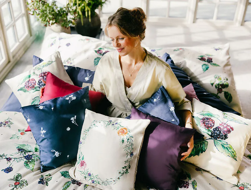 „Růže mě provází celý život doma,“ vypráví Zuzana – lemovaly chodníky u babičky, předzahrádky ve vesnici i její současný dům. Na povlečení je proto přenesla s klidem něžného rituálu. Velké plochy bílé působí jako porcelán: „lesk, jemnost a čistota“ v kontrastu s barvami květů vytváří slavnostní, téměř obřadní klid spánku. Satén vede kompozici k noblese „nejlepších hotelových pokojů“, elegantní lemy podtrhují pocit, že každý večer může být malou premiérou stylu.