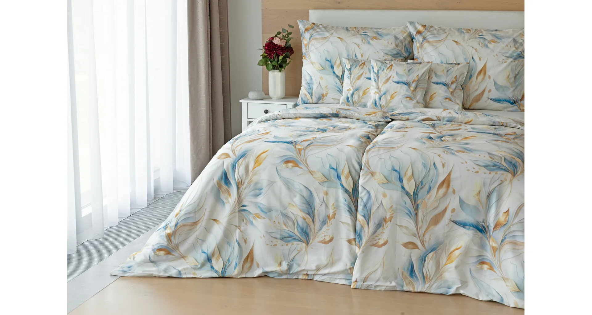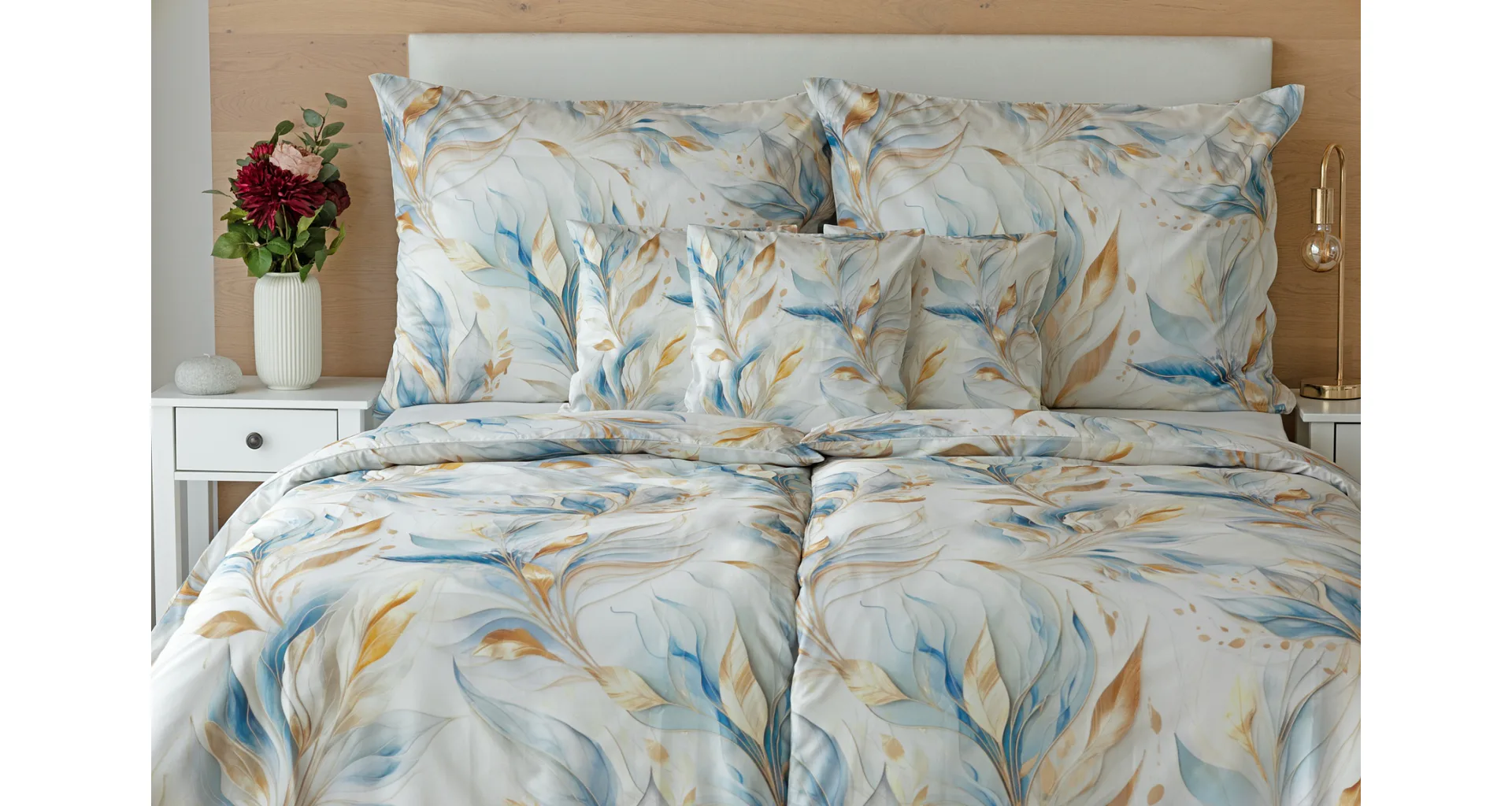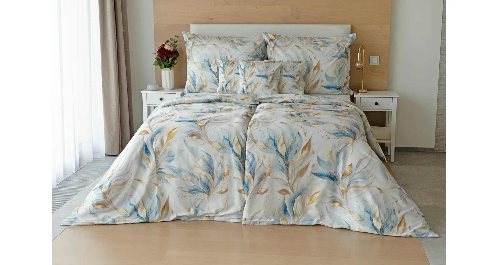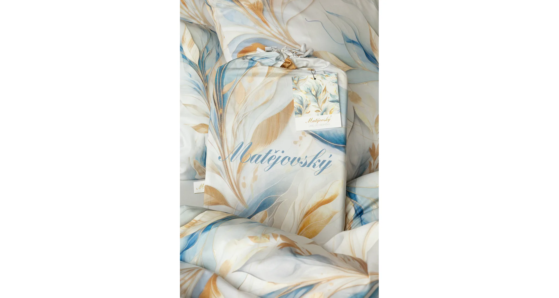 Vzor Symphony zdobí po celé ploše motiv zlatých a modrých listů na šedobílém podkladu. Povlak na polštář i na přikrývku je z obou stran stejný, povlečení je opatřeno komfortním zipovým uzávěrem.