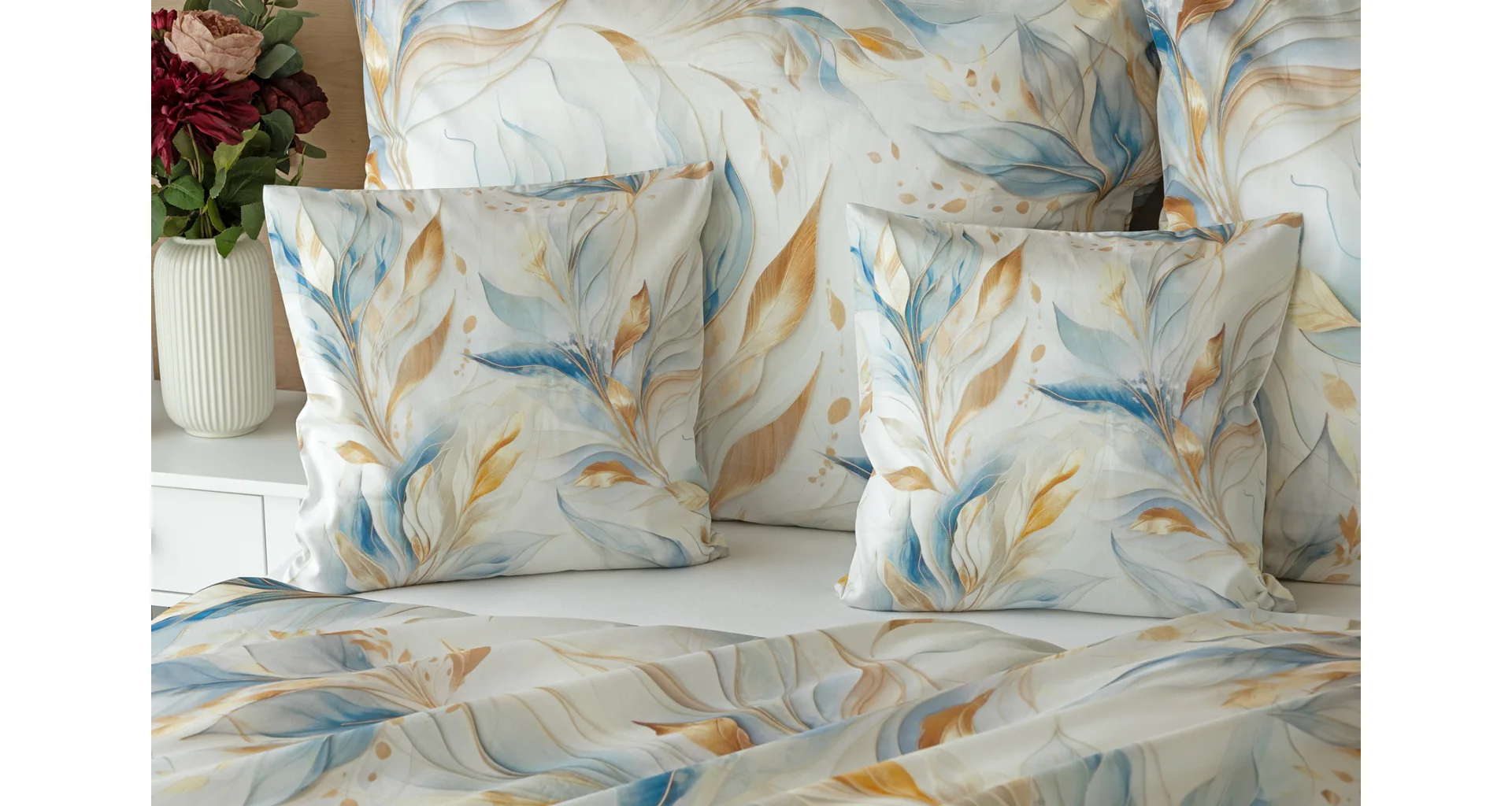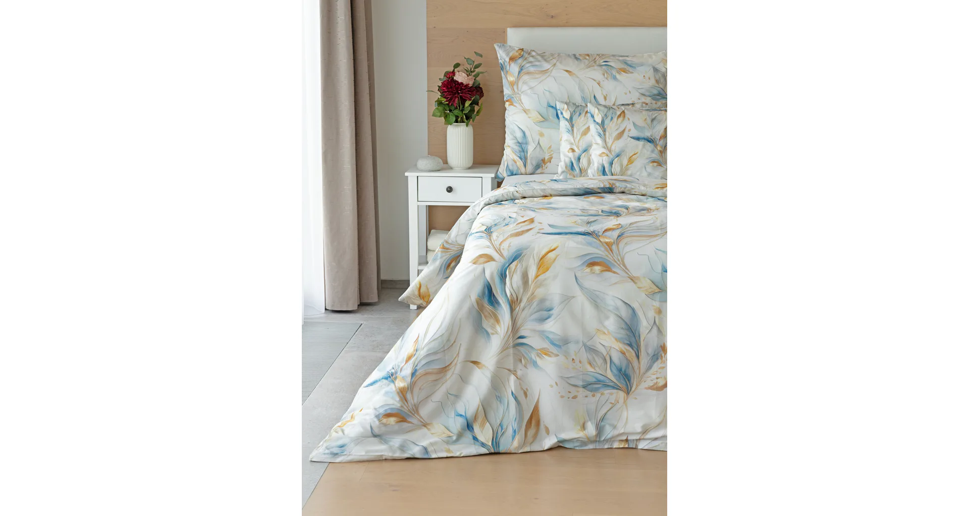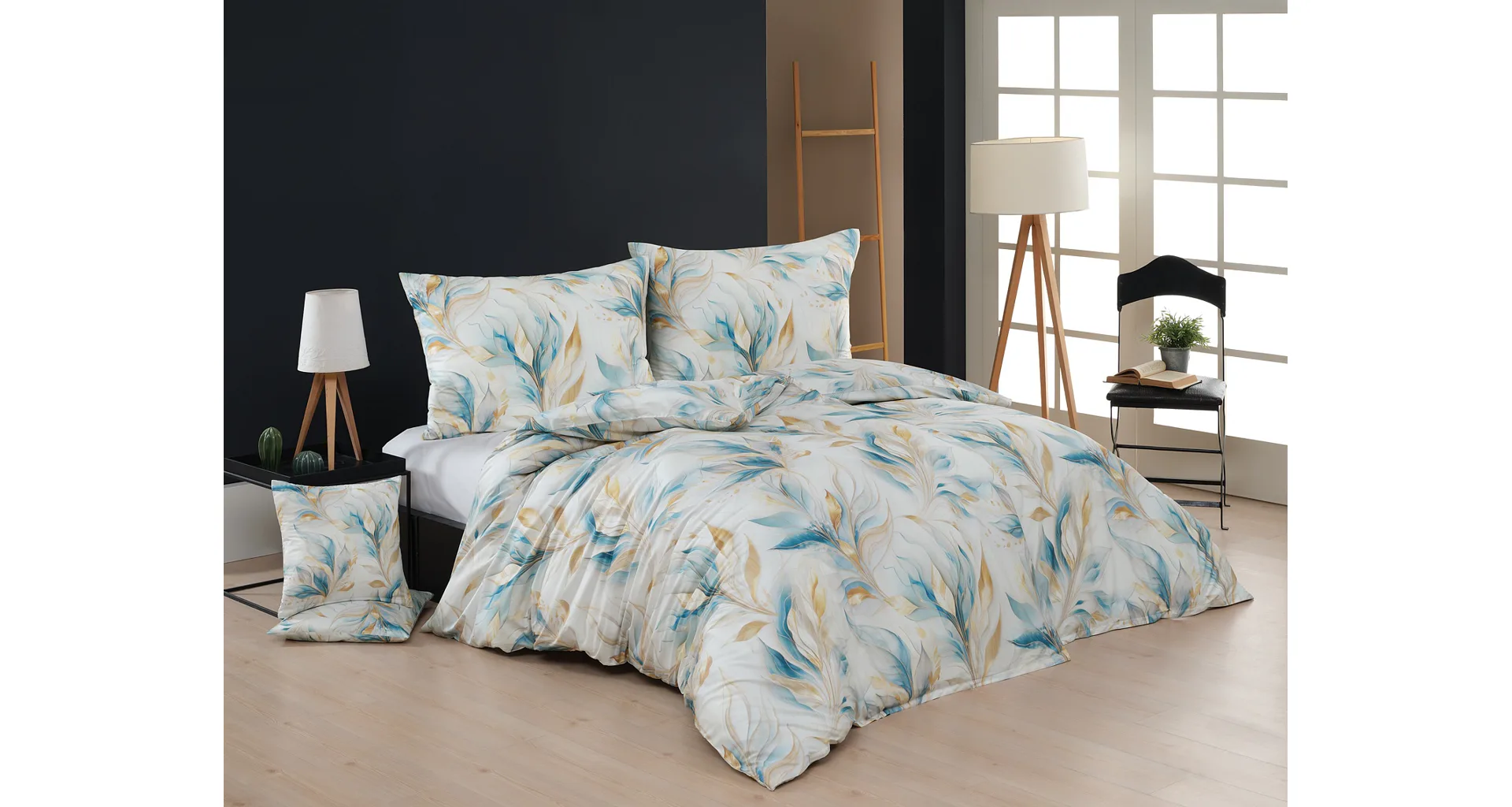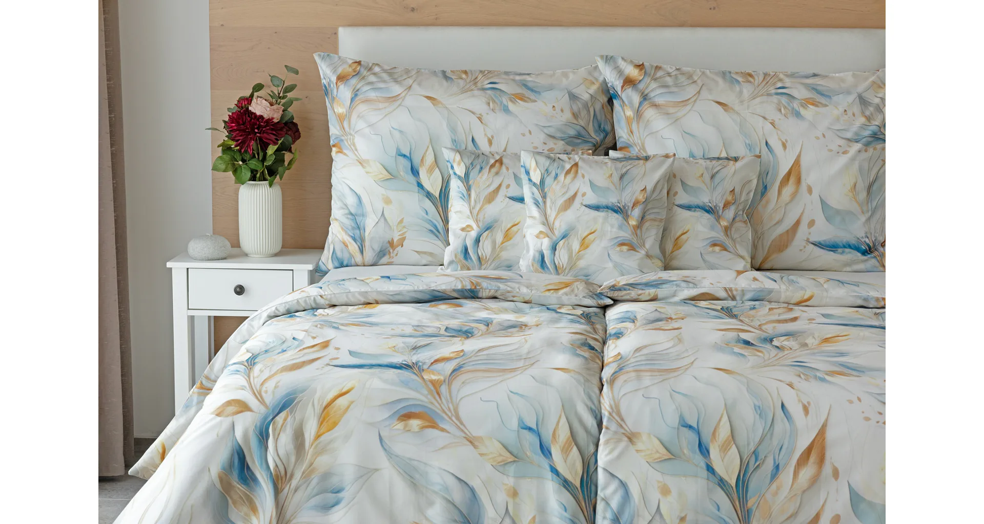 Vzor Symphony zdobí po celé ploše motiv zlatých a modrých listů na šedobílém podkladu. Povlak na polštář i na přikrývku je z obou stran stejný, povlečení je opatřeno komfortním zipovým uzávěrem.