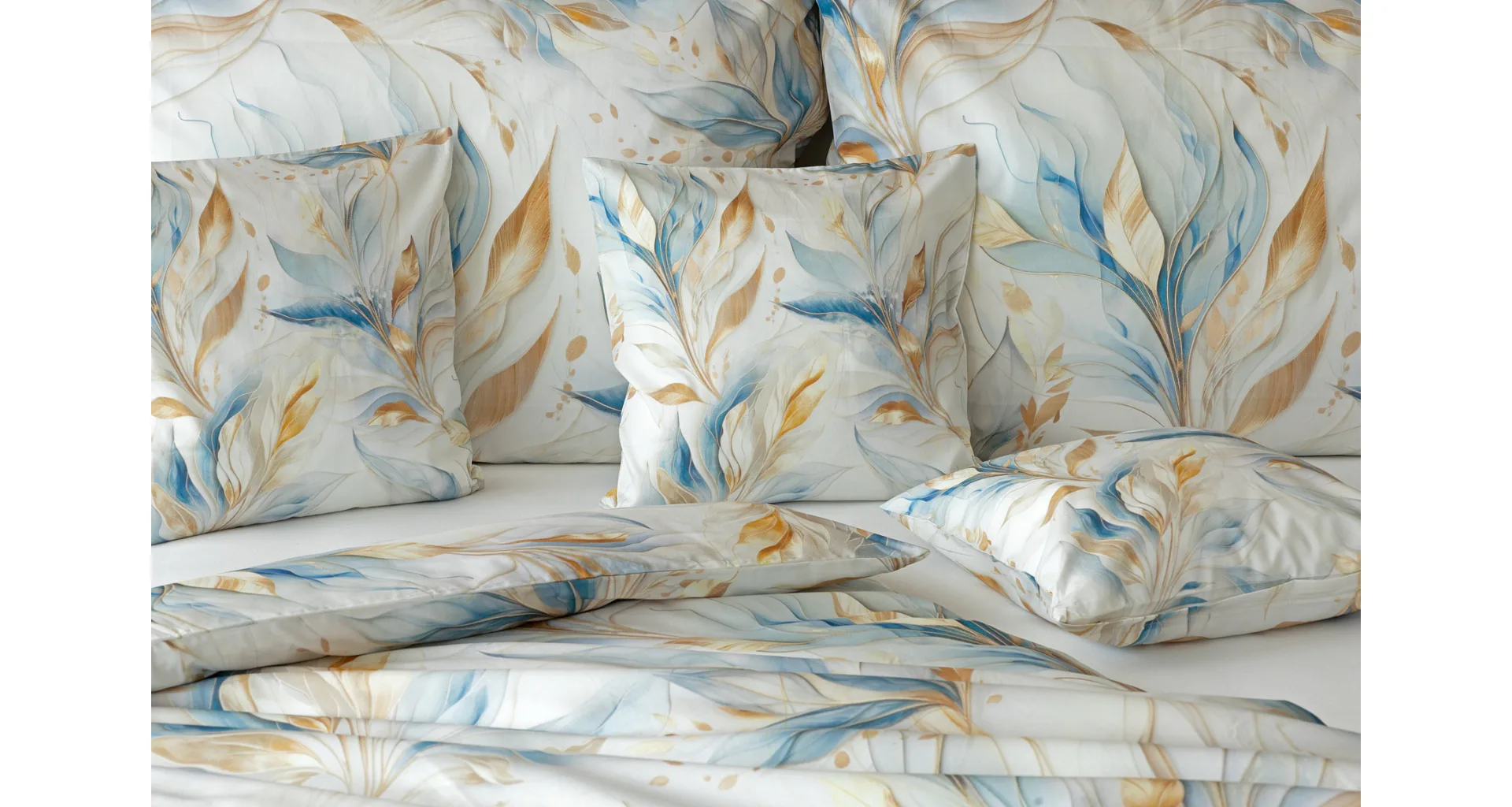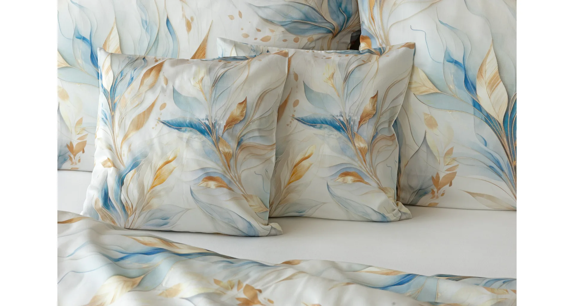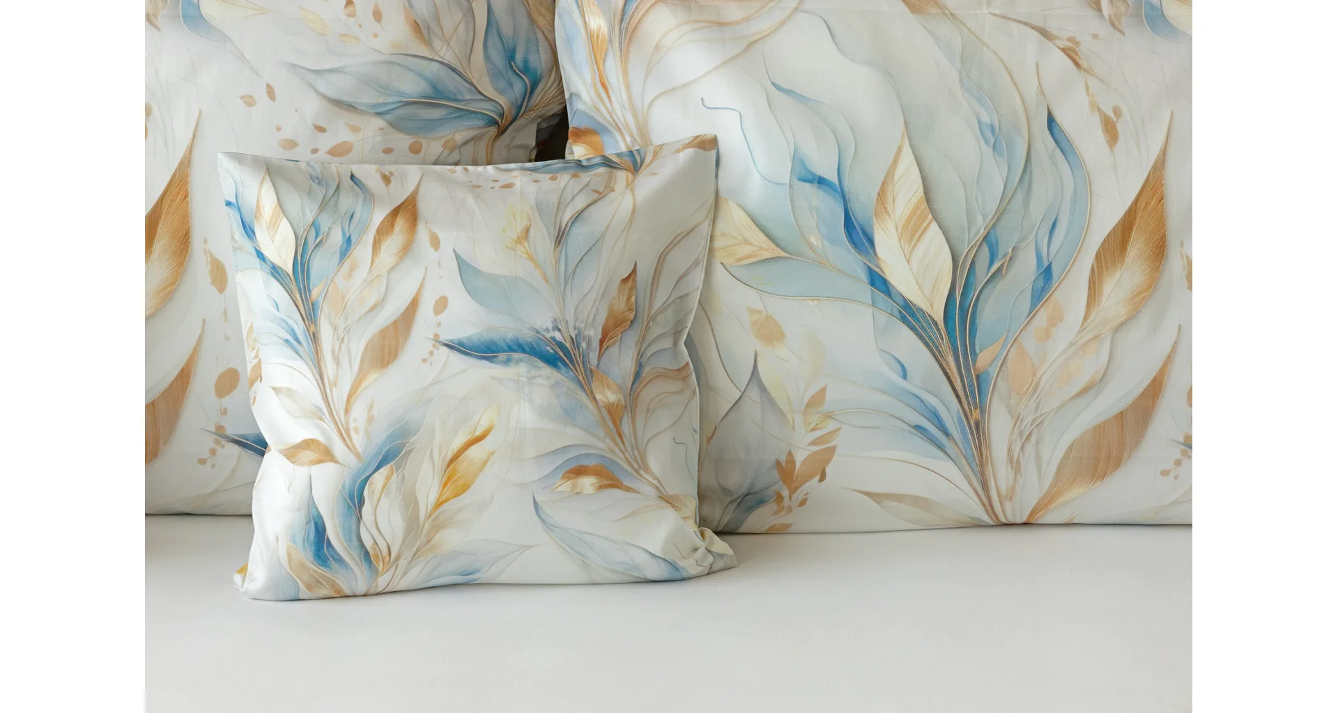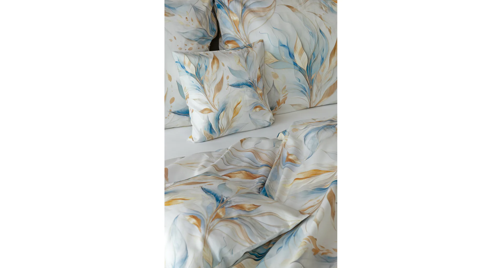 Vzor Symphony zdobí po celé ploše motiv zlatých a modrých listů na šedobílém podkladu. Povlak na polštář i na přikrývku je z obou stran stejný, povlečení je opatřeno komfortním zipovým uzávěrem.