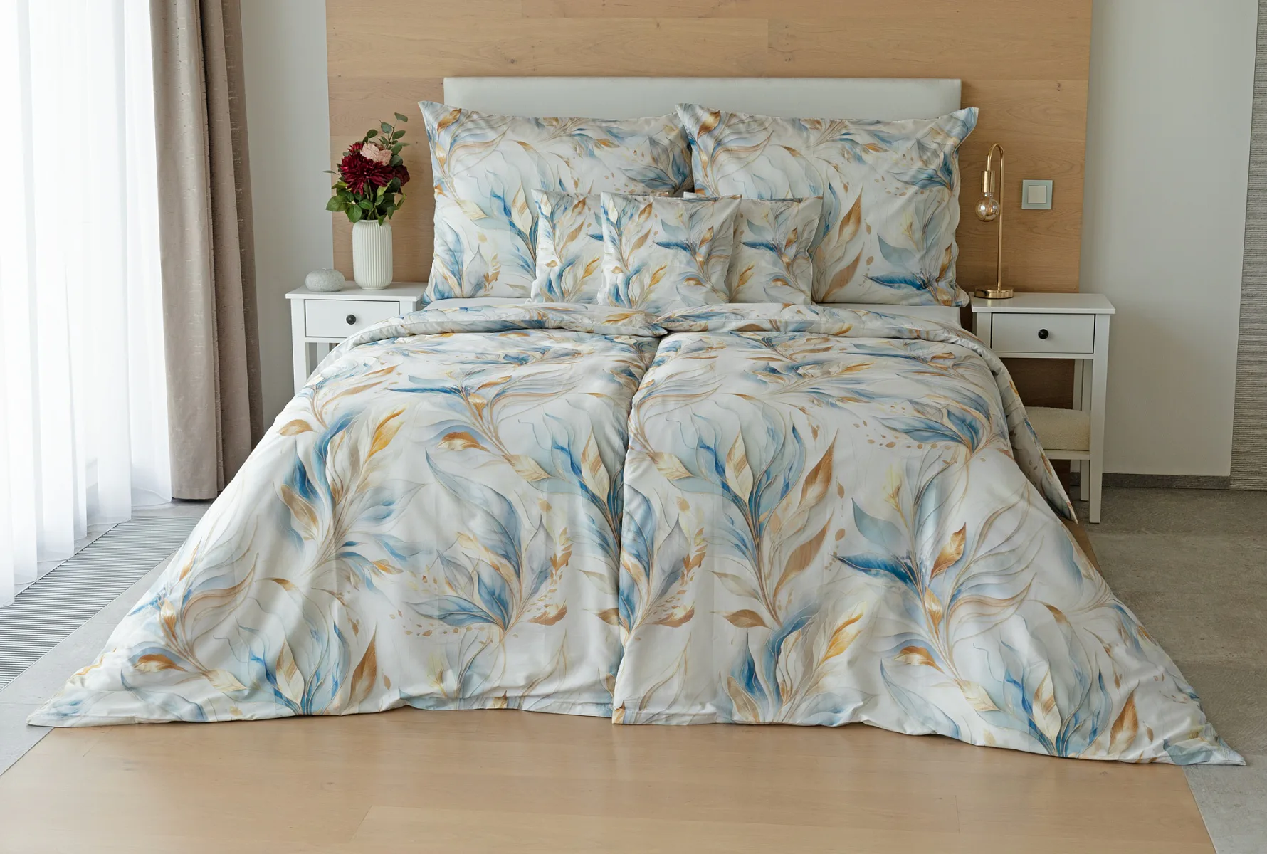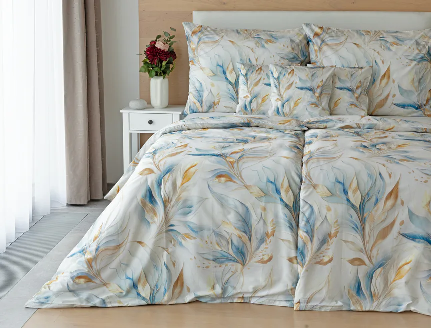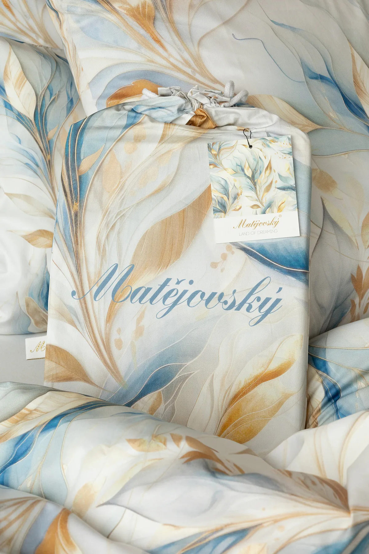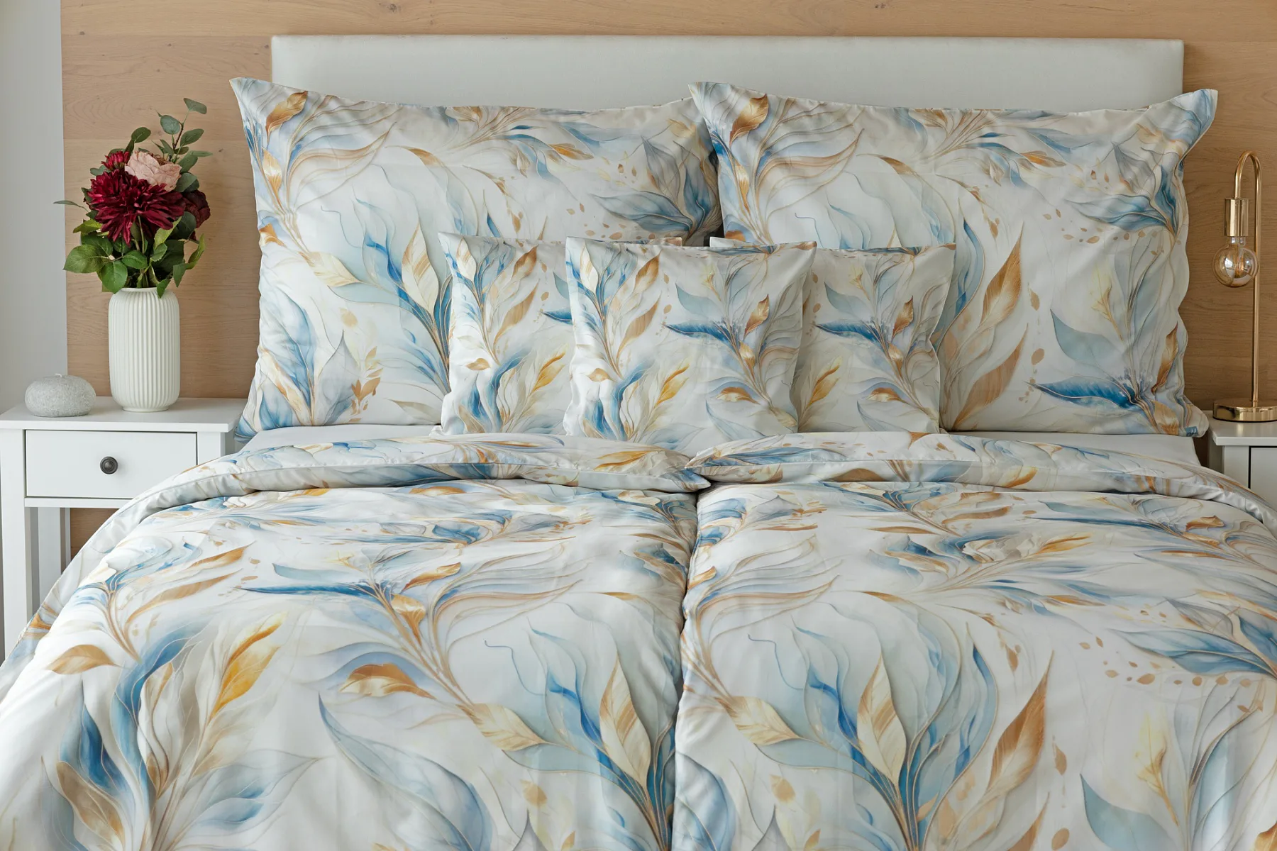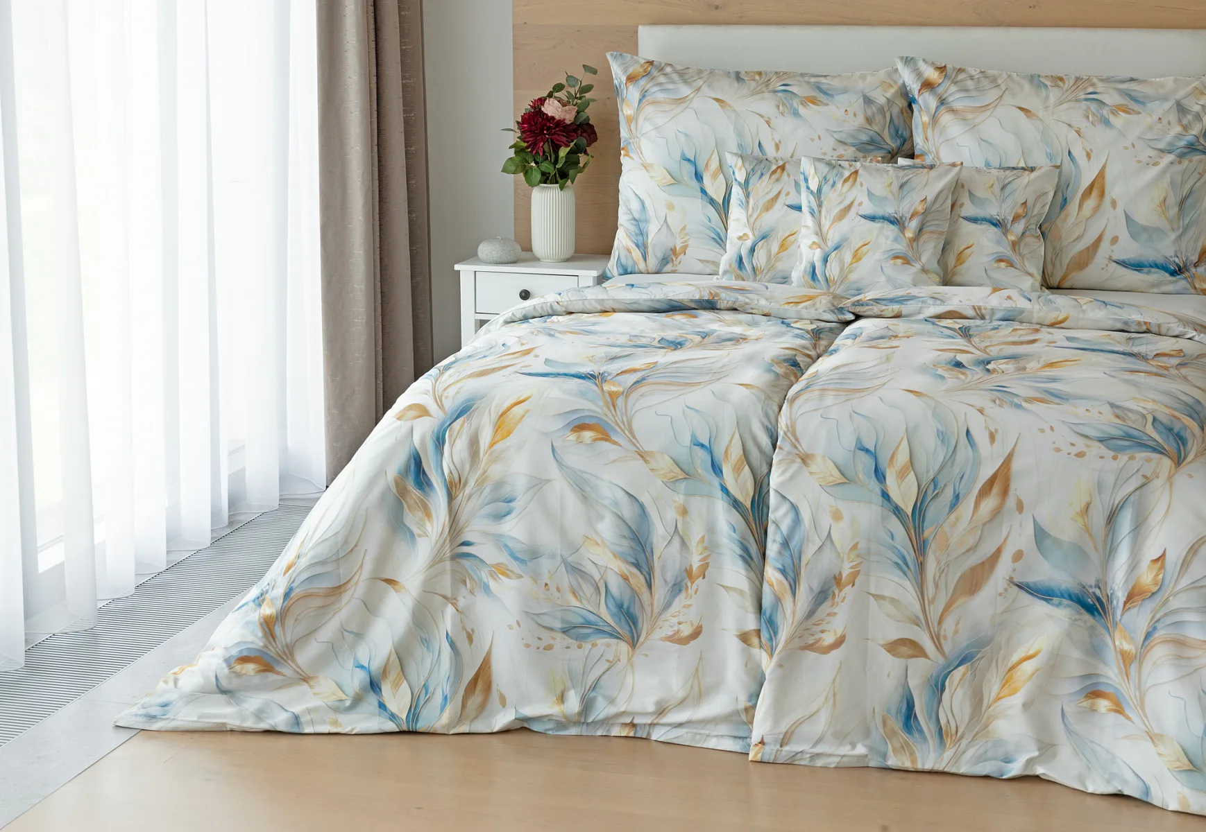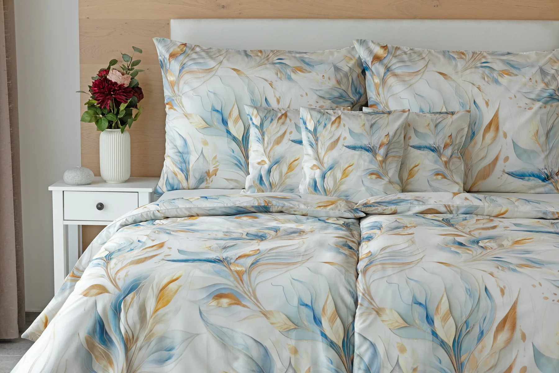 Vzor Symphony zdobí po celé ploše motiv zlatých a modrých listů na šedobílém podkladu. Povlak na polštář i na přikrývku je z obou stran stejný, povlečení je opatřeno komfortním zipovým uzávěrem.