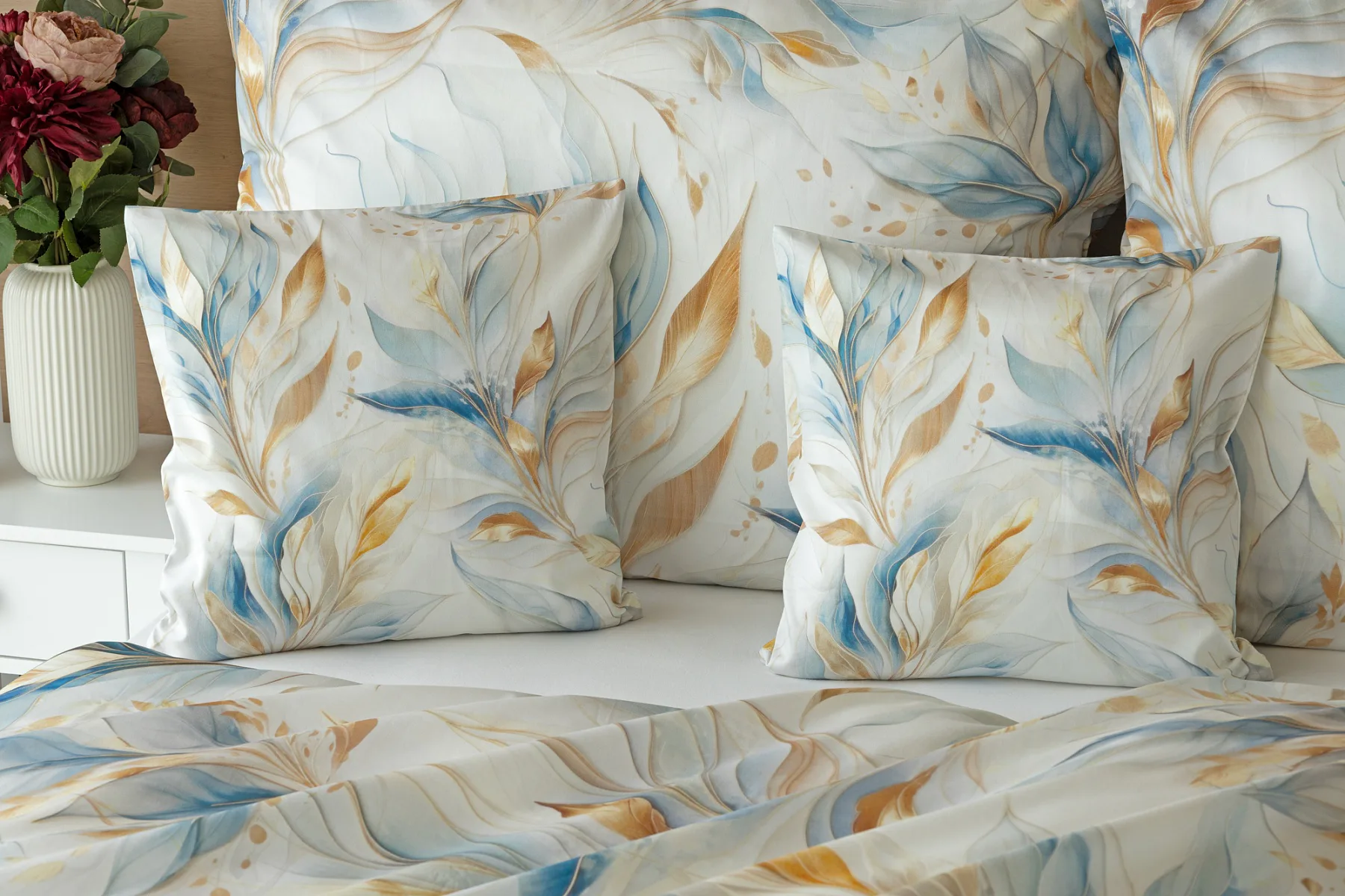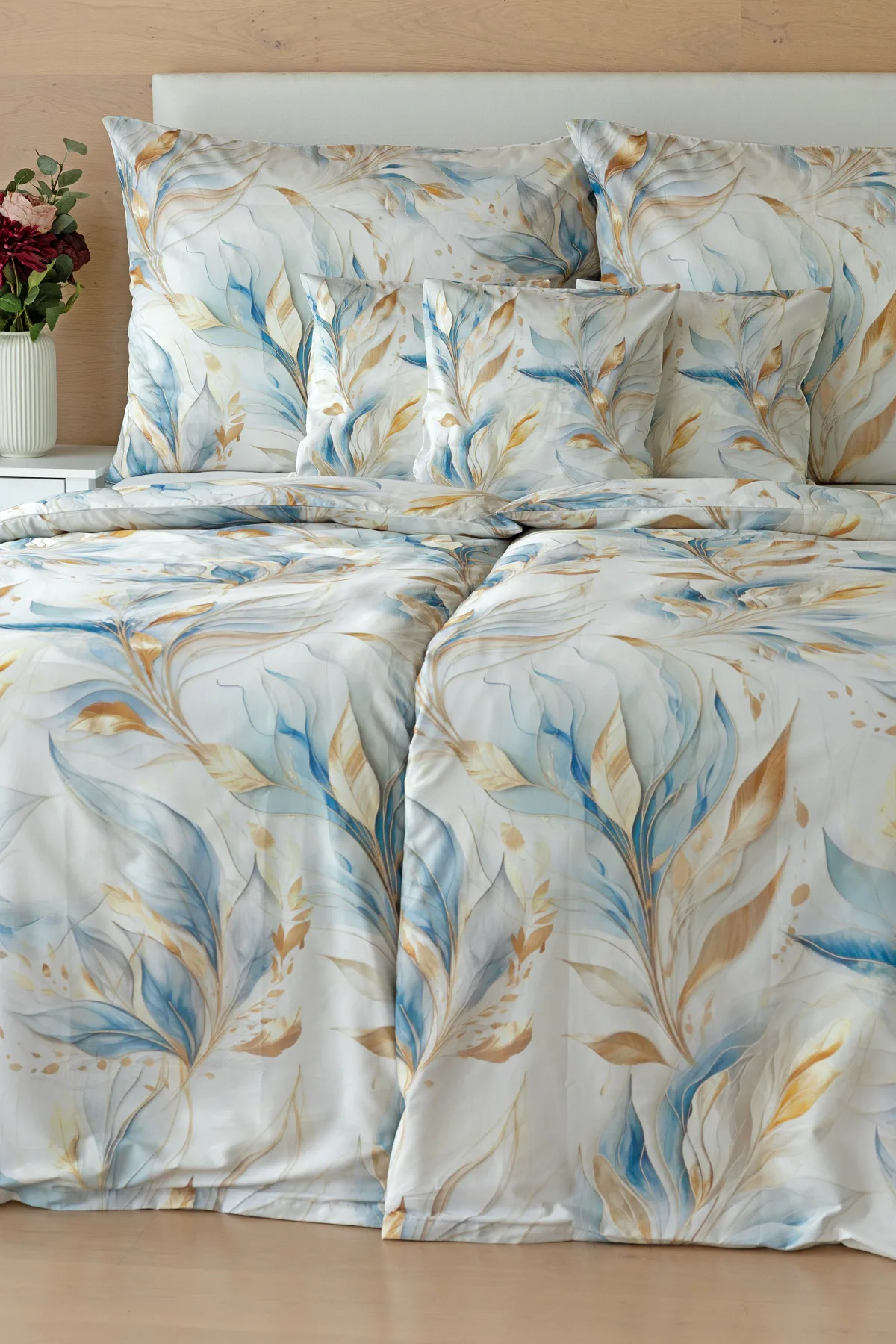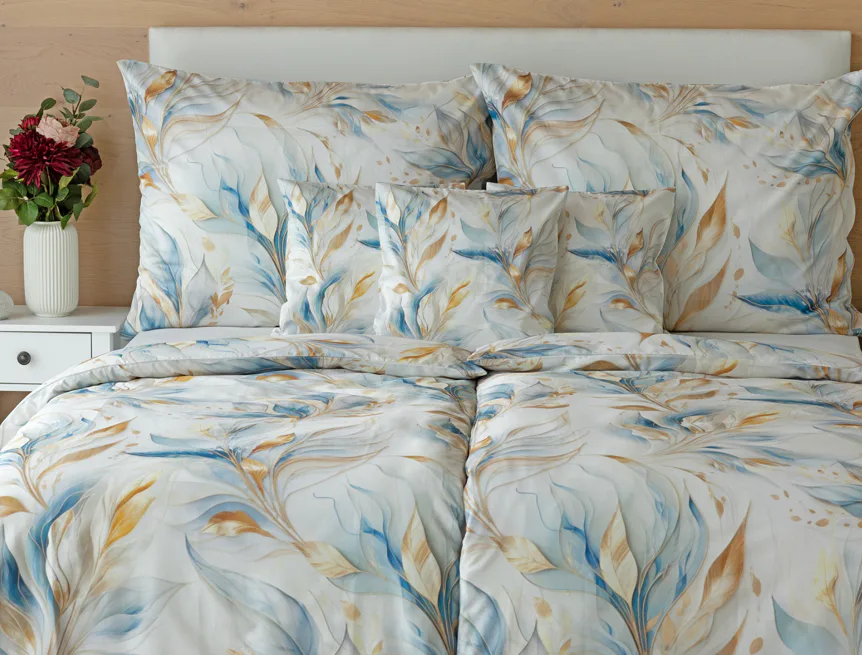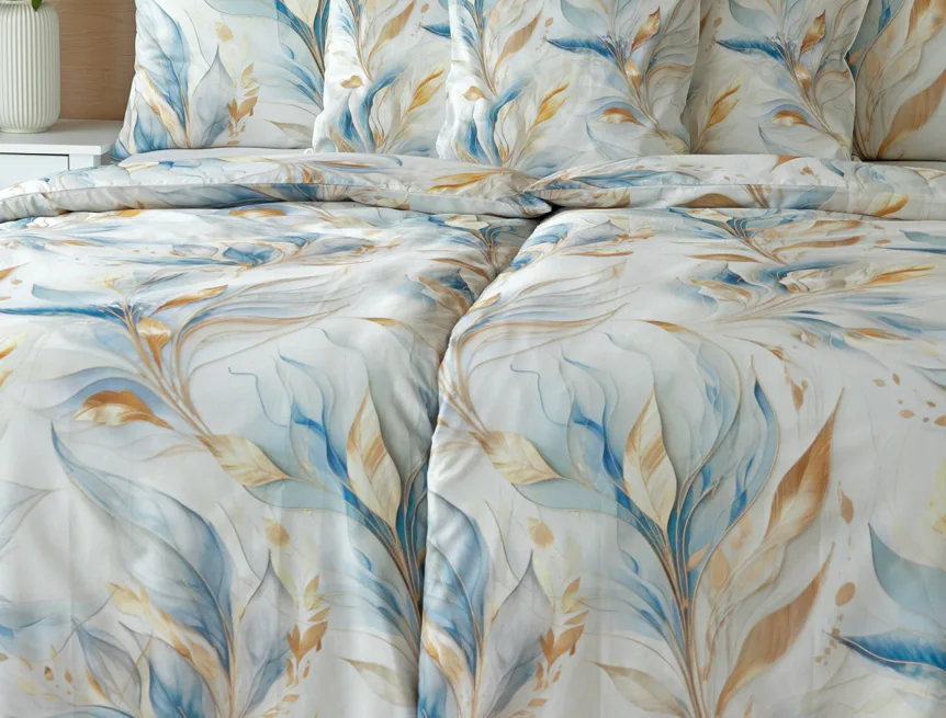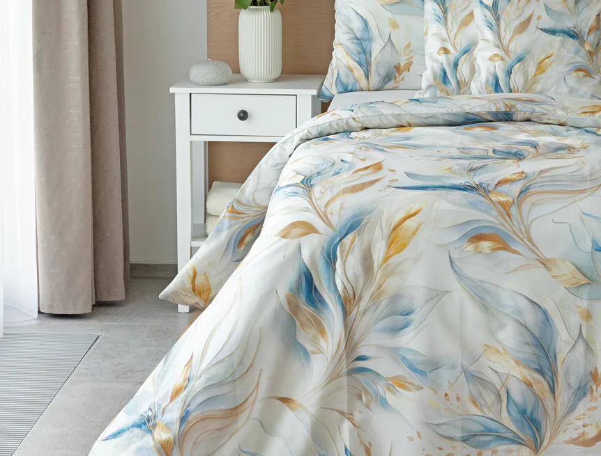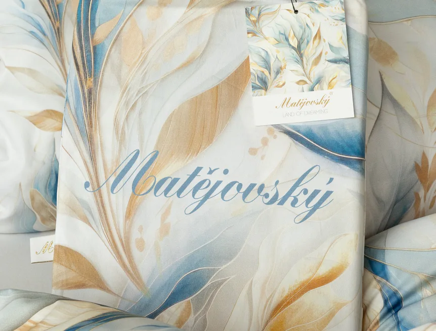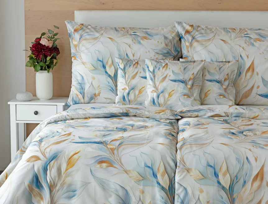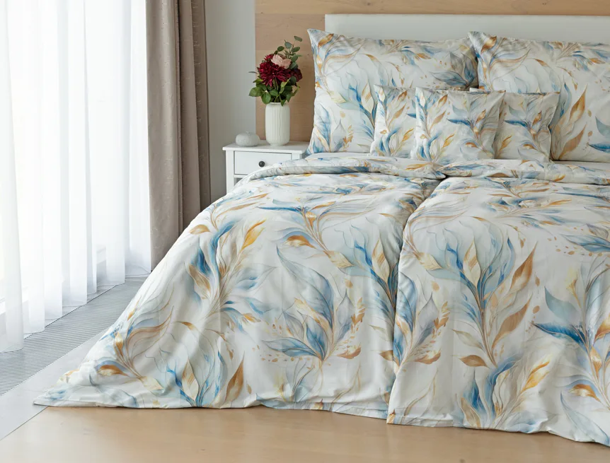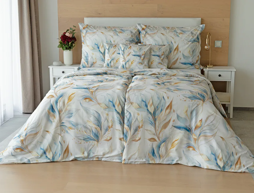 Vzor Symphony zdobí po celé ploše motiv zlatých a modrých listů na šedobílém podkladu. Povlak na polštář i na přikrývku je z obou stran stejný, povlečení je opatřeno komfortním zipovým uzávěrem.