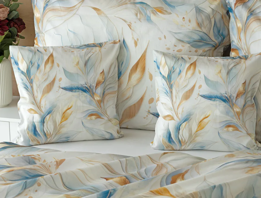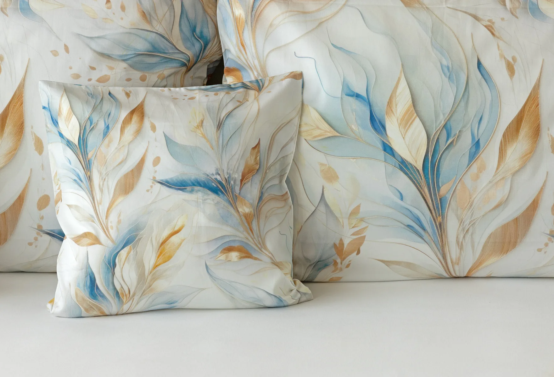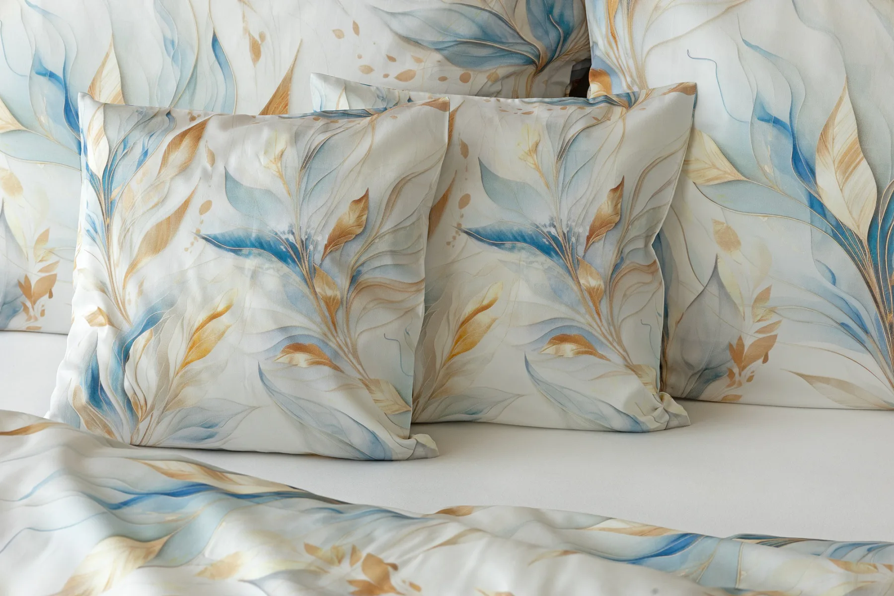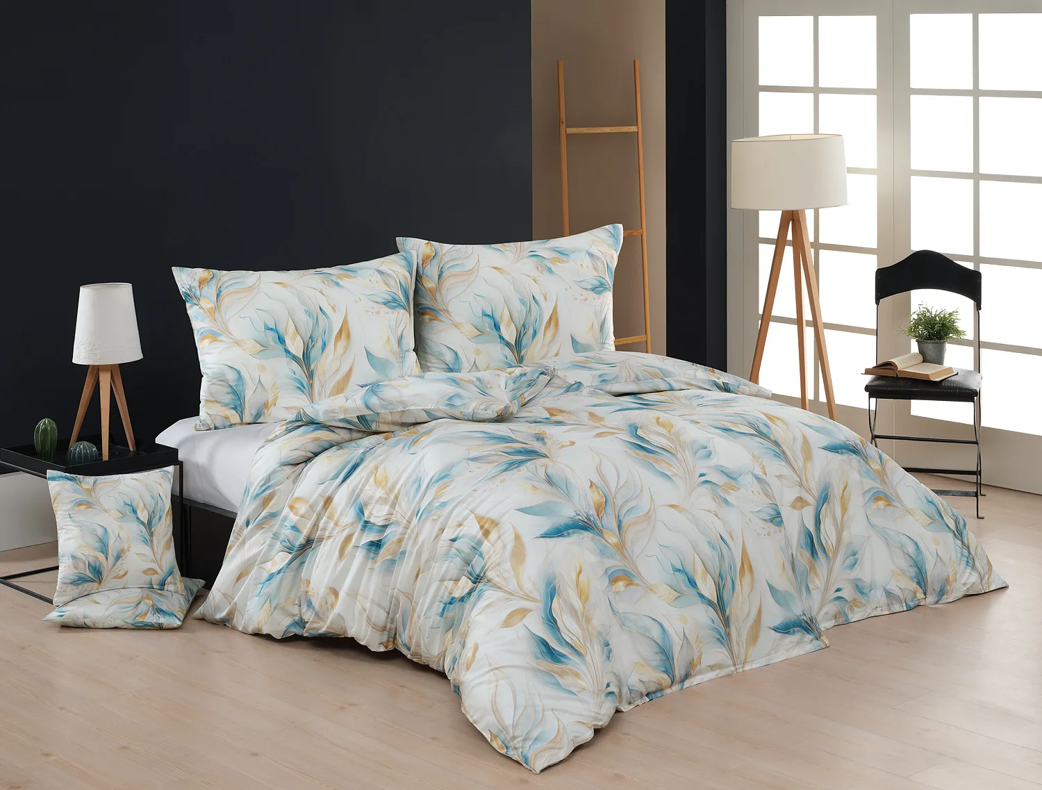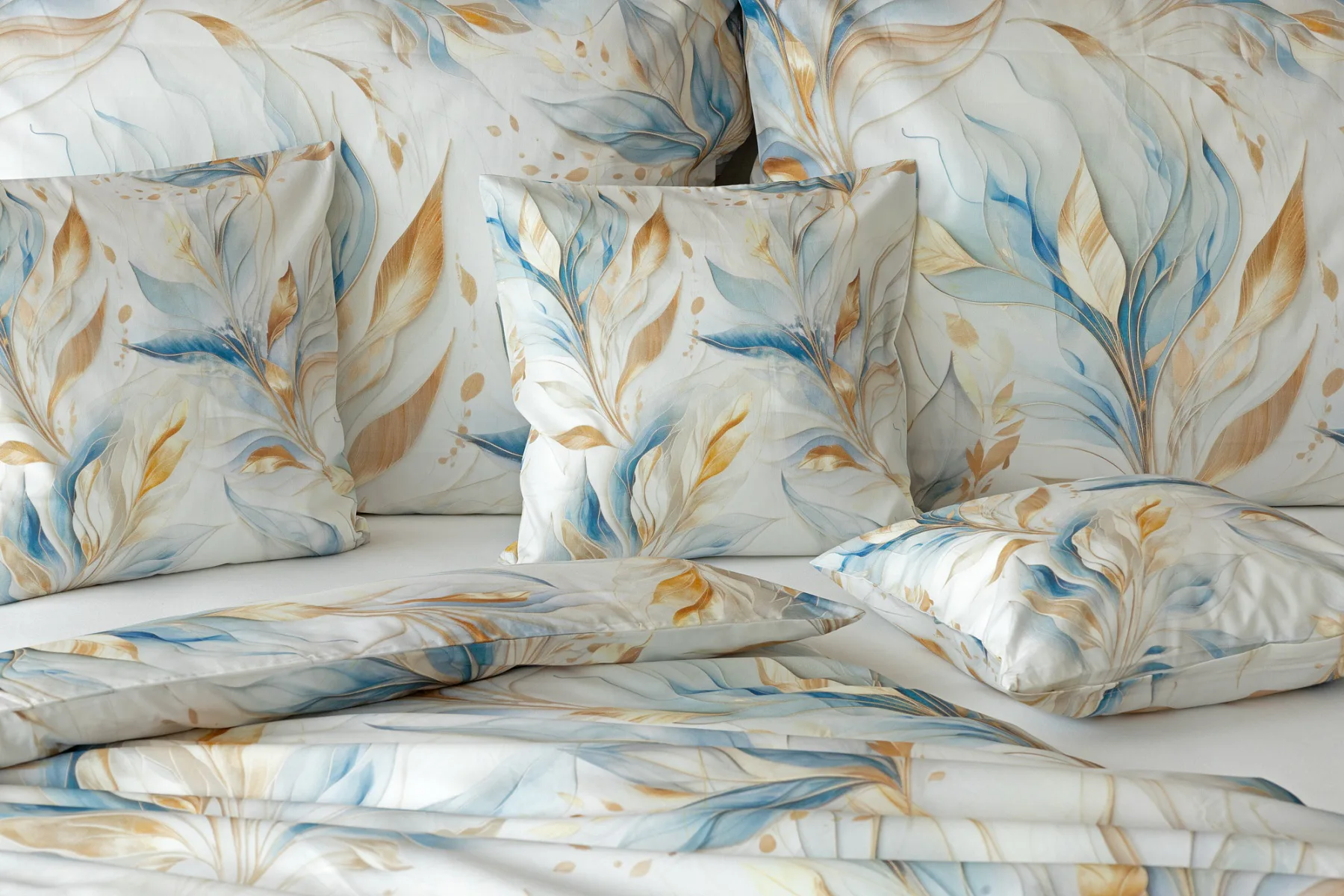 Vzor Symphony zdobí po celé ploše motiv zlatých a modrých listů na šedobílém podkladu. Povlak na polštář i na přikrývku je z obou stran stejný, povlečení je opatřeno komfortním zipovým uzávěrem.