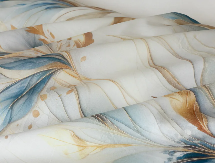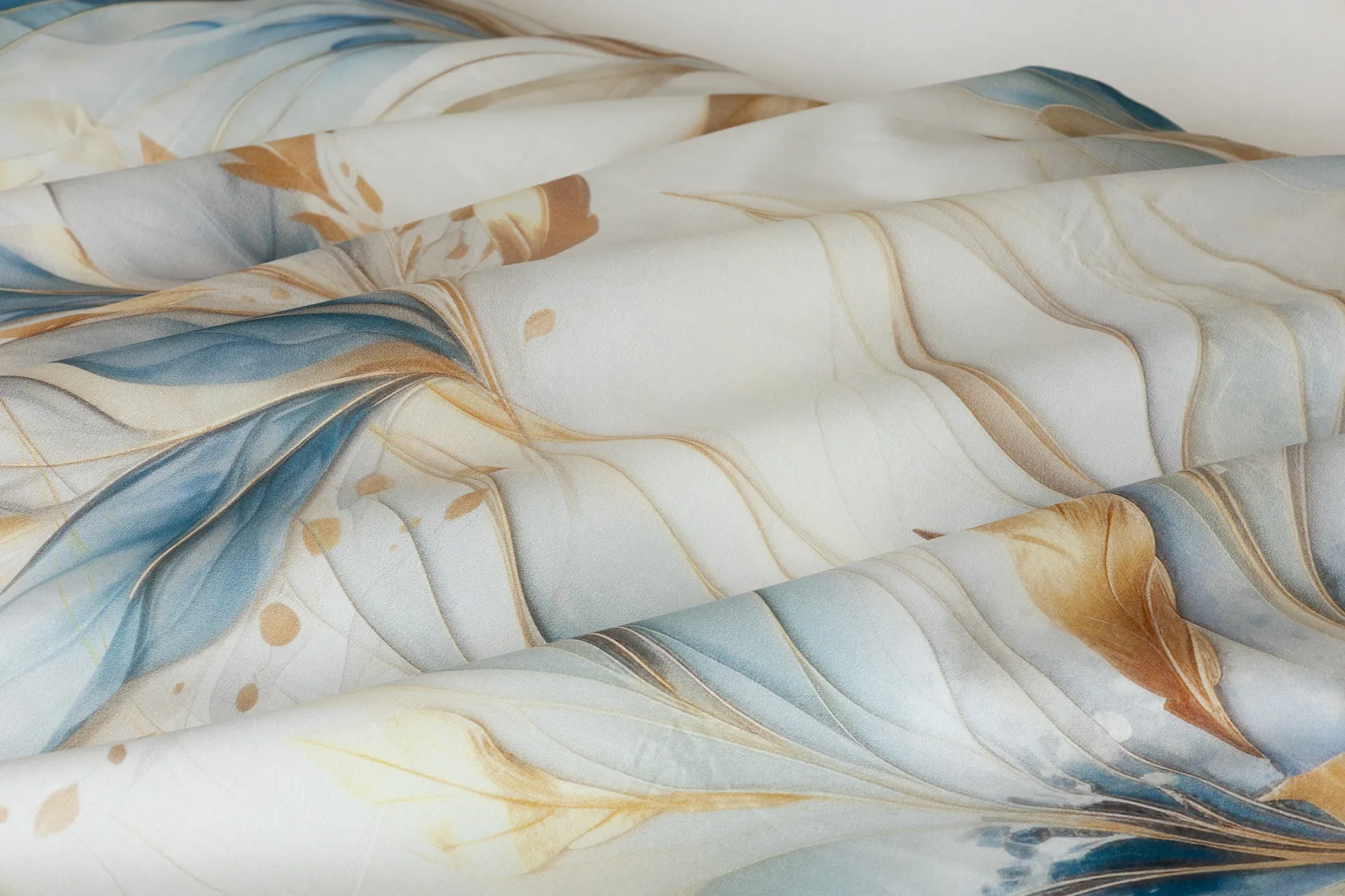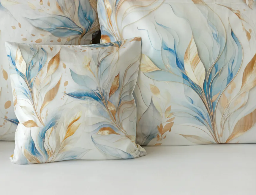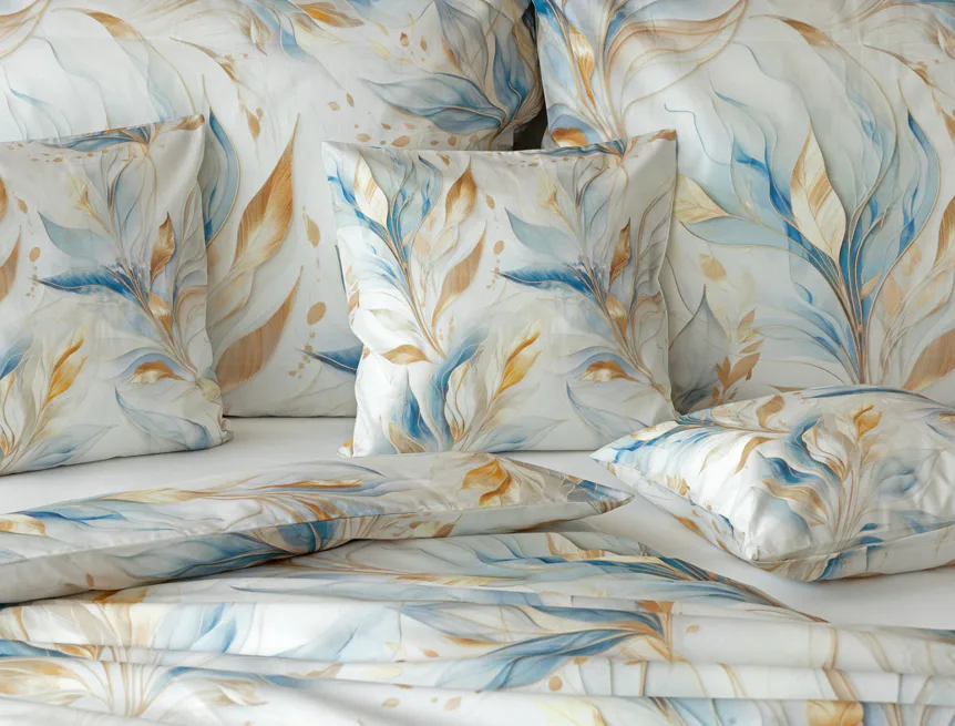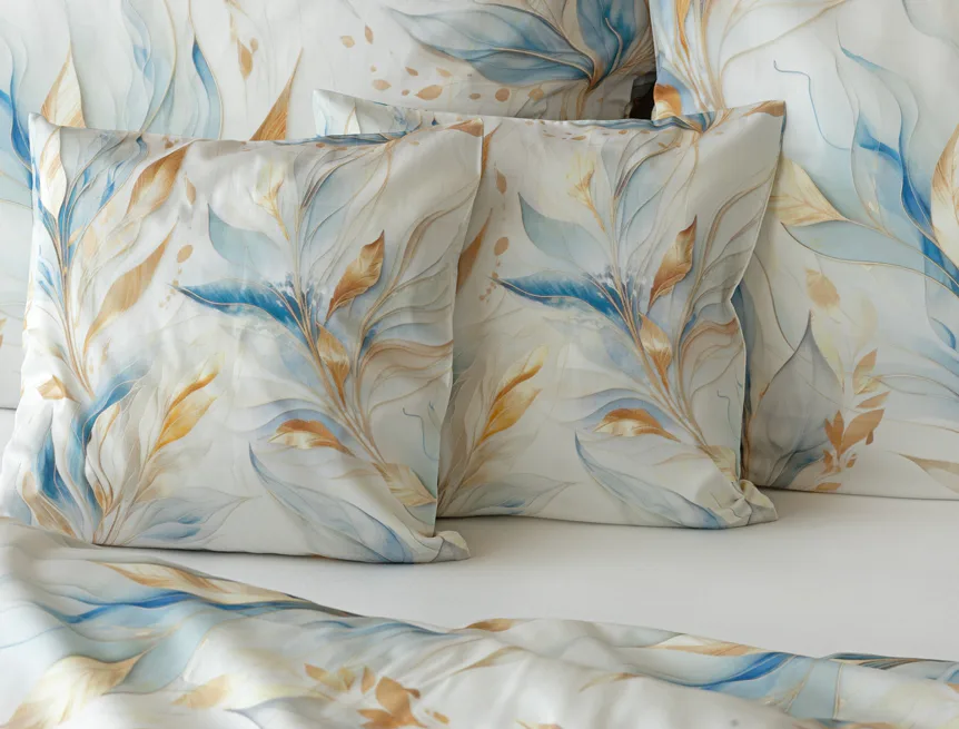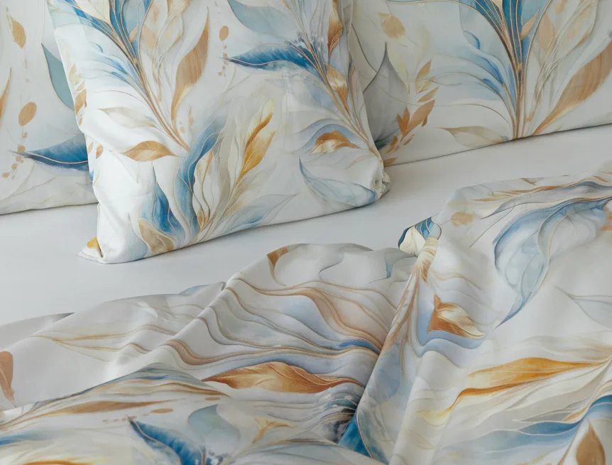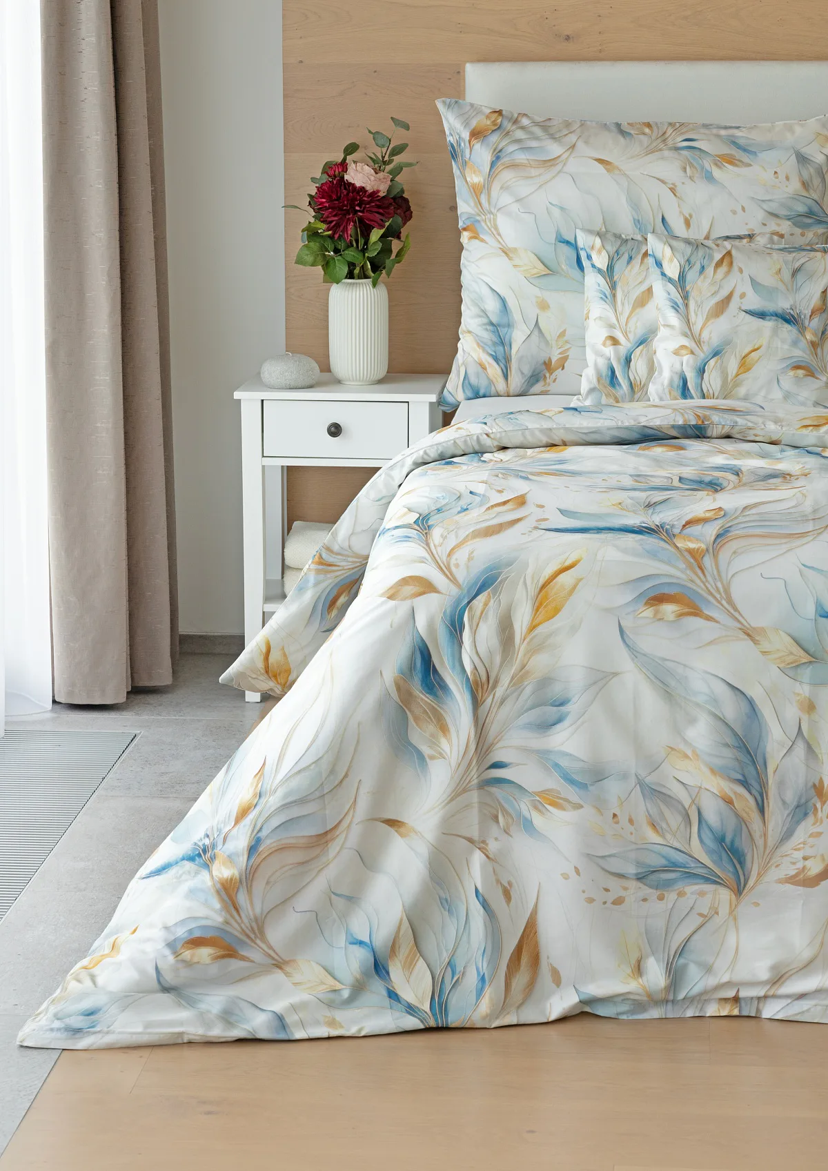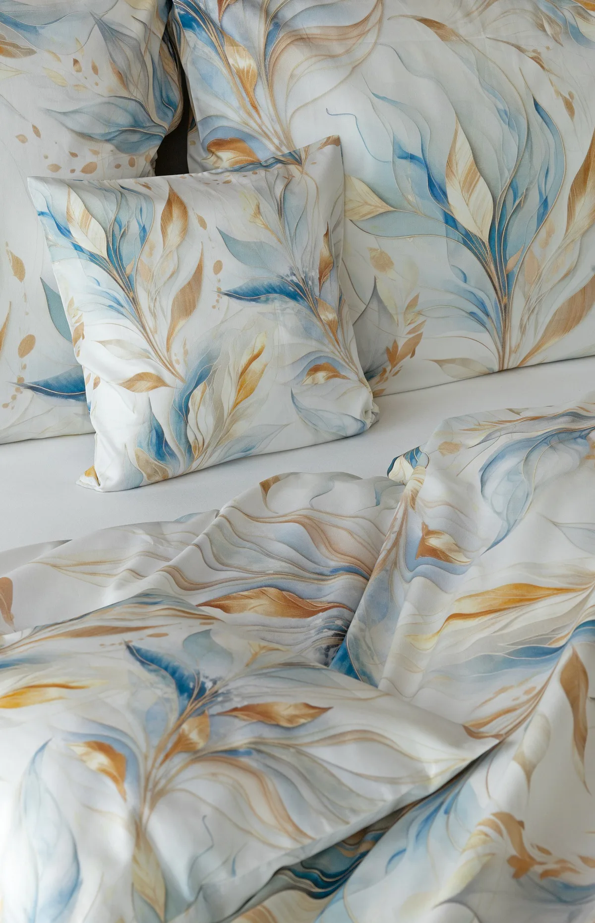 Vzor Symphony zdobí po celé ploše motiv zlatých a modrých listů na šedobílém podkladu. Povlak na polštář i na přikrývku je z obou stran stejný, povlečení je opatřeno komfortním zipovým uzávěrem.