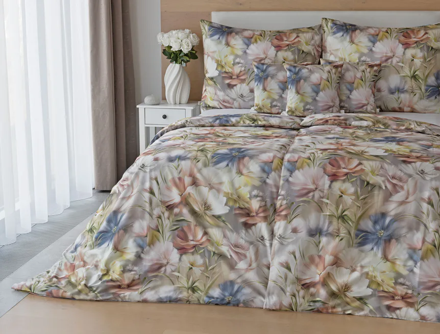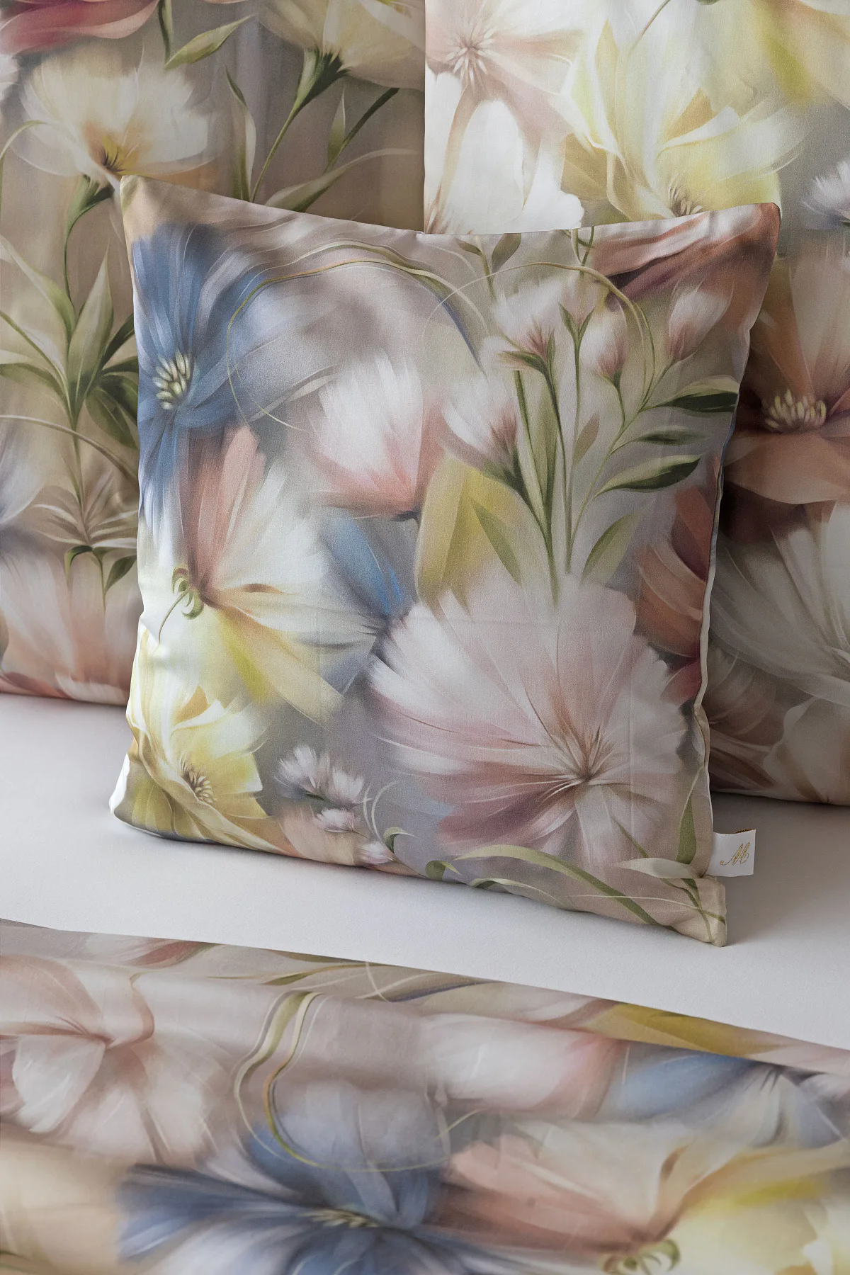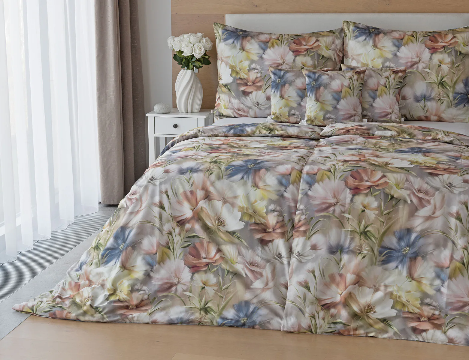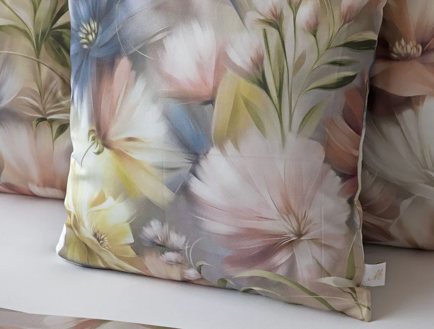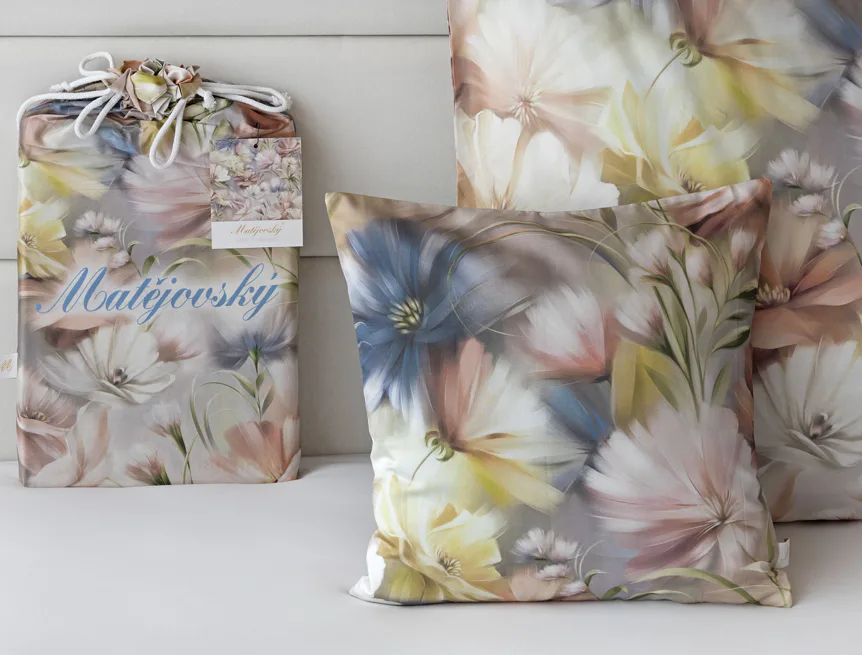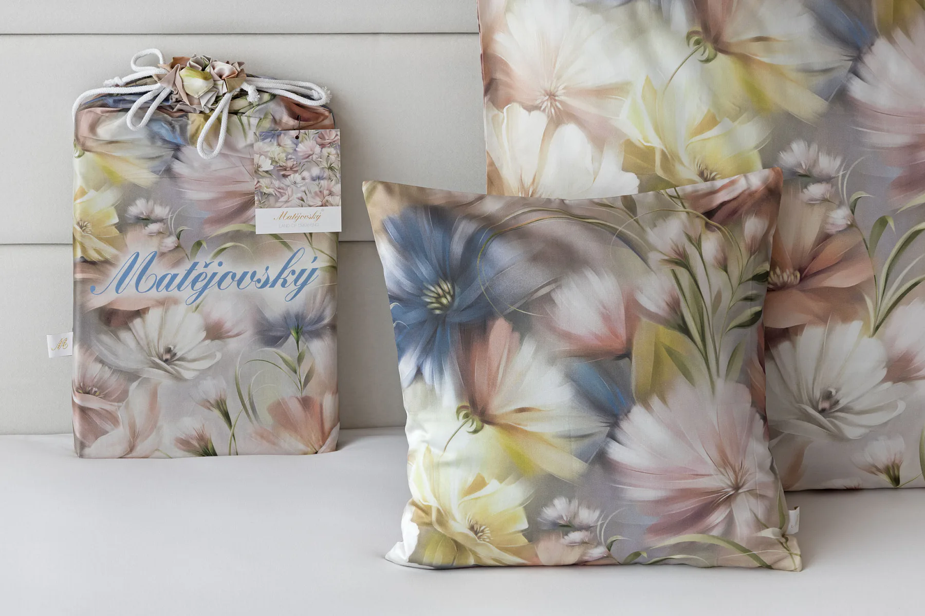 Tento romantický florální vzor přináší bohatou kompozici pestrých květů, které díky jemným barevným přechodům přirozeně splývají s podkladem a vytvářejí tak harmonický celek. Kombinace bílých, pudrových a modrých tónů působí svěže, vzdušně a velmi elegantně. Povlak na polštář i na přikrývku je z obou stran stejný, vrchní stranu povlaku na polštář zdobí malé logo "M" v pravém dolním rohu. Povlečení je opatřeno komfortním zipovým uzávěrem