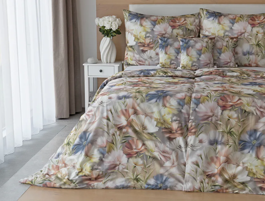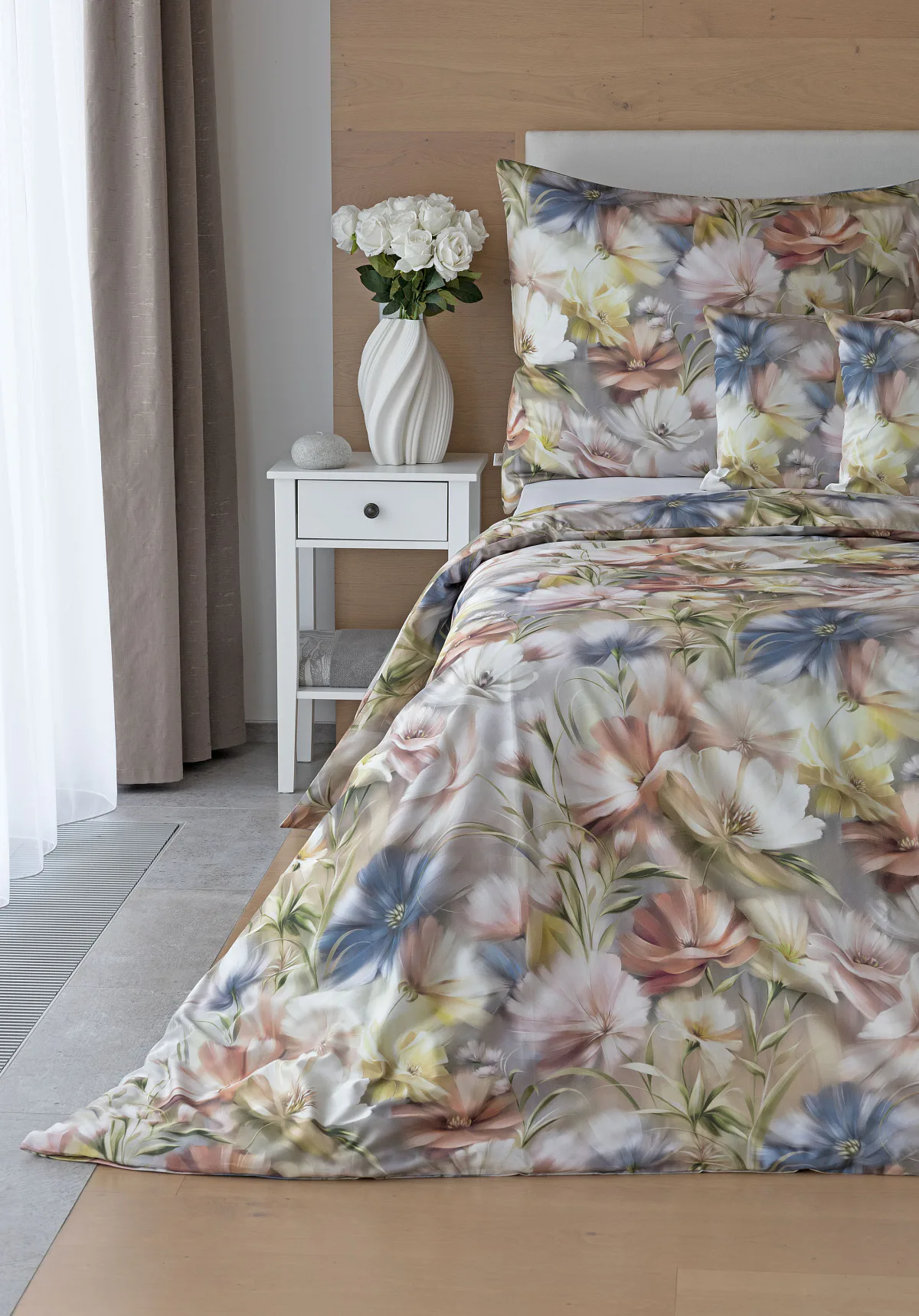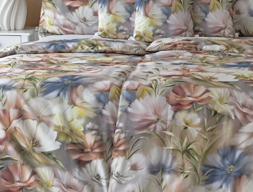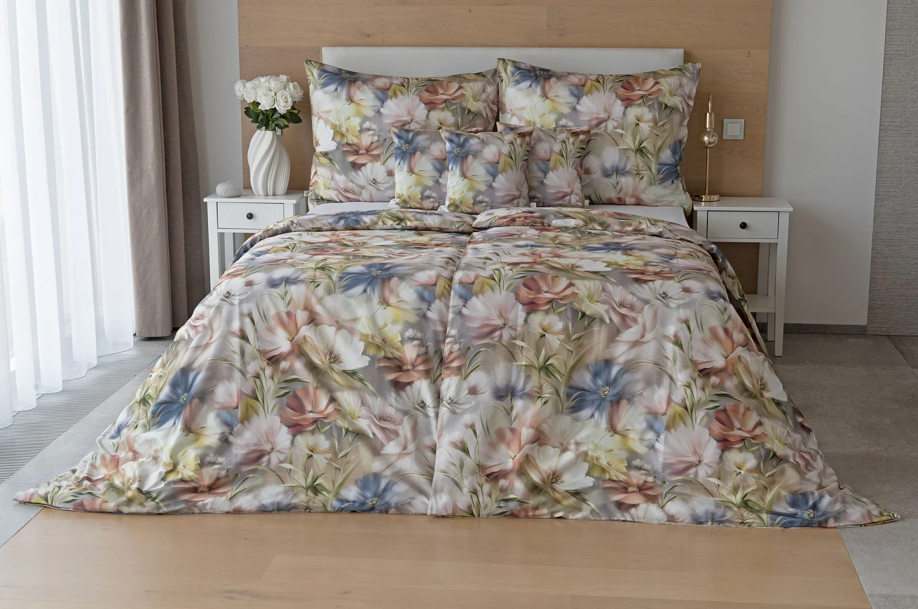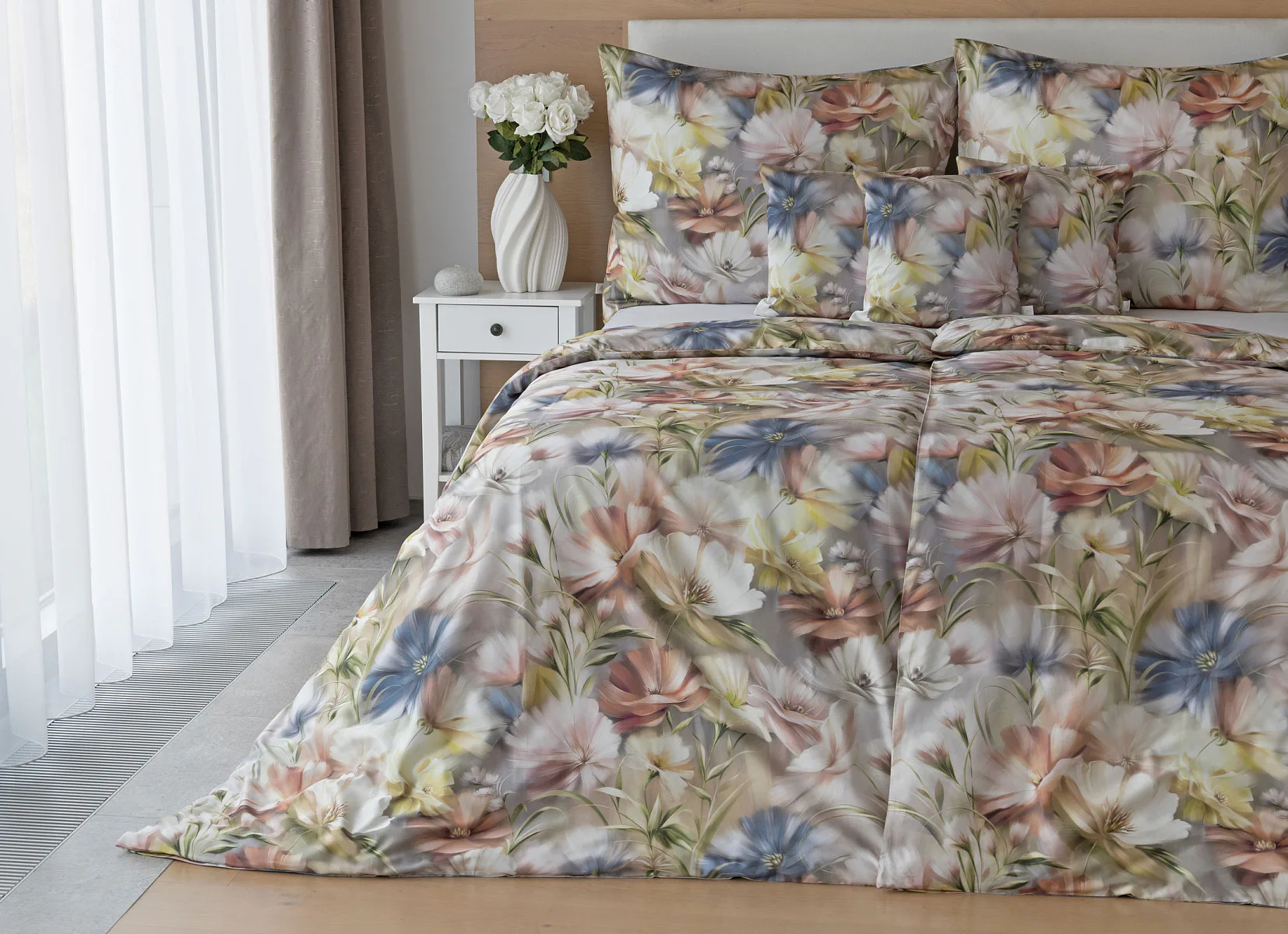 Tento romantický florální vzor přináší bohatou kompozici pestrých květů, které díky jemným barevným přechodům přirozeně splývají s podkladem a vytvářejí tak harmonický celek. Kombinace bílých, pudrových a modrých tónů působí svěže, vzdušně a velmi elegantně. Povlak na polštář i na přikrývku je z obou stran stejný, vrchní stranu povlaku na polštář zdobí malé logo "M" v pravém dolním rohu. Povlečení je opatřeno komfortním zipovým uzávěrem