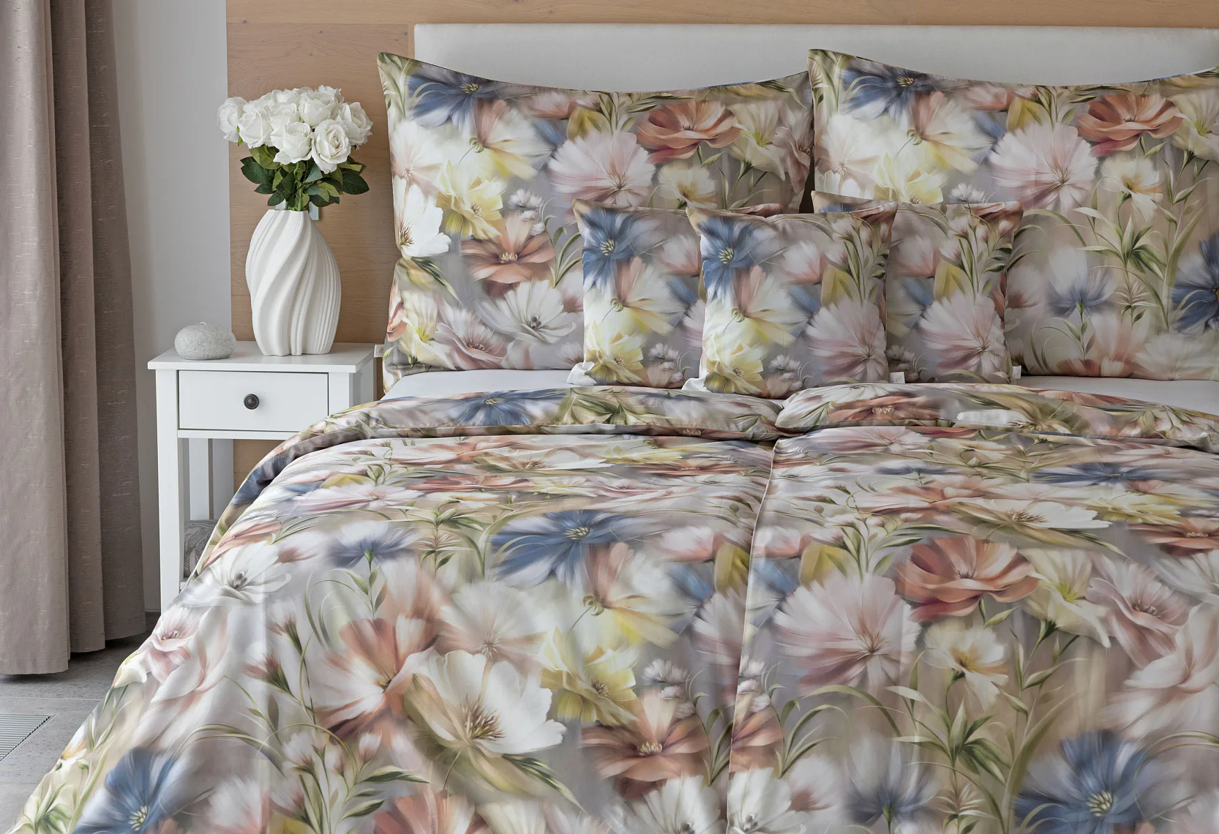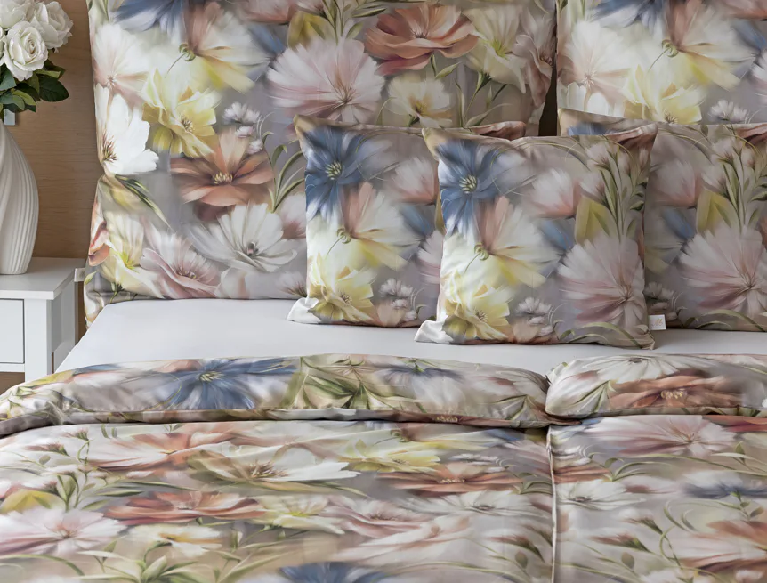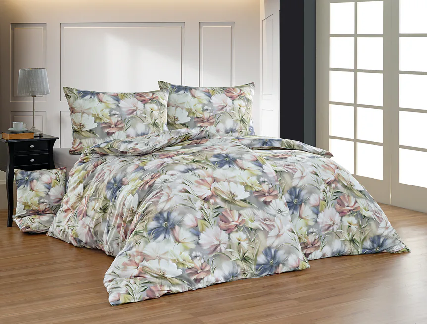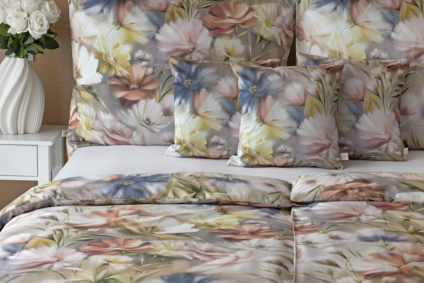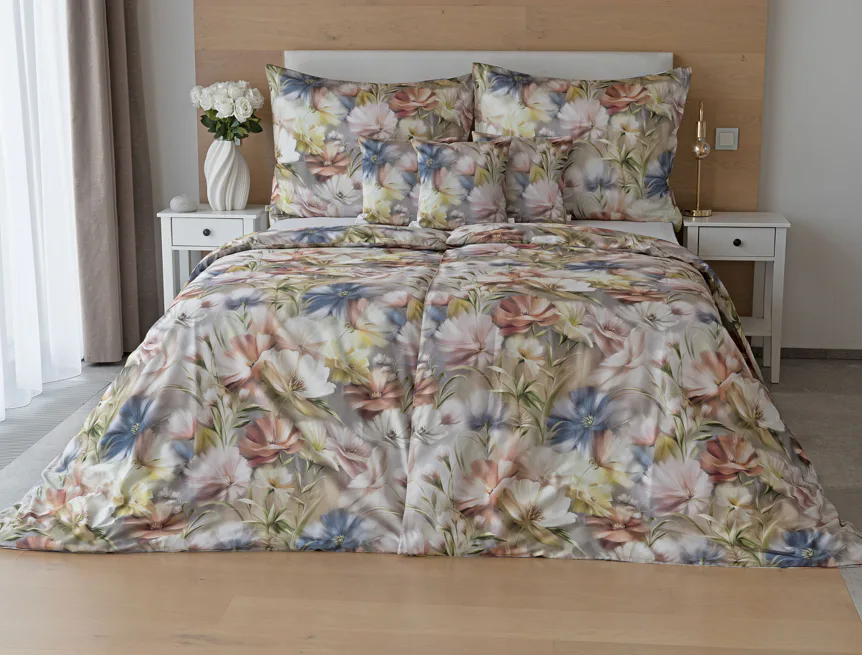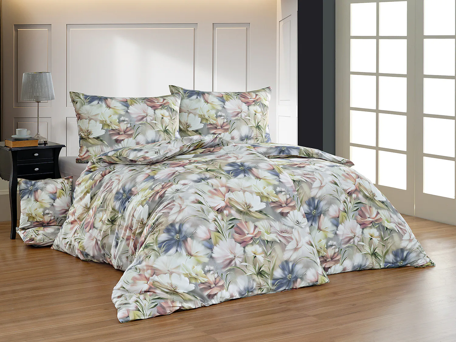 Tento romantický florální vzor přináší bohatou kompozici pestrých květů, které díky jemným barevným přechodům přirozeně splývají s podkladem a vytvářejí tak harmonický celek. Kombinace bílých, pudrových a modrých tónů působí svěže, vzdušně a velmi elegantně. Povlak na polštář i na přikrývku je z obou stran stejný, vrchní stranu povlaku na polštář zdobí malé logo "M" v pravém dolním rohu. Povlečení je opatřeno komfortním zipovým uzávěrem