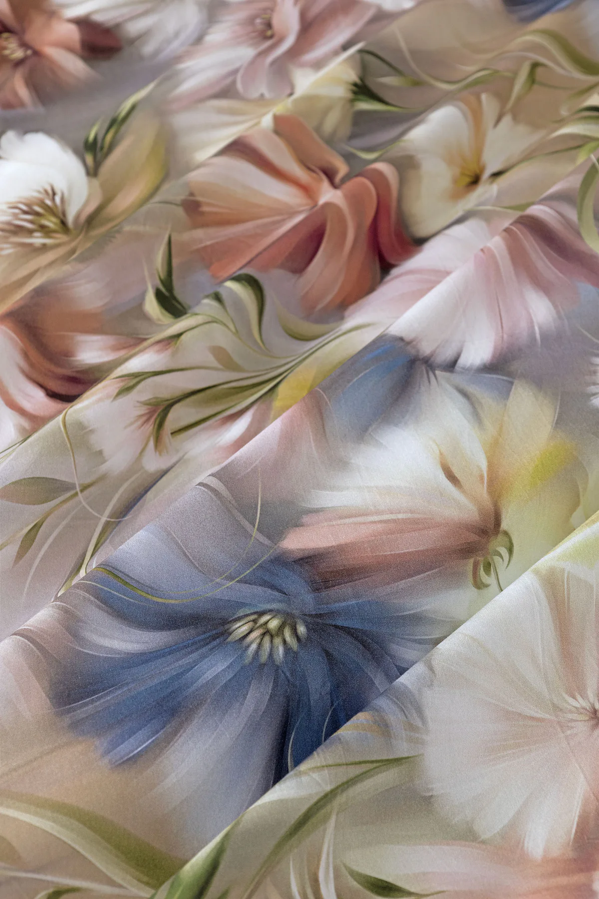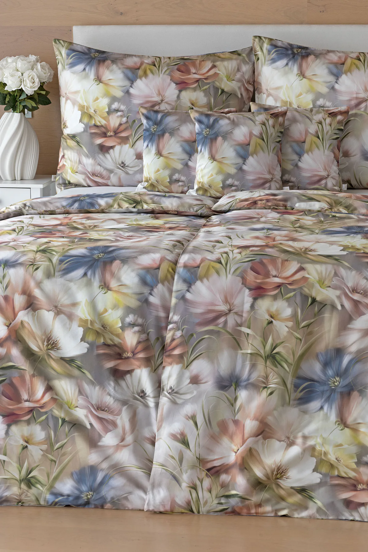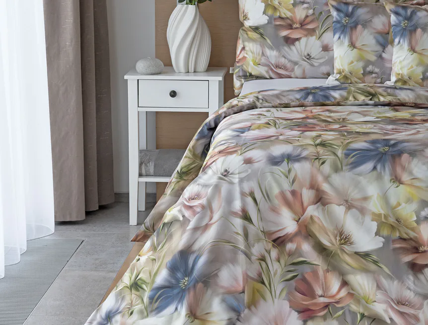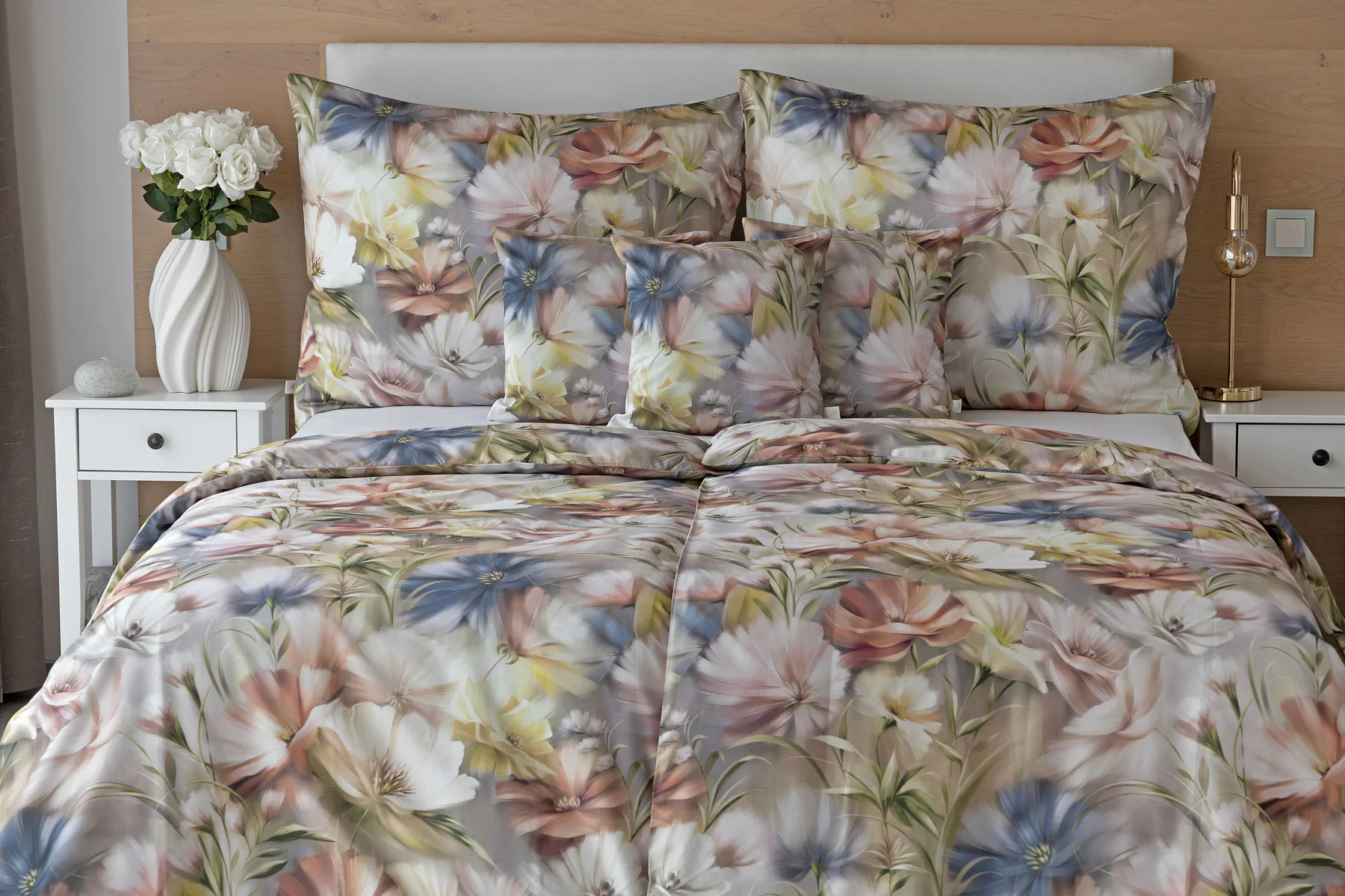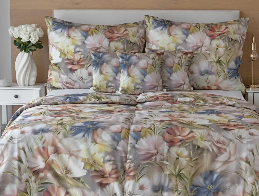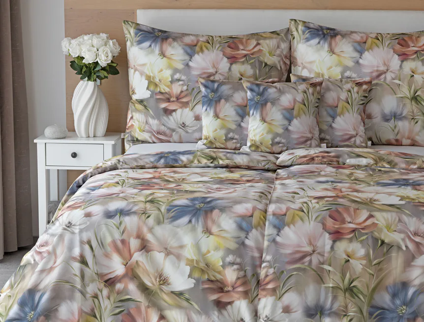 Tento romantický florální vzor přináší bohatou kompozici pestrých květů, které díky jemným barevným přechodům přirozeně splývají s podkladem a vytvářejí tak harmonický celek. Kombinace bílých, pudrových a modrých tónů působí svěže, vzdušně a velmi elegantně. Povlak na polštář i na přikrývku je z obou stran stejný, vrchní stranu povlaku na polštář zdobí malé logo "M" v pravém dolním rohu. Povlečení je opatřeno komfortním zipovým uzávěrem