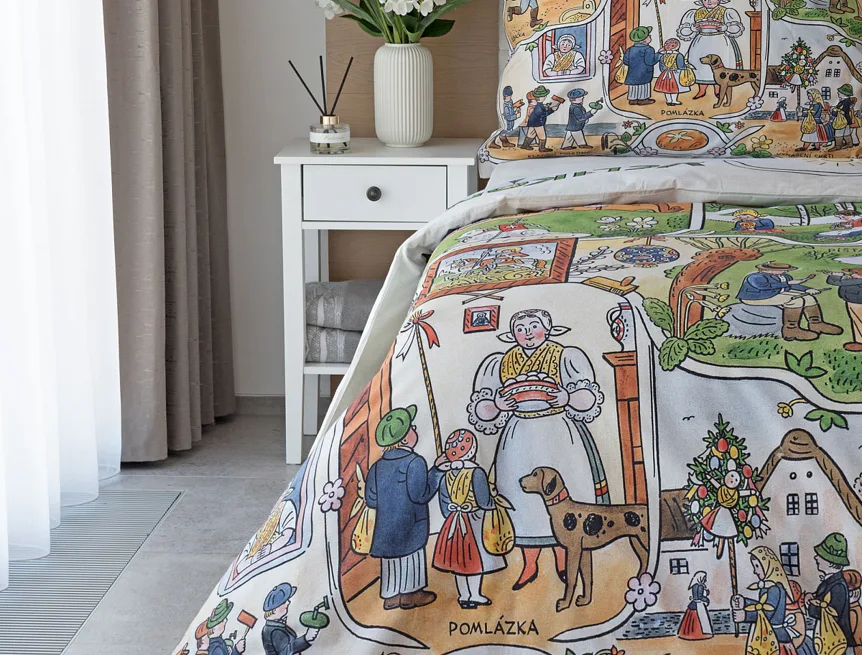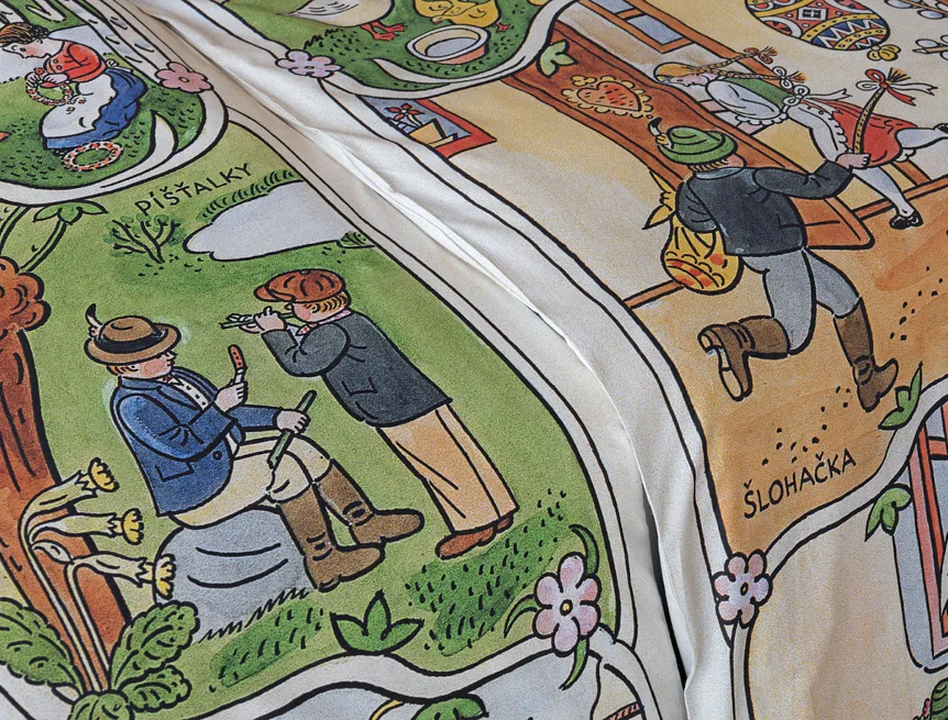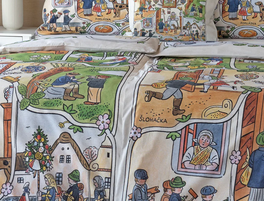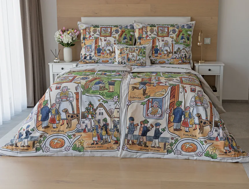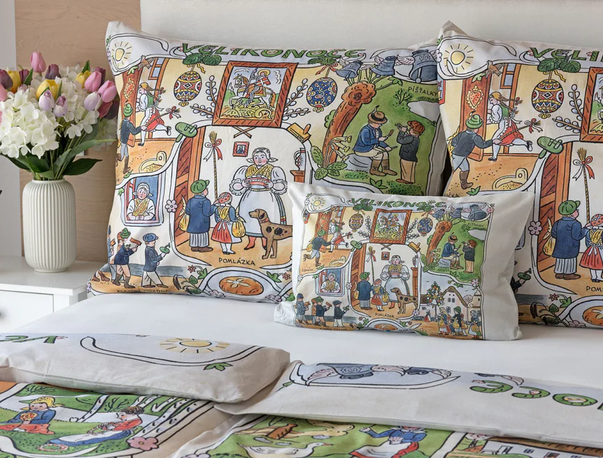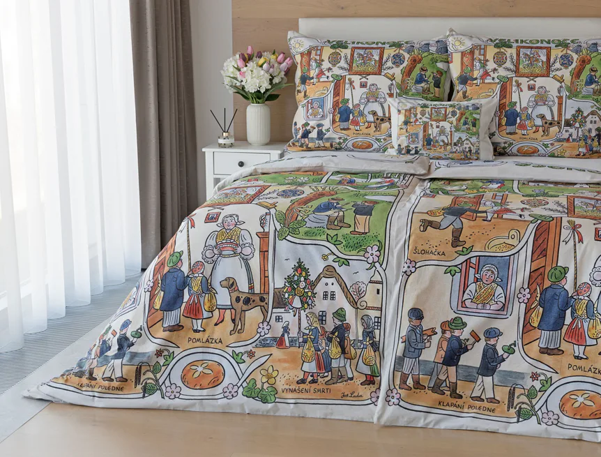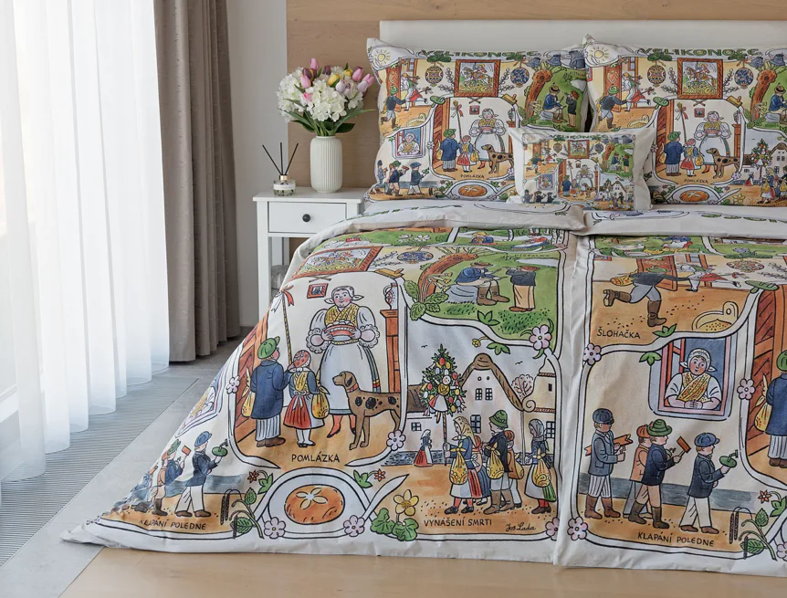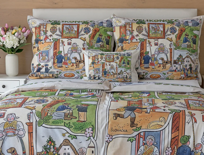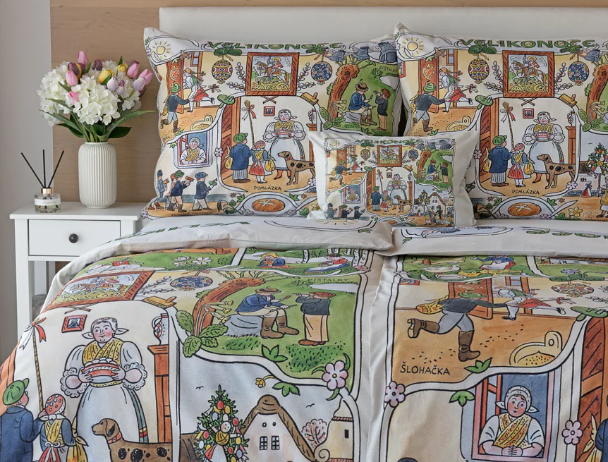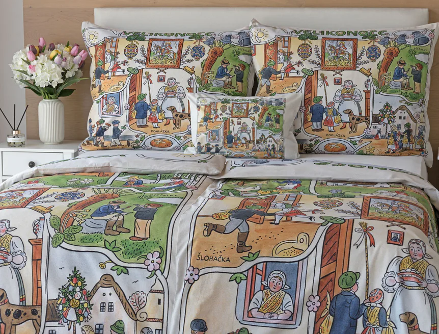 Velikonoční tradice připomínají oblíbené kresby Josefa Lady, které v mnohých z nás probouzejí vzpomínky na bezstarostné dětství. Přivítejte svátky jara stylově a vykouzlete si sváteční atmosféru i u sebe doma díky bavlněnému povlečení Velikonoce. Díky atraktivní paletě přírodních tónů a nestárnoucím tradičním motivům bude povlečení ozdobou každé ložnice.