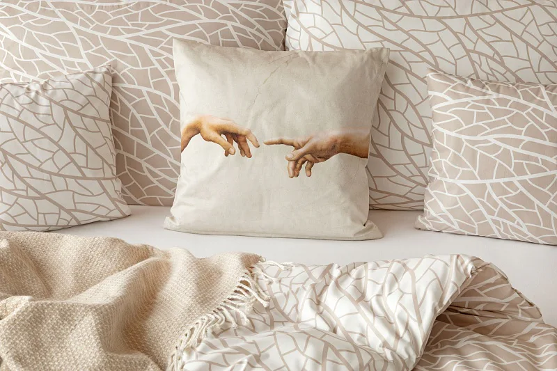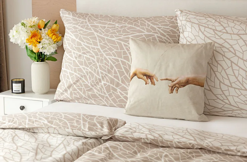 Povlaky na polštářky 40/40 cm se šijí ze stejné látky jako ložní povlečení, vzhledem k rozmanitosti vzoru může být každý povláček jiný.